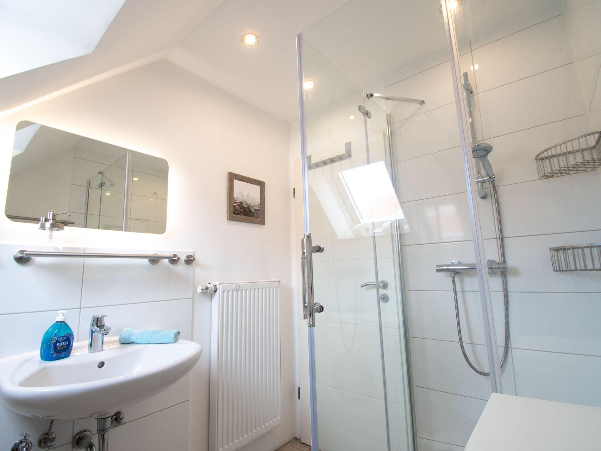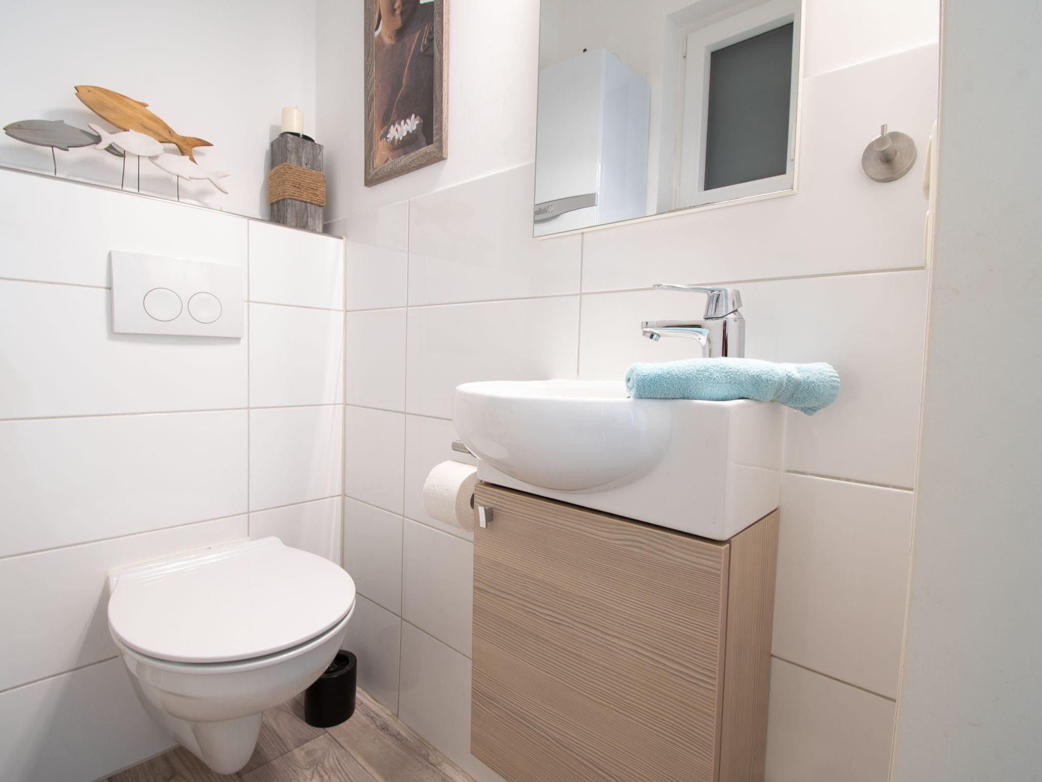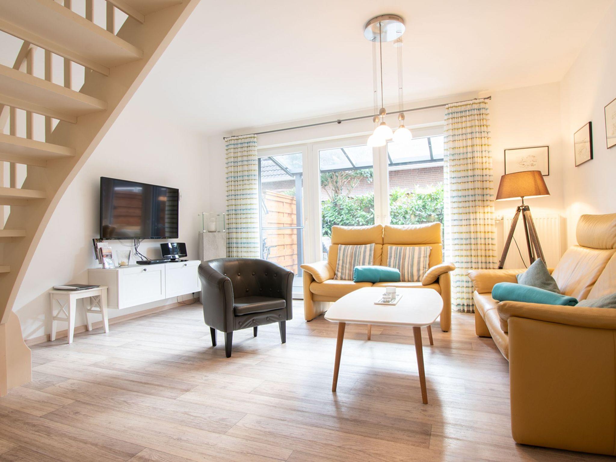 Im Dielenbereich befindet sich das Gäste-WC. Die gemütlich eingerichtete Küche im Wohnbereich bietet genügend Platz zum Klönen und Kochen und hat alles, um den Urlaub genießen zu können. Vom geräumigen Wohnzimmer haben Sie die Möglichkeit, auf der sichtgeschützten möblierten Terrasse zu entspannen. Im 1. Obergeschoss befindet sich ein Schlafzimmer mit Doppelbett und zusätzlichem Fernseher, ein modern renoviertes Tageslichtbad mit Waschmaschine sowie ein zweites Schlafzimmer mit zwei Einzelbetten.