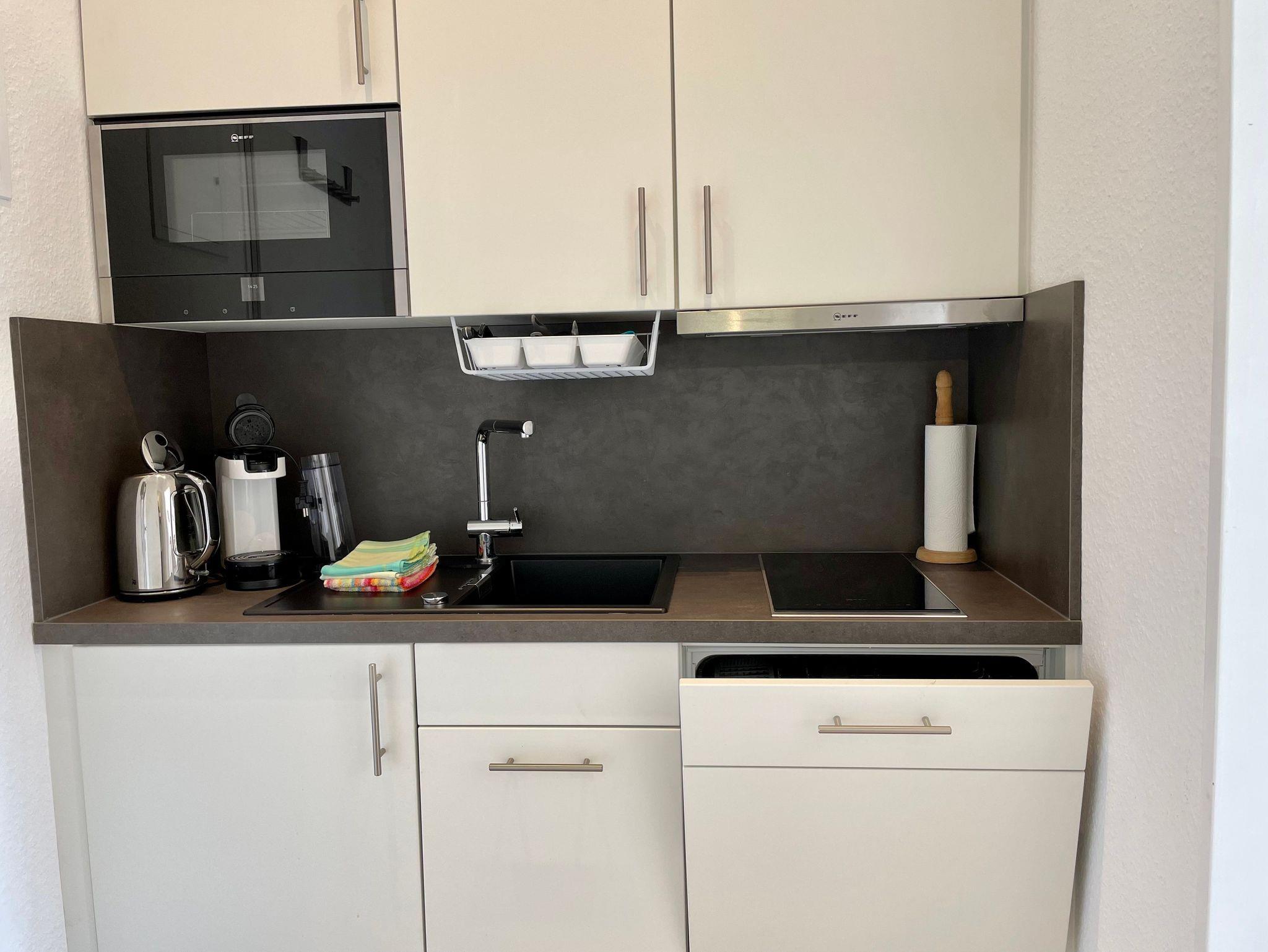 moderne Küchenzeile mit Spülmaschine, Kühlschrank, Herd, Kaffeemaschine, Wasserkocher etc.