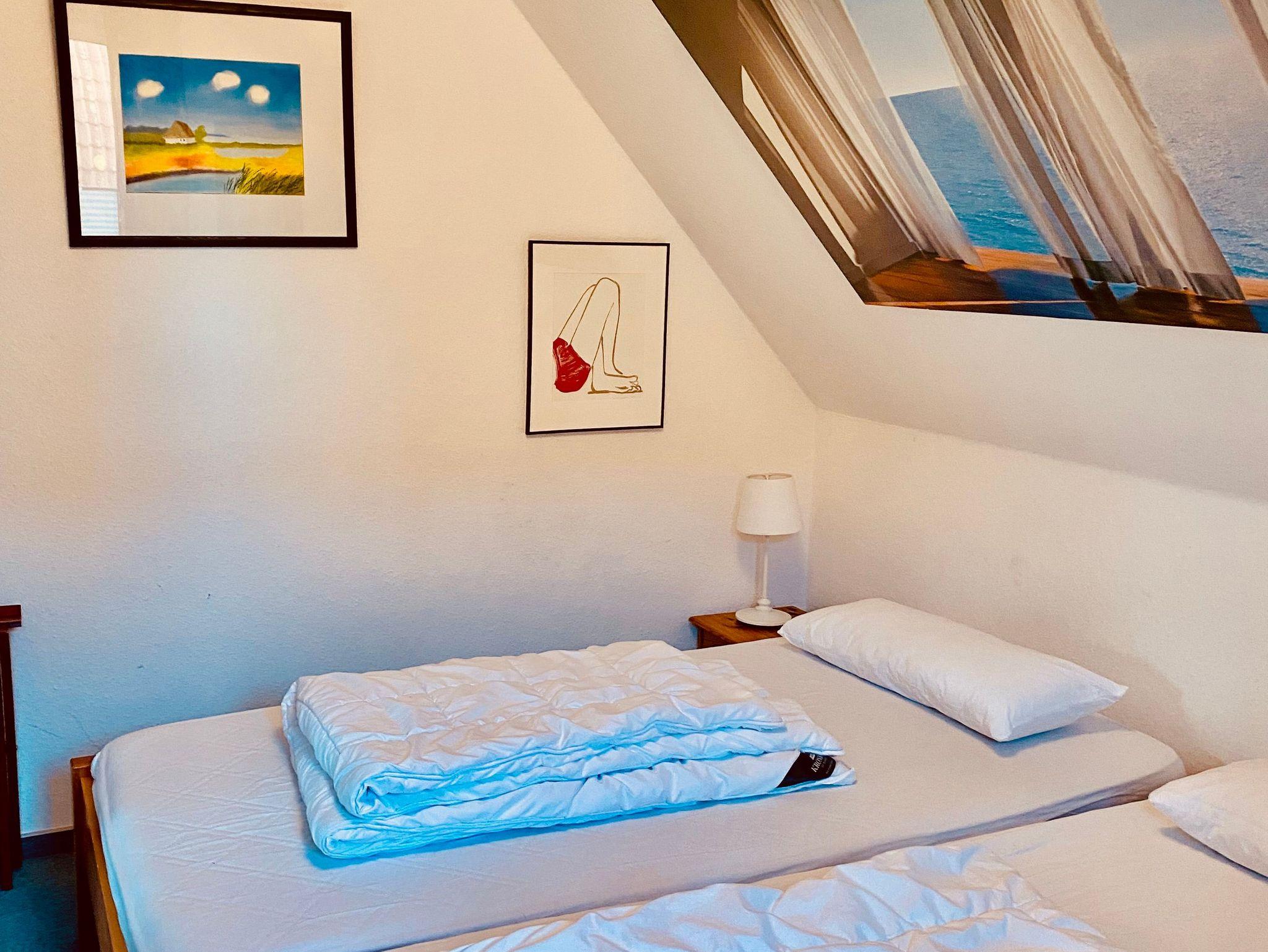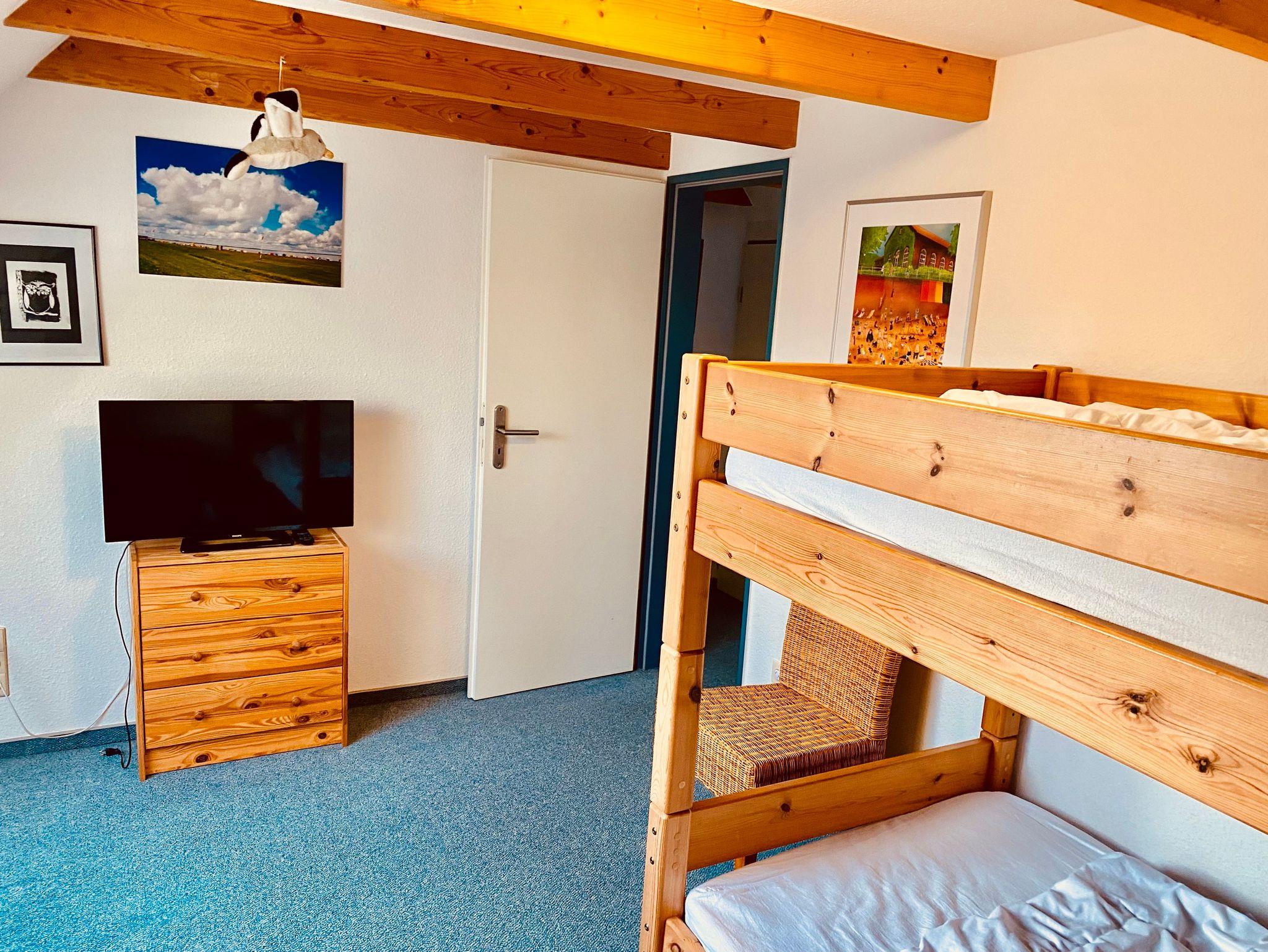 Unsere Ferienwohnung ist im Obergeschoss. Sie ist nach Süden ausgerichtet und immer hell. Es gibt einen großen Wohnraum mit gemütlicher Sitzecke, Essecke und Küchenzeile. Der Wohnraum führt auf den schönen, großen Sonnenbalkon. Auf gleicher Ebene finden Sie ein Schlafzimmer (2 Betten), Toilette und Eingangsflur. Eine Treppe höher finden Sie ein weiteres Schlafzimmer (Kinderzimmer) mit einem Etagenbett und einem Kinderbett. Gleich daneben ist die Dusche mit WC.