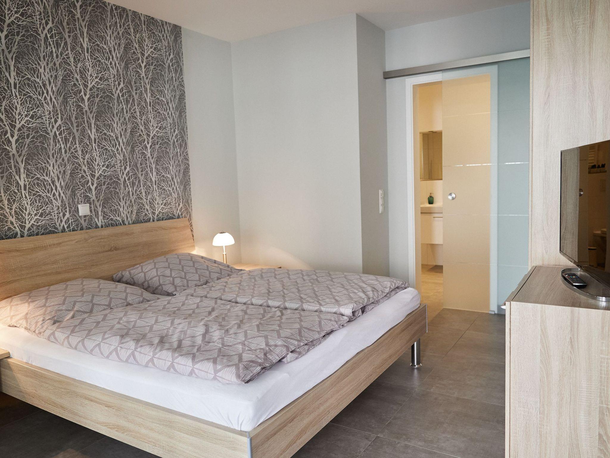 Das hochwertige Duschbad mit WC ist mit einer bodengleichen Dusche, Handtuchheizung sowie beleuchtetem Spiegel komfortabel und modern gestaltet. Auch das Schlafzimmer mit Doppelbett, einem weiteren Flachbildschirmfernseher und direktem Zugang zum Bad und zur Loggia bietet höchsten Komfort.