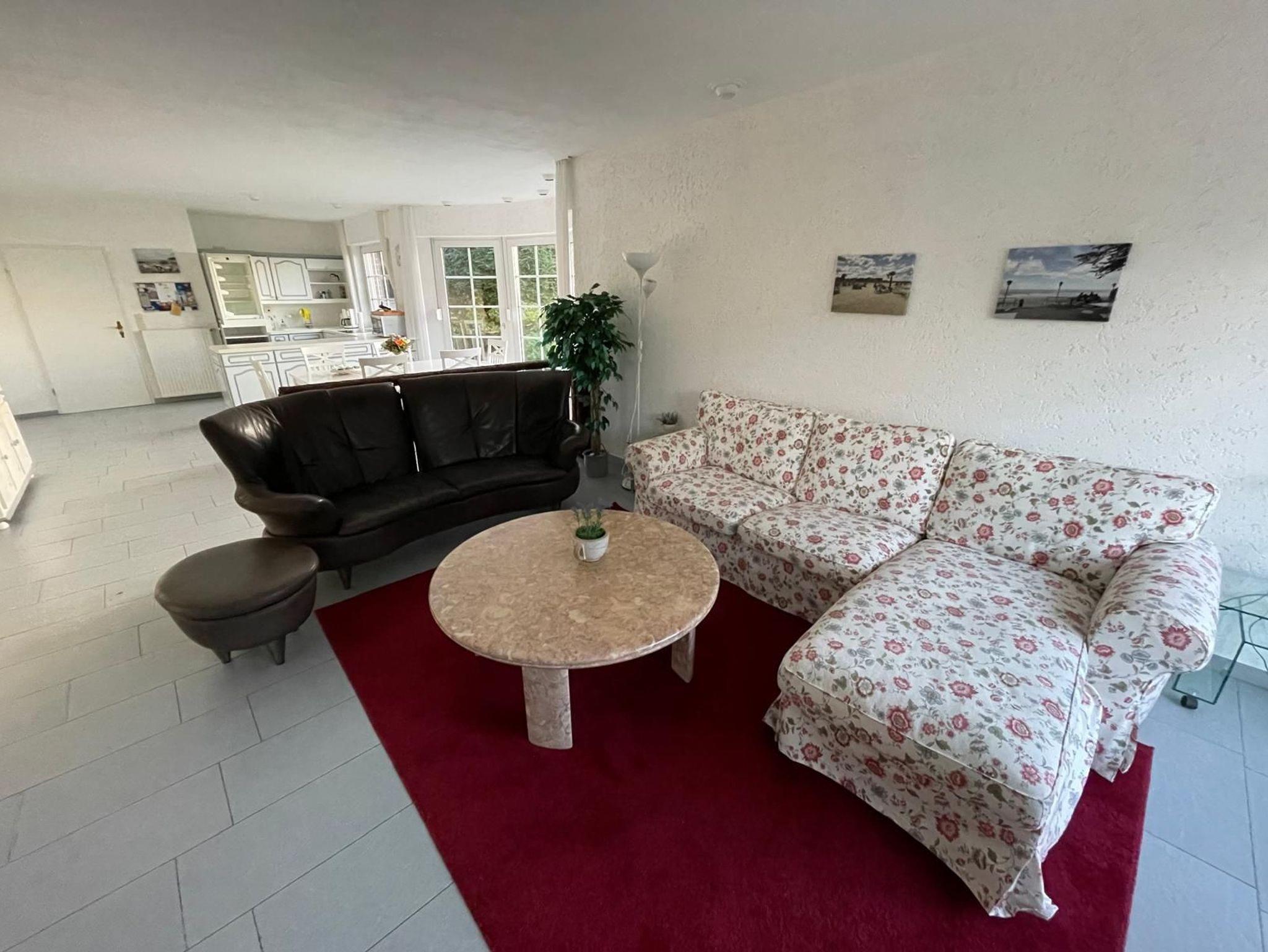 Die Ferienwohnung Fernblick erstreckt sich sich über das gesamte Erdgeschoss des Hauses und verfügt über einen lichtdurchfluteten Wohn- und Essbereich sowie eine integrierte Küchenzeile mit allem, was man für entspanntes Kochen braucht. Bis zu vier Personen fühlen sich hier sofort wohl.