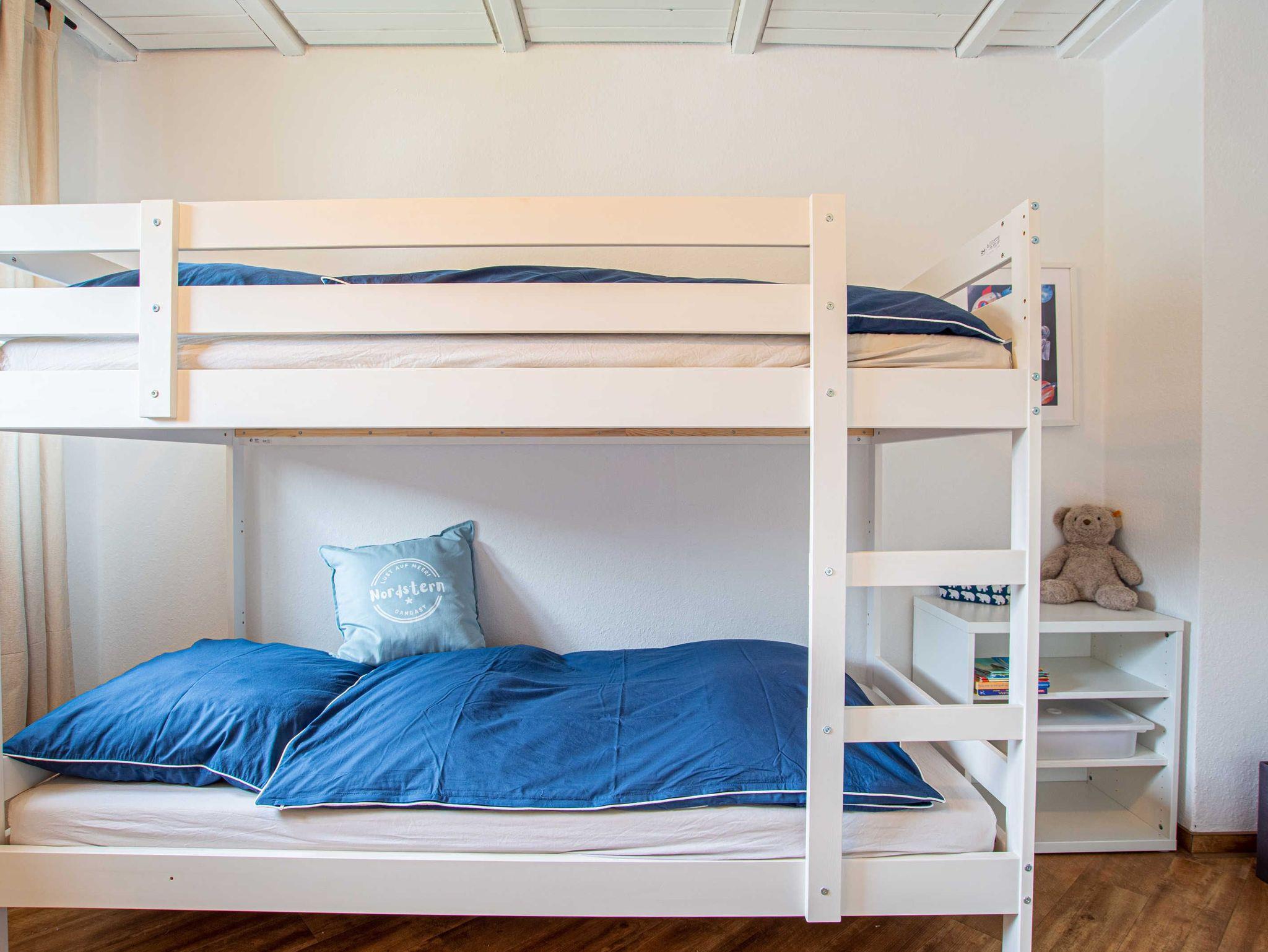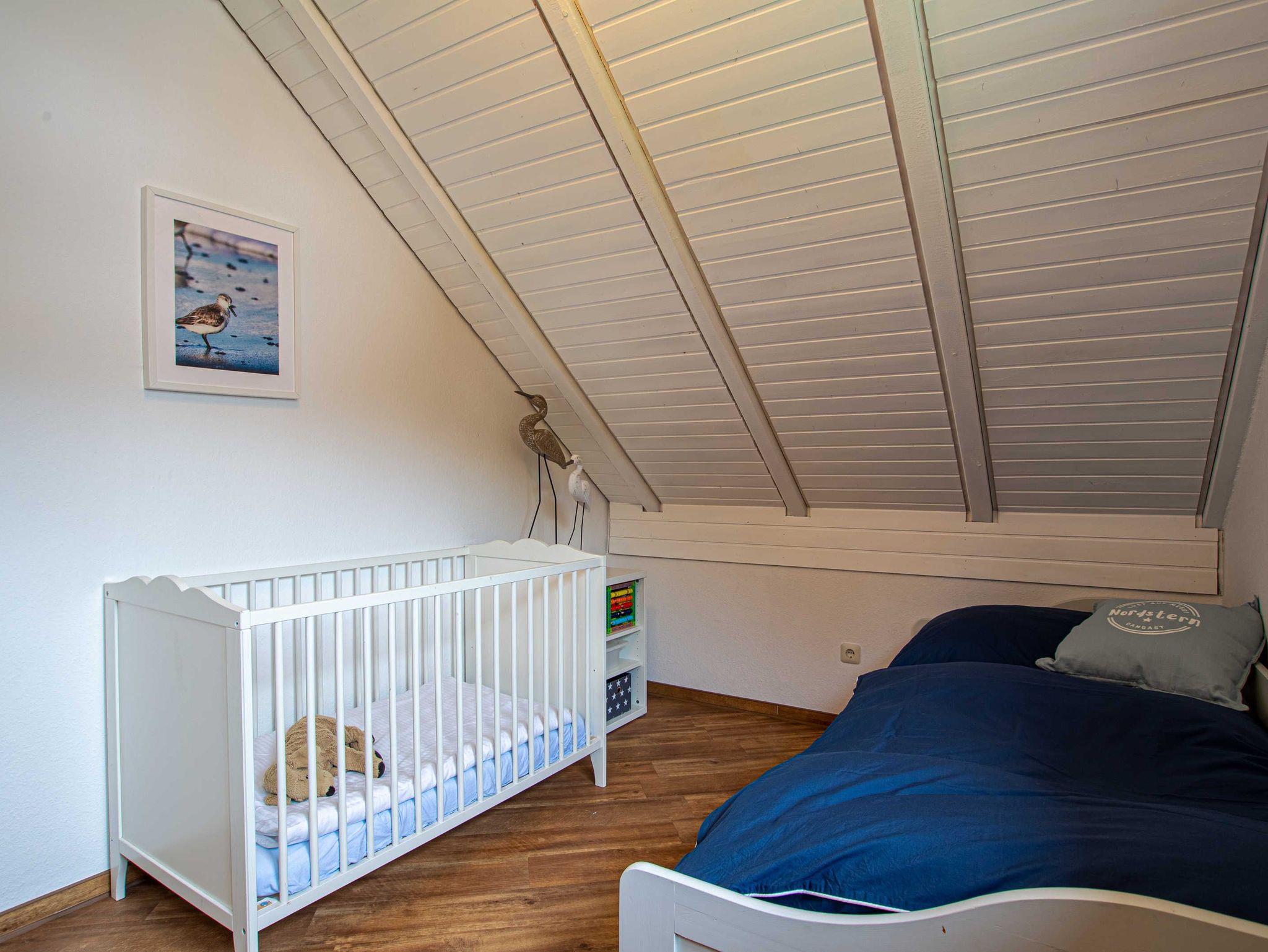 Im ersten Obrgeschoss befinden sich drei freundlich und hell eingerichtete Schlafzimmer. Ein Schlafzimmer mit Doppelbett, ein Zimmer mit Etagenbett sowie das dritte Zimmer mit einem Babybett sowie einem Einzelbett. Auf dieser Ebene ist auch das moderne helle Duschbad mit Waschplatz.