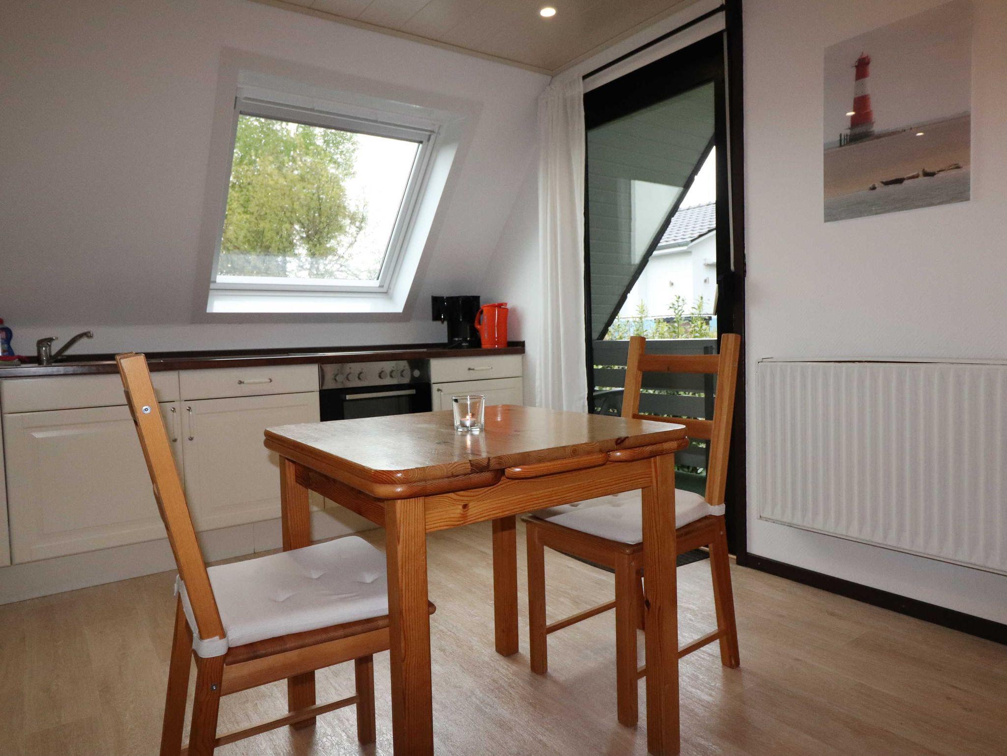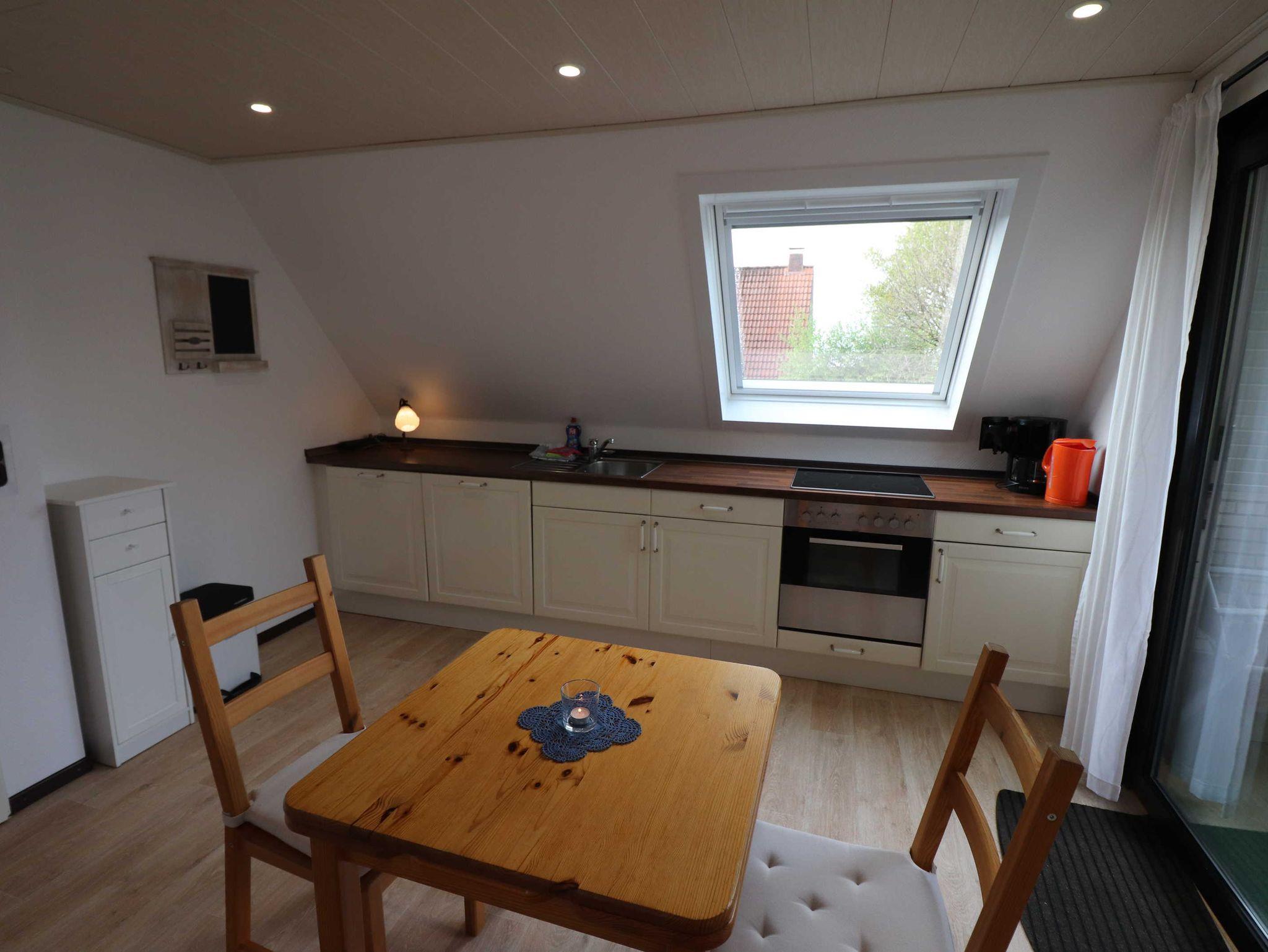 Unsere Wohnung im Obergeschoss links ist ca. 39m² groß. Aus dem Dachfenster im Küchenbereich haben Sie den Jadebusen im