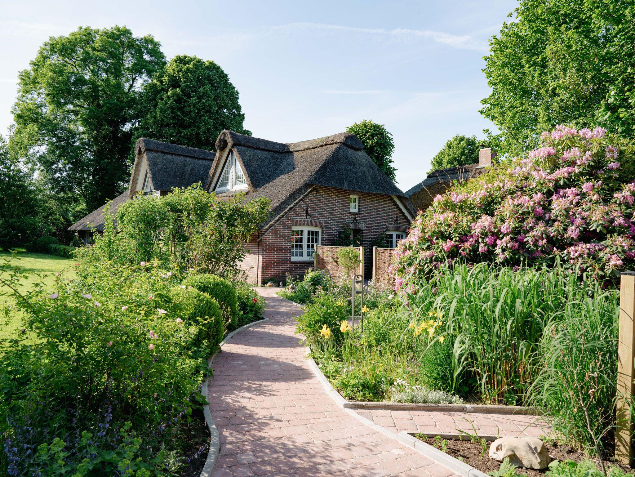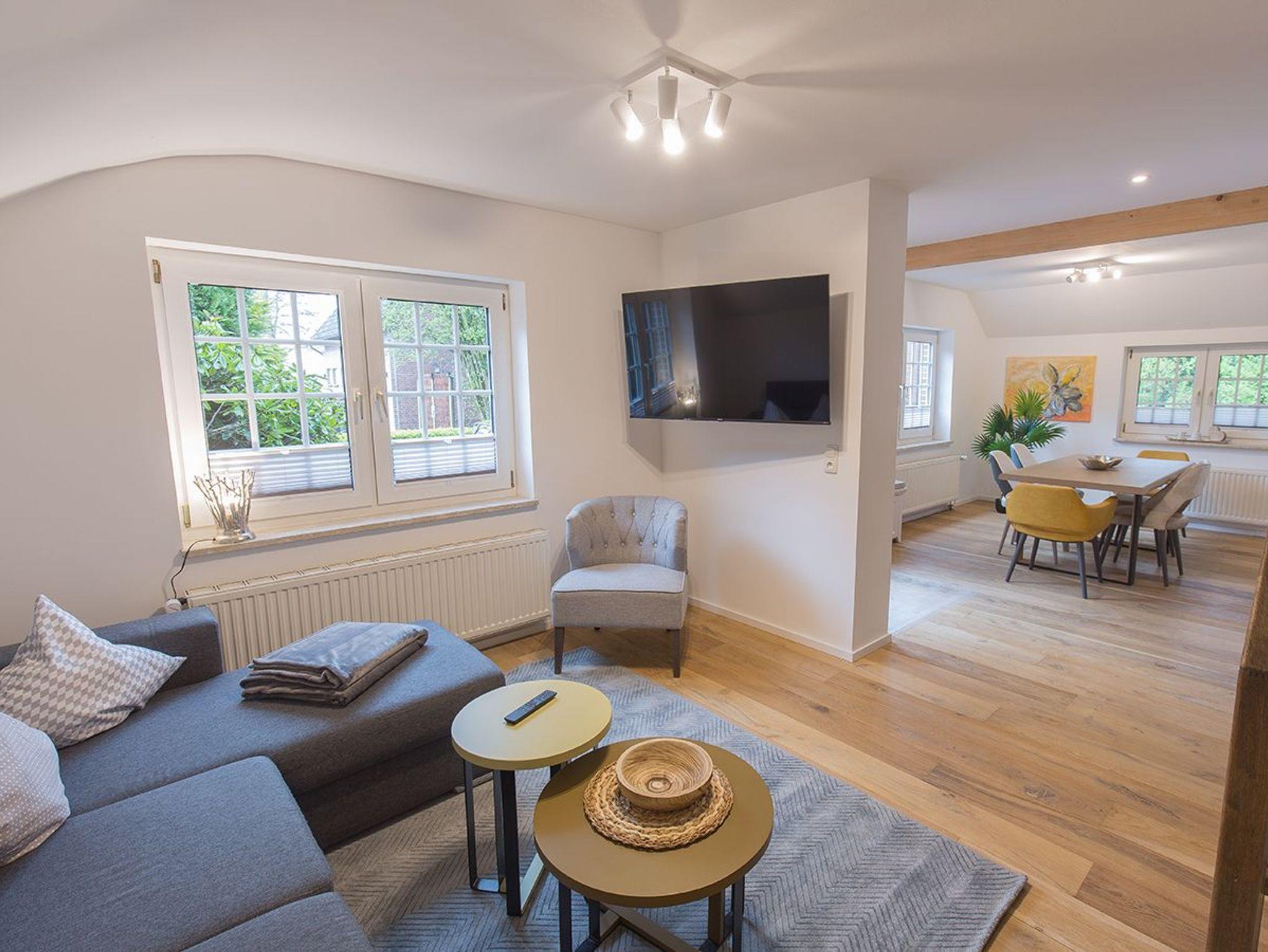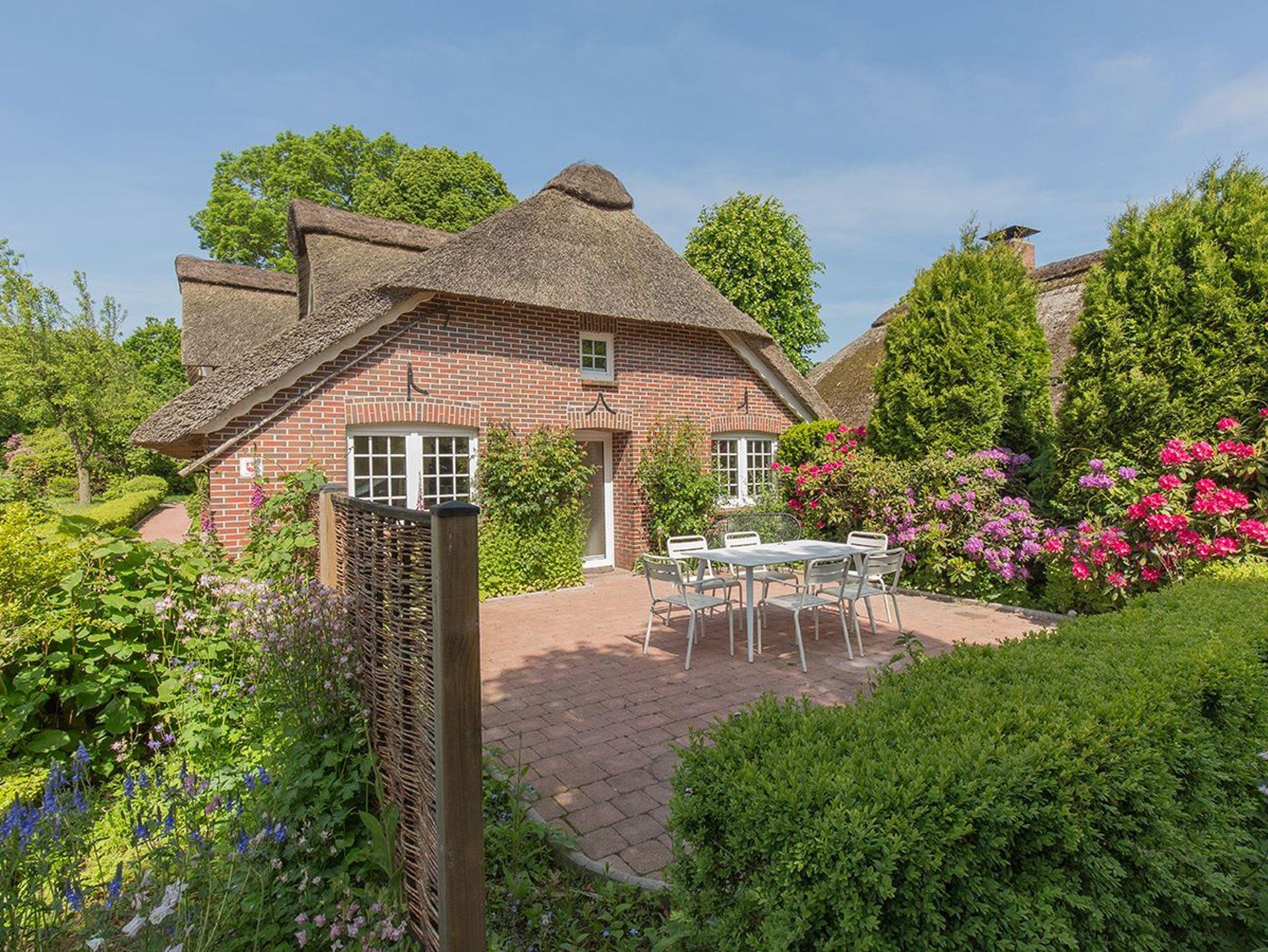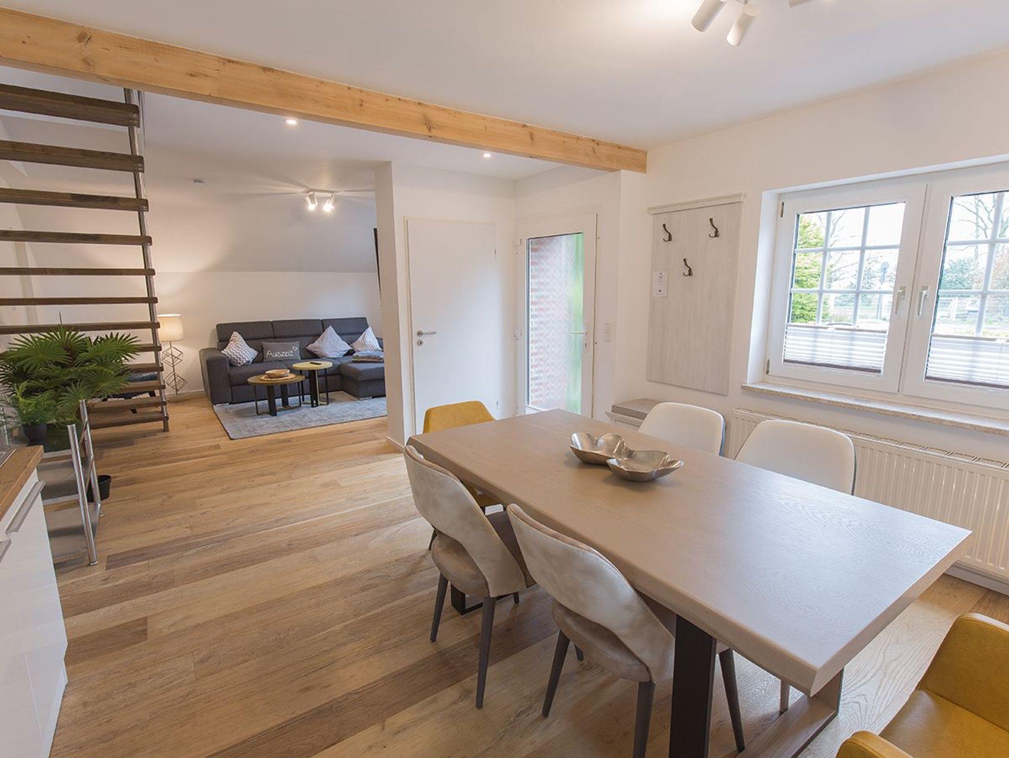 Moderne Ferienwohnung Reethuus 5 in Dangast mit Sauna, Sonnenterrasse und Gartenblick, ideal für Naturfreunde und Familien.