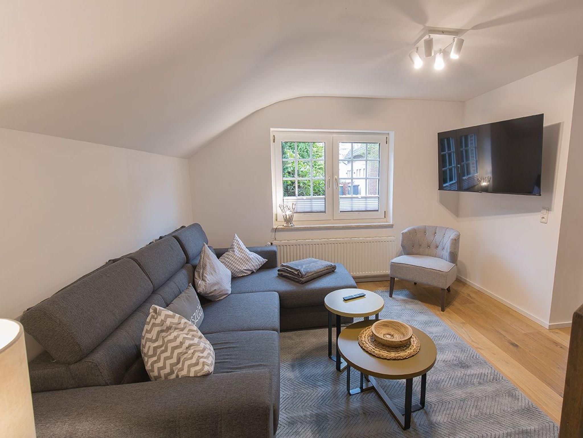 Unsere schicke Wohnung Reethus 5 liegt inmitten grüner Natur in der Oldeoogstraße und ist Teil der Ferienwohnanlage achtteihn. Ihr PKW-Stellplatz liegt unmittelbar vor der Anlage; im gesamten Objekt wurde Echtholz-Eichenparkett verlegt. Sie wohnen hier mit bis zu sechs Personen und Kleinkind sehr ruhig und können die 30 qm große Sonnenterrasse, den Garten, die Sauna und einen schönen Weitblick genießen. Sie gelangen ab Eingang in den großen Wohn-/Essbereich mit Küchenzeile und dem gemütlichen Sofa mit Recamiere und Schlaffunktion. Hier führen 2 Türen zu den unteren beiden Schlafräumen mit je einem Boxspringbett. Von den Schlafräumen gelangen Sie in ihr eigenes Duschbad mit Fußbodenheizung und ebenerdiger Walk-In-Regendusche. Eine Treppe führt Sie in den Maisonette-Bereich mit einem weiteren großen Boxspringbett sowie einem zu schließenden Bereich mit WC und Waschplatz. Genießen Sie ihre Terrasse und den Gartenblick.