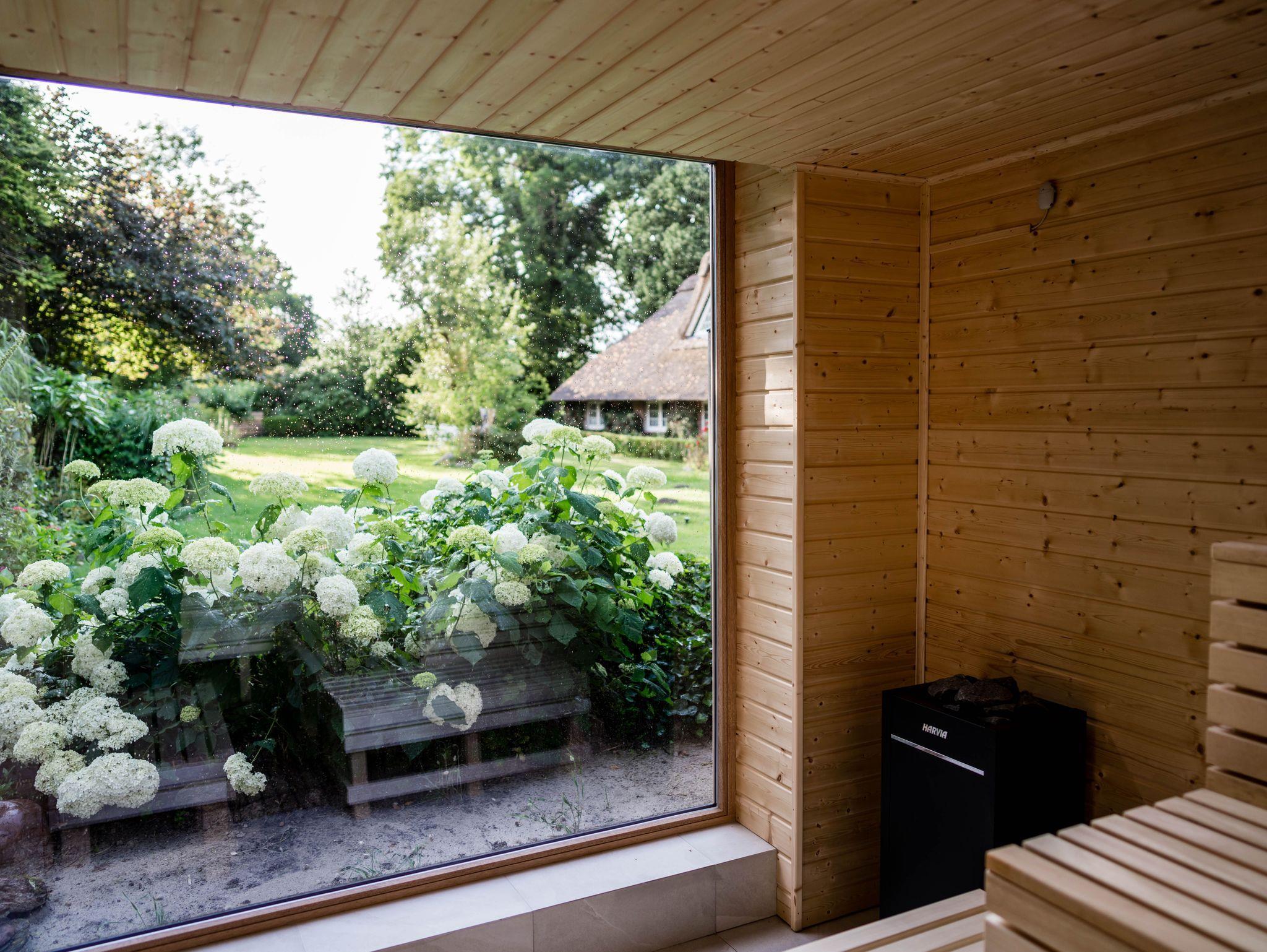Moderne Ferienwohnung Reethuus 6 in Dangast mit Sauna, Terrasse und Blick ins Grüne.