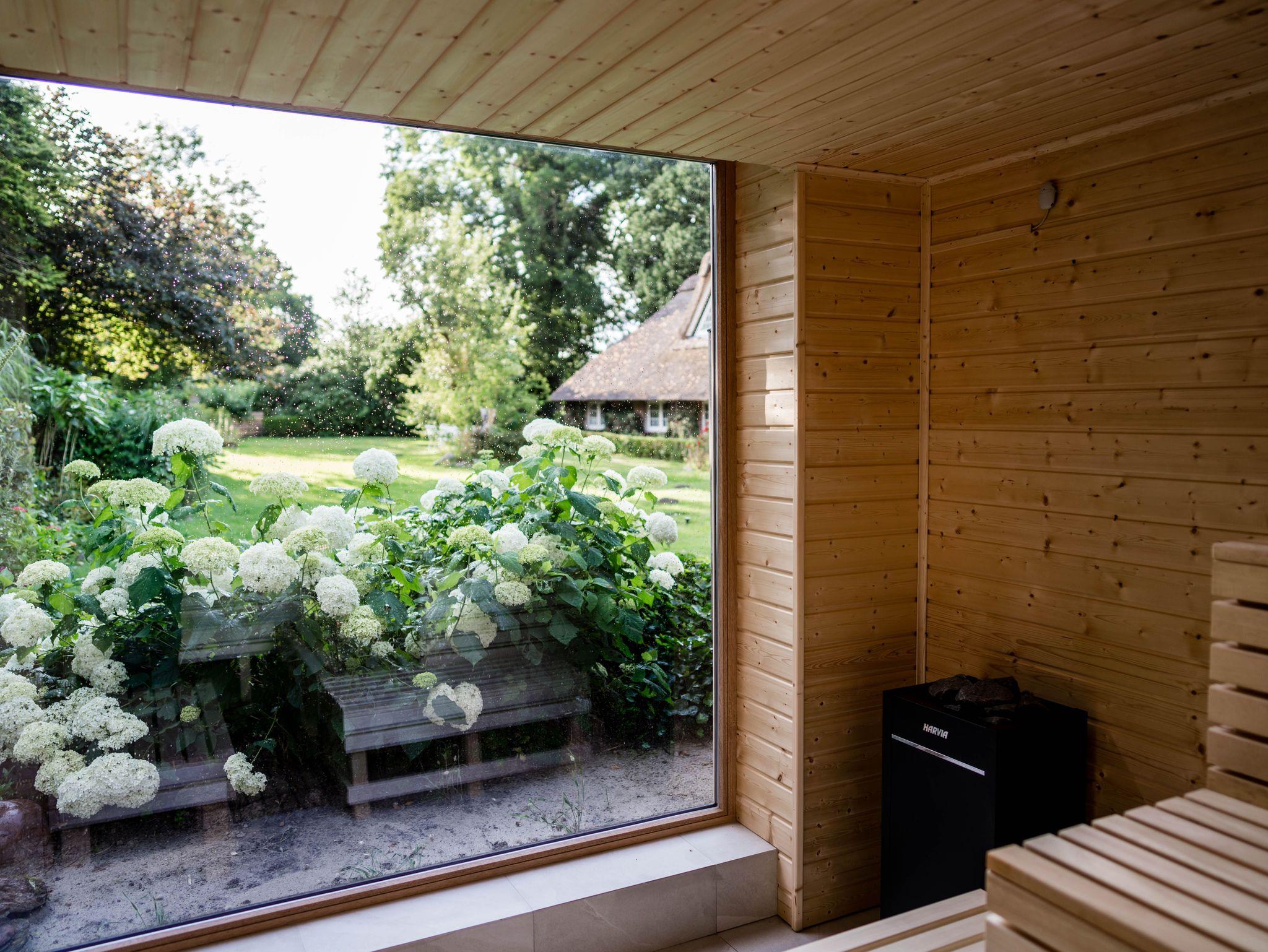 Moderne Ferienwohnung Reethuus 6 in Dangast mit Sauna, Terrasse und herrlichem Blick auf grüne Natur.