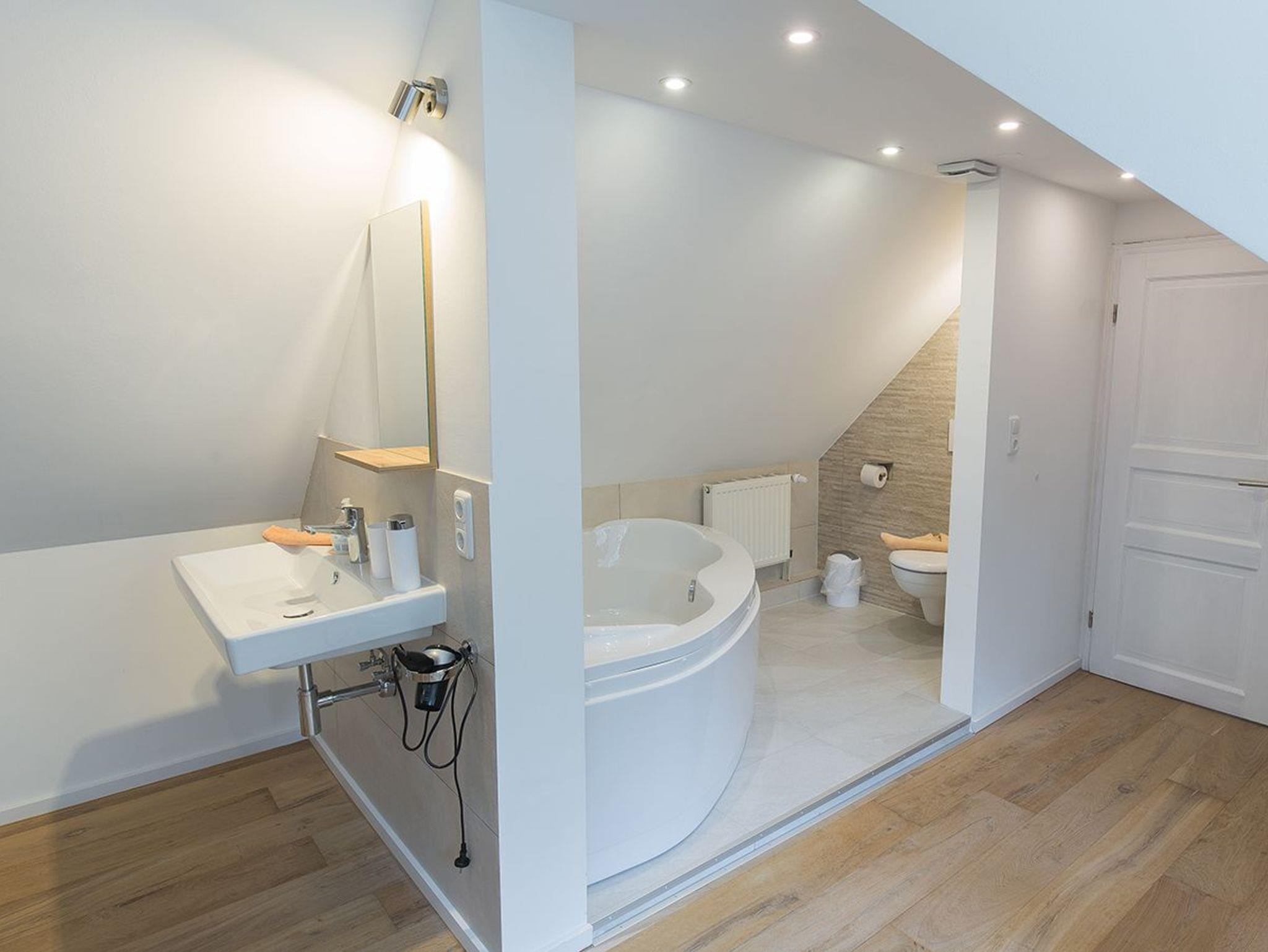 Unsere schicke Wohnung Reethuus 6 liegt inmitten grüner Natur in der Oldeoogstraße und ist Teil der Ferienwohnanlage achtteihn. Ihr PKW-Stellplatz liegt unmittelbar vor der Anlage. Hier surfen Sie mit Highspeed-Internet. Alle Bäder sind mit Fußbodenheizung und ebenerdigen Walk-In-Regenduschen; im gesamten Objekt wurde Echtholz-Eichenparkett verlegt. Sie wohnen hier mit bis zu vier Personen und Kleinkind sehr ruhig und können den Garten, die Sauna und einen schönen Weitblick genießen. Sie gelangen ab Eingang in den Flur und dann in den modernen Wohn-/Essbereich mit integrierter Küchenzeile und vorgelagertem Essplatz. In der unteren Ebenen befindet sich das moderne Duschbad und der erste Schlafraum mit Doppel-Boxspringbett und Aussicht ins Grüne. Das bequeme Ottomanen-Sofa hat eine Schlaffunktion. Das weitere Schlafzimmer en Suite - mit Badewanne, Sitzgelegenheit und einem weiteren Doppel-Boxspringbett liegt in der oberen Ebene. Genießen Sie Ihre schöne Terrasse.
