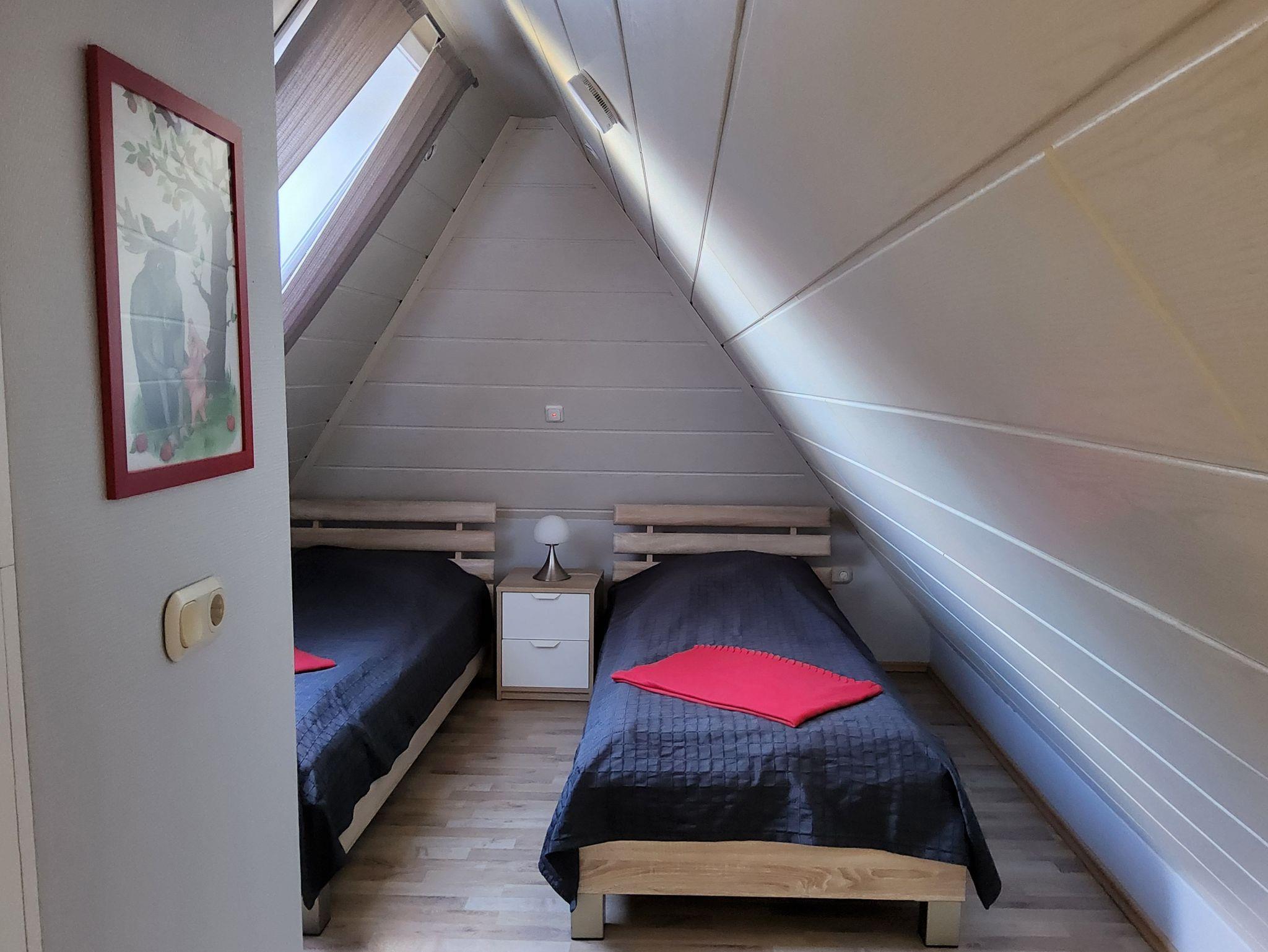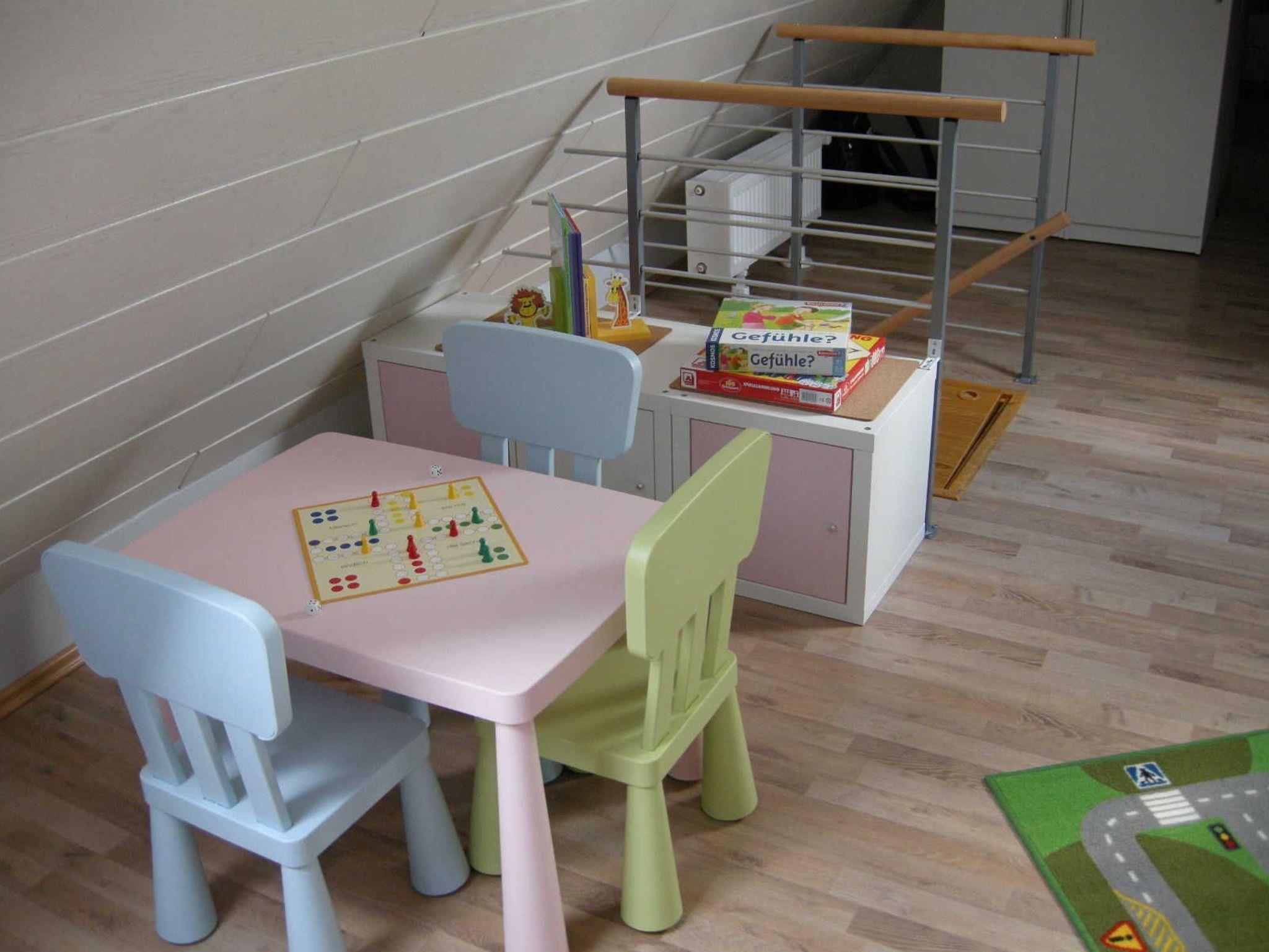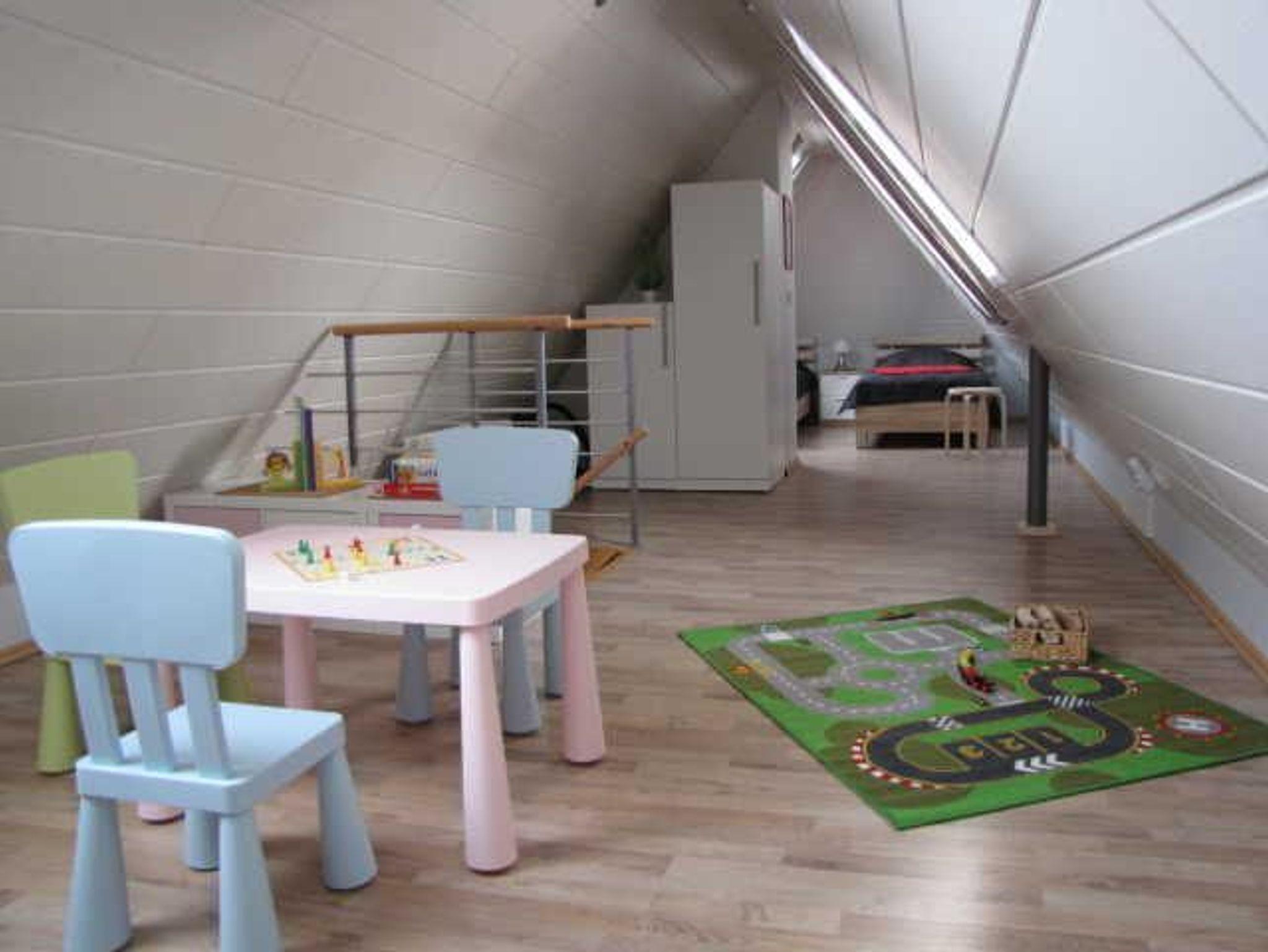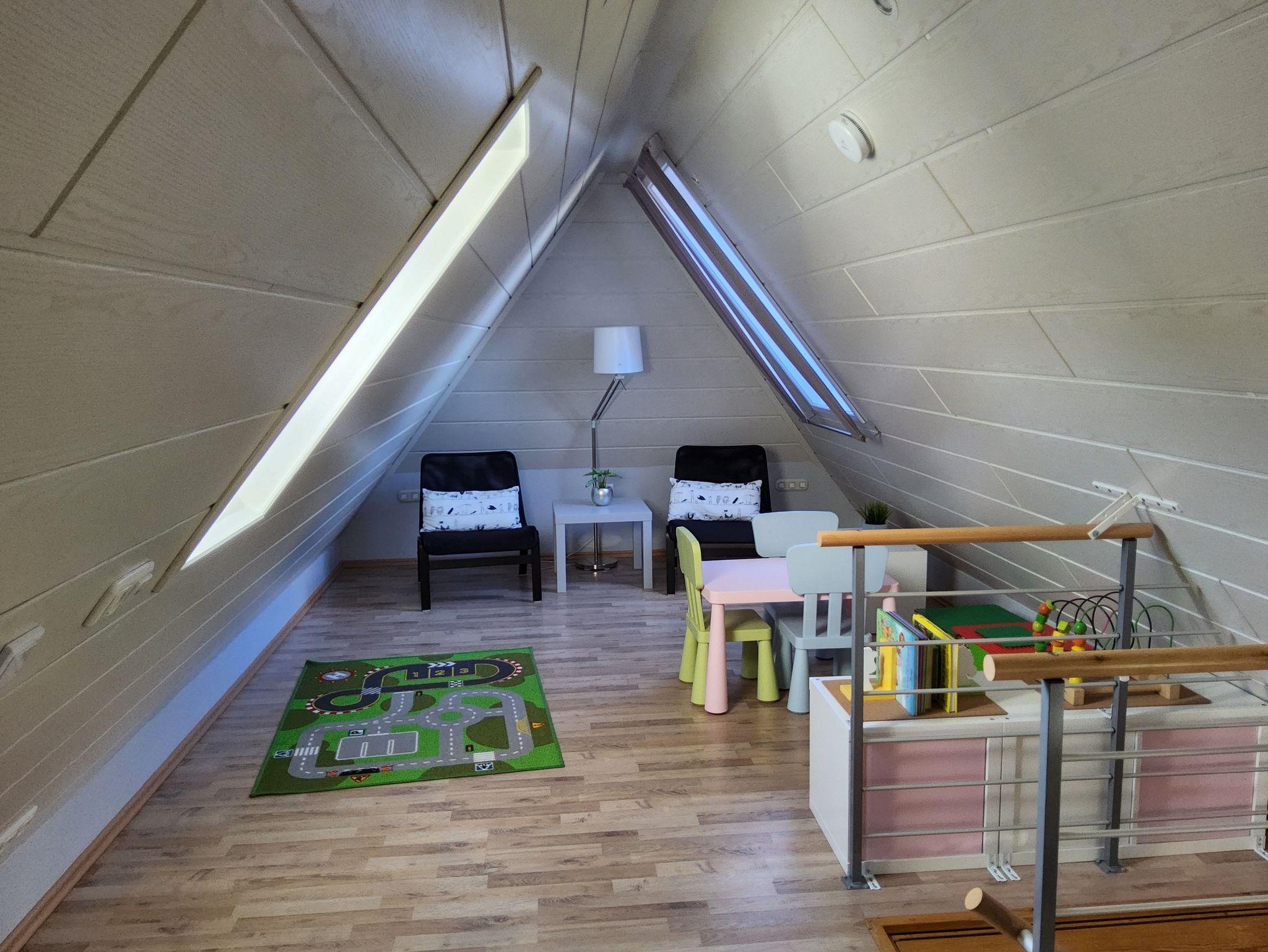Eine Holztreppe führt in das ausgebaute Dachgeschoss mit zwei weiteren Schlafplätzen (Einzelbetten je 2,00 m x 0,90 m), einer gemütlichen Leseecke sowie einem Spielbereich für Kinder (diverse Spiele vorhanden). Hier lässt sich spielend auch mal ein Regentag überbrücken.