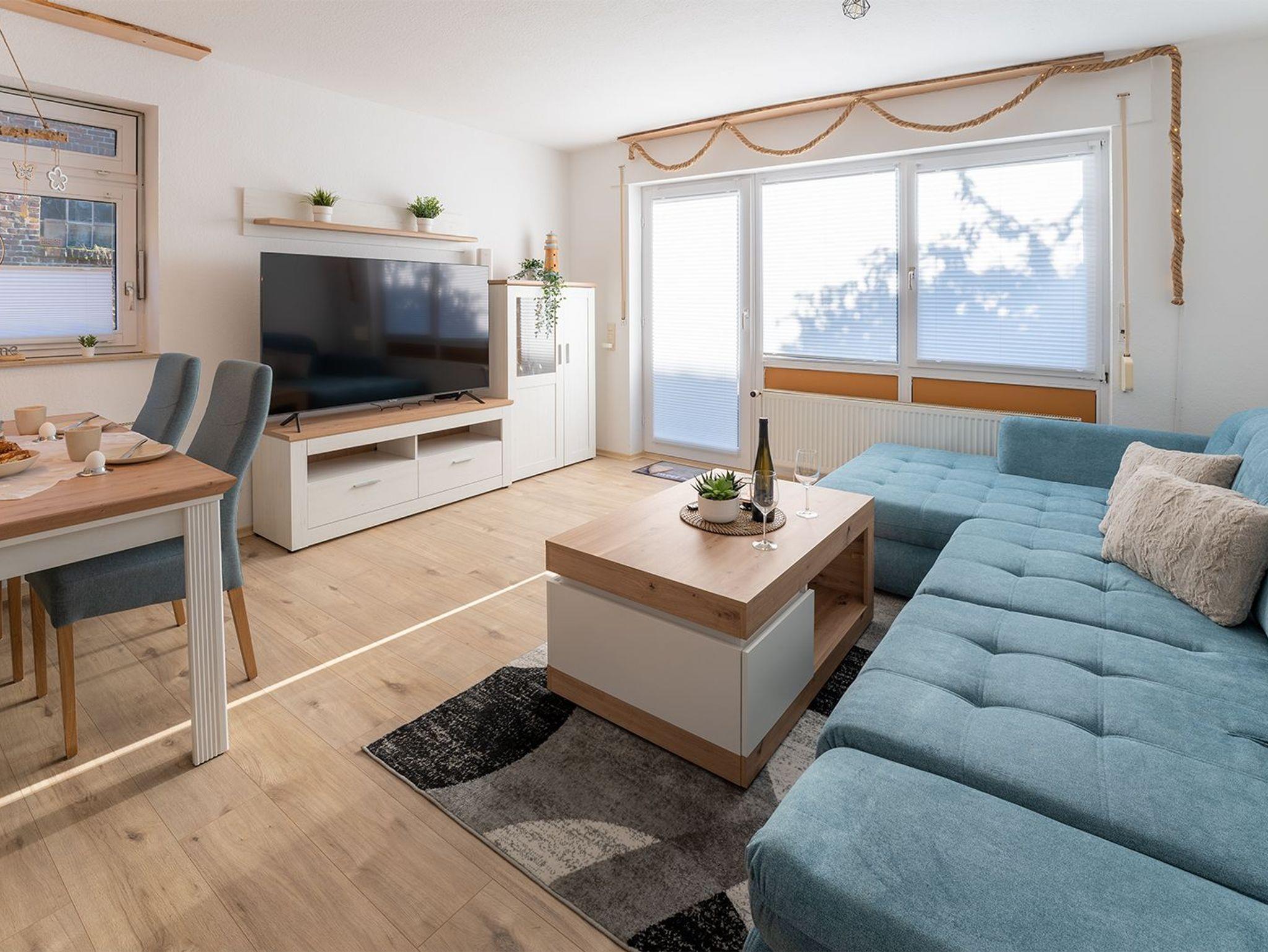 Vom Eingangsbereich mit Gäste-WC und Garderobe erreichen Sie das gemütliche Wohnzimmer mit integrierter Küchenzeile und dem Essplatz für vier Personen. Hier ist der Ausgang zur Terrasse mit Zugang zum schön begrünten Gemeinschaftsgarten.