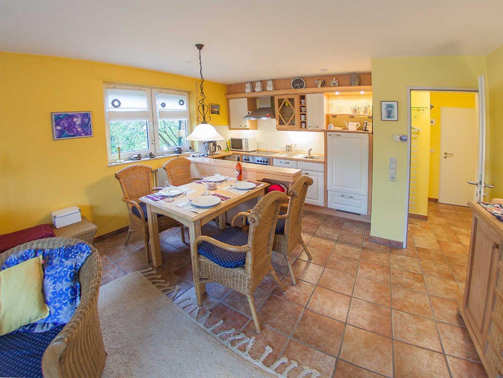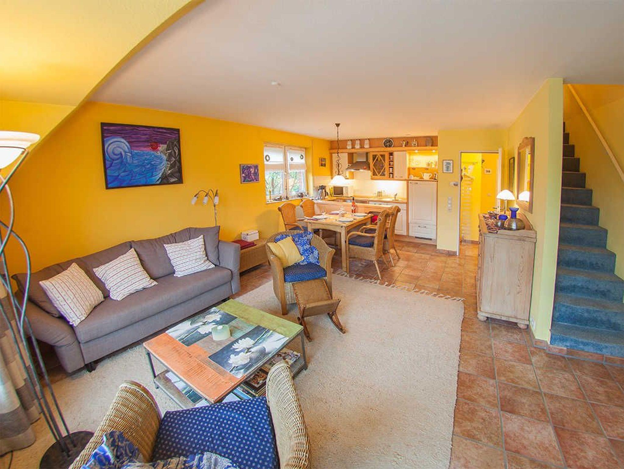 Die schicke Maisonette-Ferienwohnung im ersten Obergeschoss des Vier-Parteienhauses hat ein großes Wohnzimmer mit integrierter Küche mit Essplatz für vier Personen sowie eine hochwertige ausziehbare Couch. Das separate Schlafzimmer hat ein Doppelbett. Zusätzlich zum Duschbad, welches sich separat im Dachgeschoss befindet, gibt es noch ein Gäste-WC.