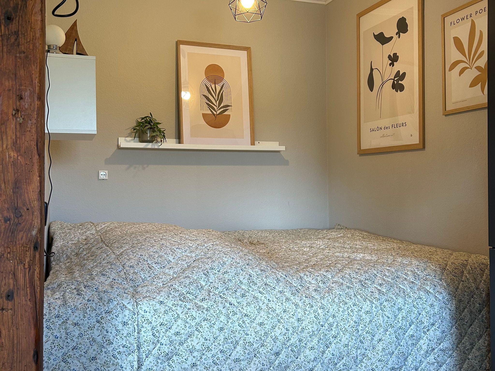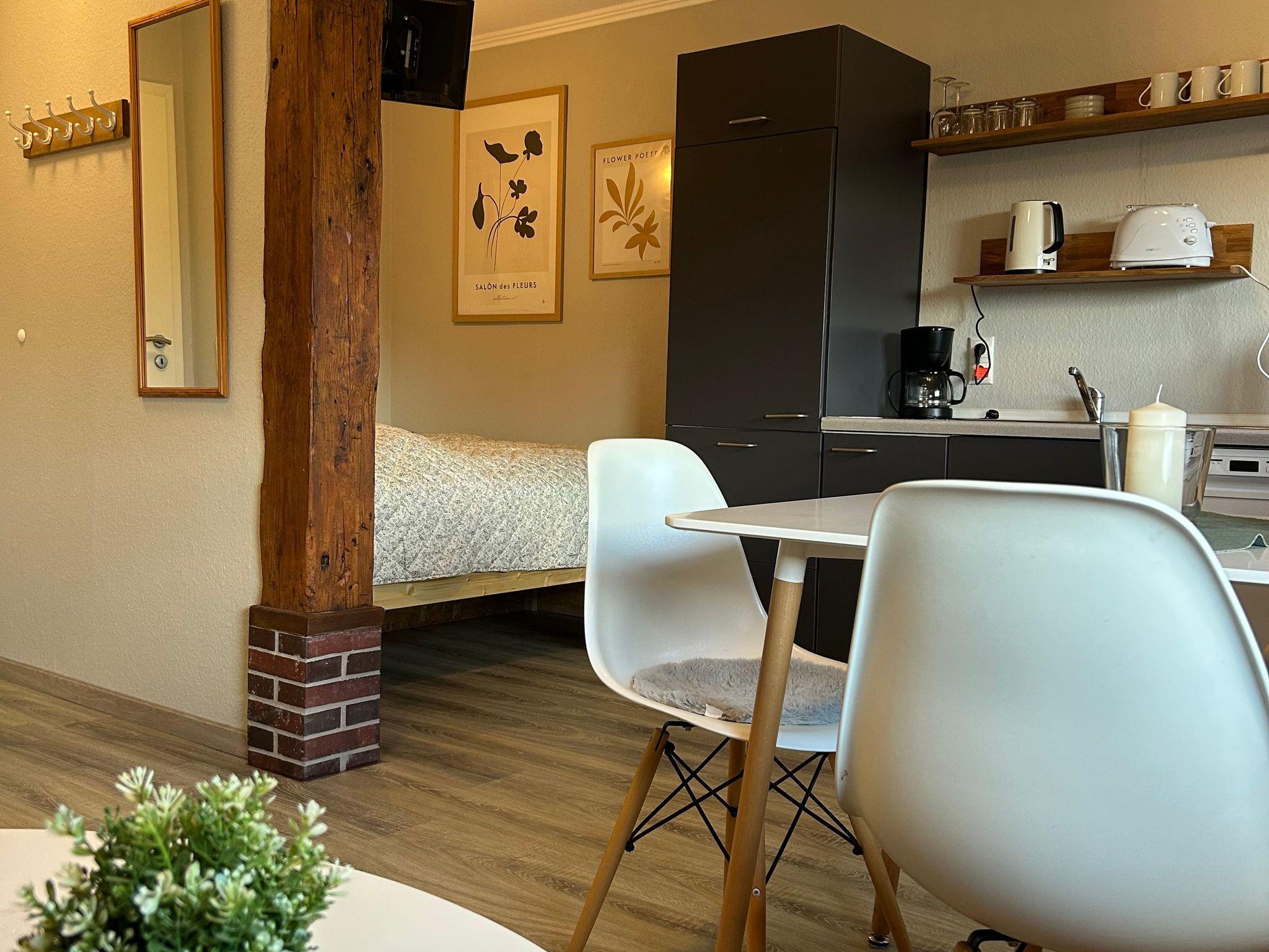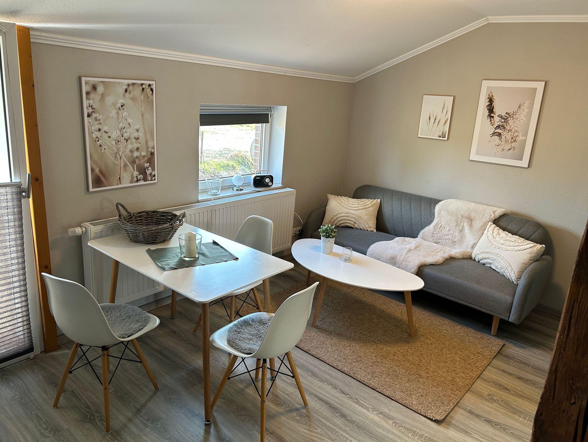Helles und gemütliches Appartement mit einem Doppelbett und einer Schlafcouch für bis zu 3 Personen. Der Schlafbereich ist vom Wohn- und Essbereich getrennt. Gemeinschaftlicher Gartenbereich mit Blick auf die Weiden.