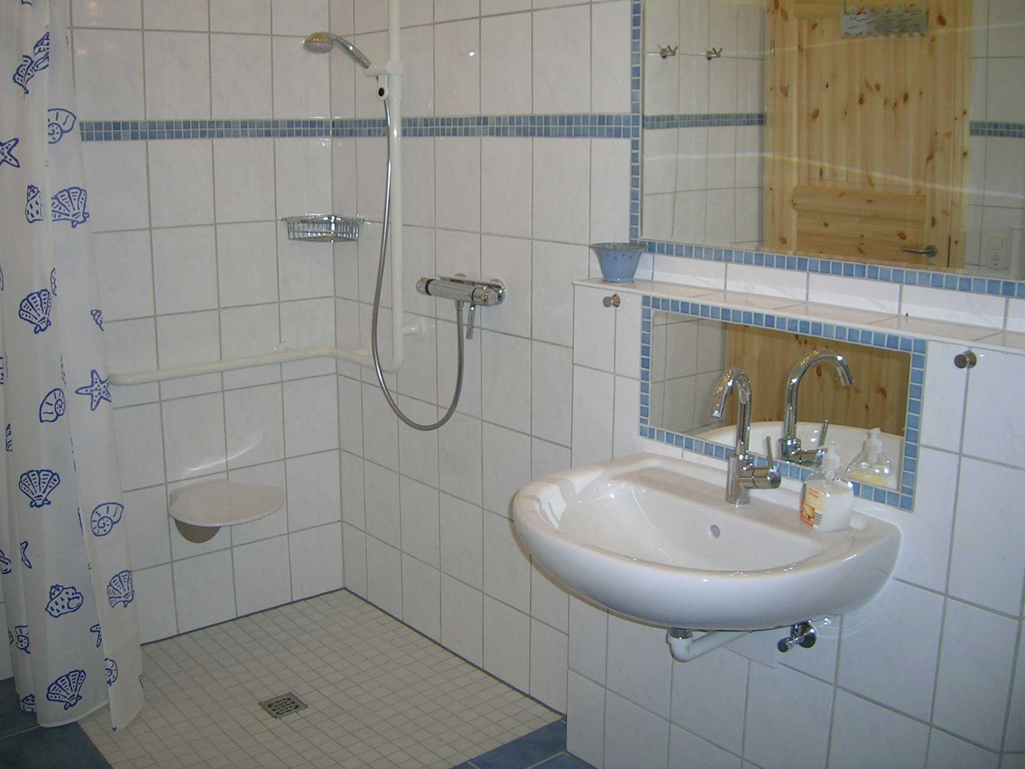 2 geräumige, rollstuhlgerechte Badezimmer. 1. Bad mit Badewanne und befahrbarer Dusche 2. Duschbad großzügig mit befahrbarer Dusche,