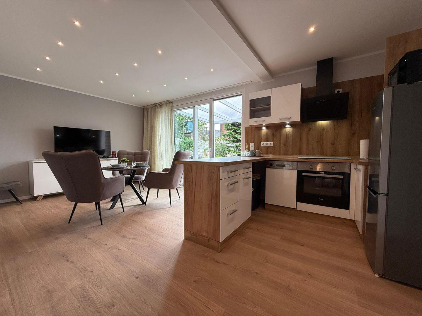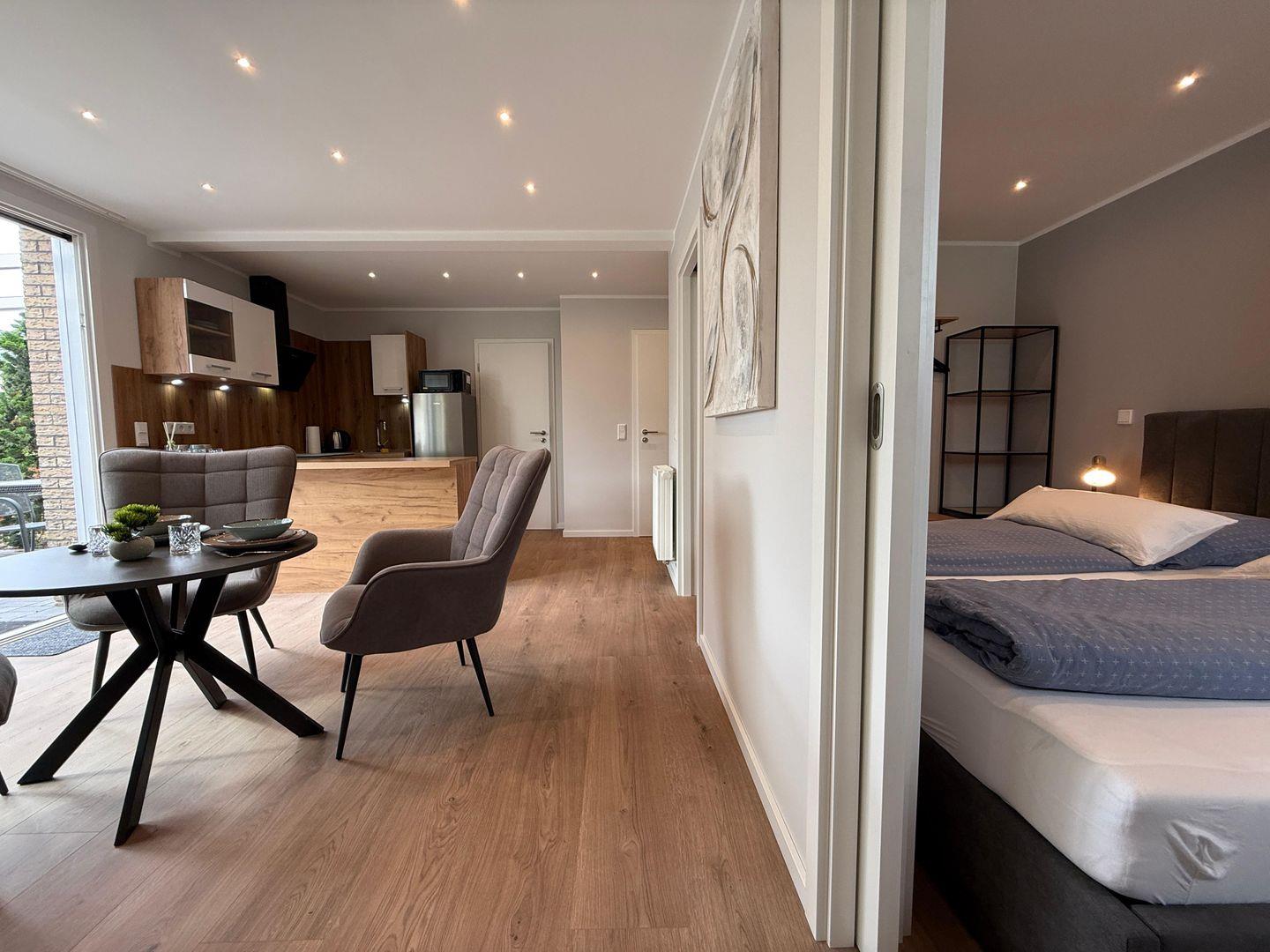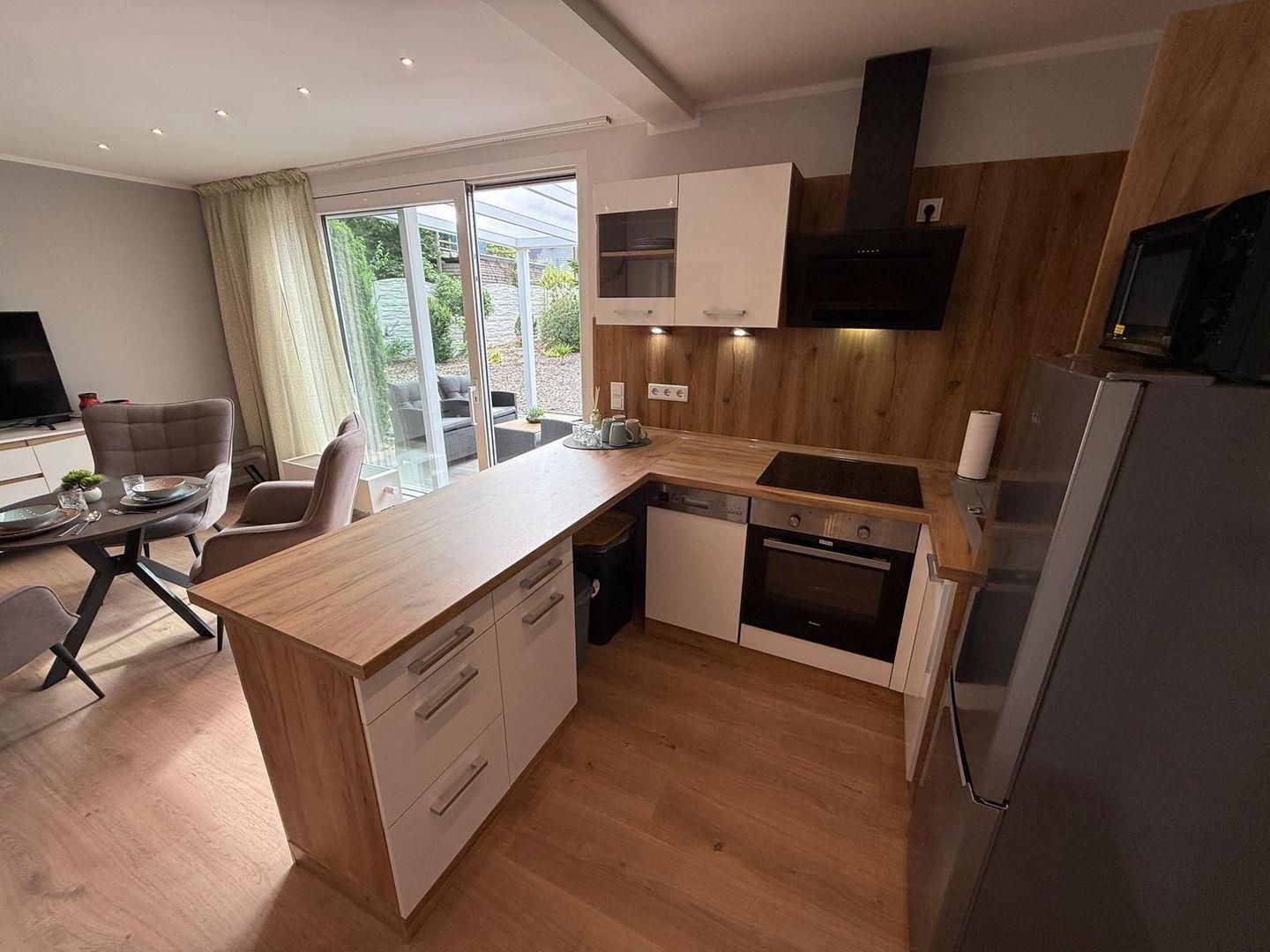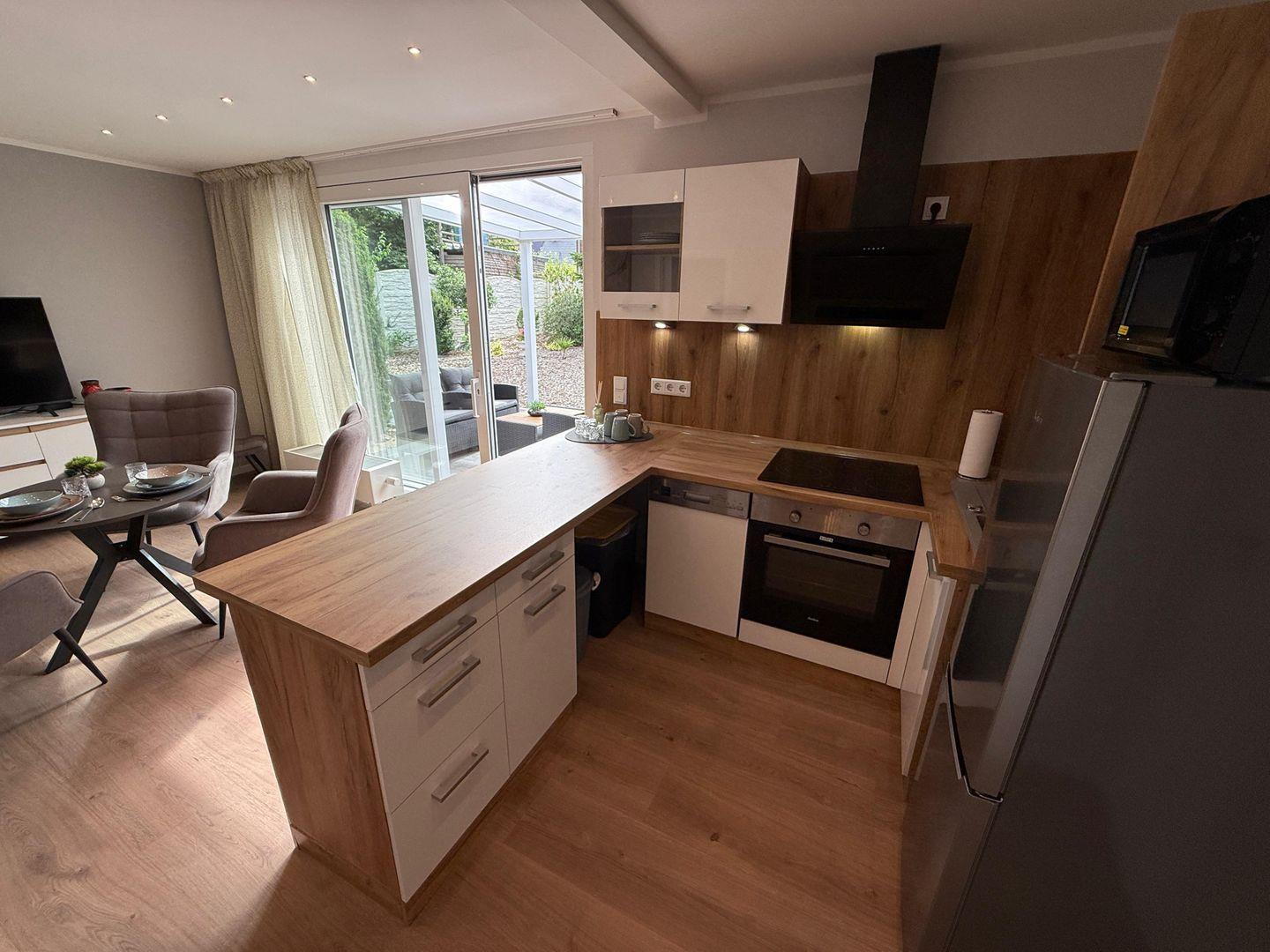 Das Apartment überzeugt durch seine offene Raumgestaltung: Die Küche öffnet sich zum Wohnbereich und ist mit hochwertigen Geräten und umfangreicher Ausstattung versehen. Hierzu gehören ein Ceranherd, ein Elektrobackofen, eine Mikrowelle, ein Kühlschrank mit integriertem Gefrierfach, eine Spülmaschine sowie zahlreiche Küchenutensilien, Geschirr und Besteck. Ein Wasserkocher, Toaster und eine Kaffeemaschine stehen für Ihr tägliches Frühstück und entspannte Abende bereit. Zum gemeinsamen Speisen lädt der großzügige Essbereich ein.