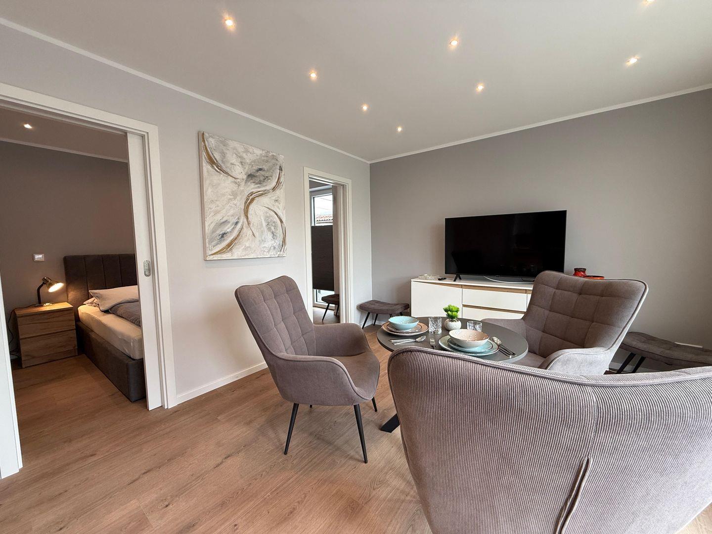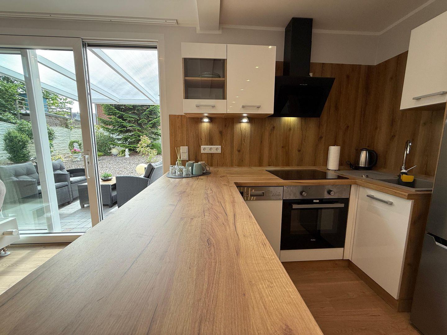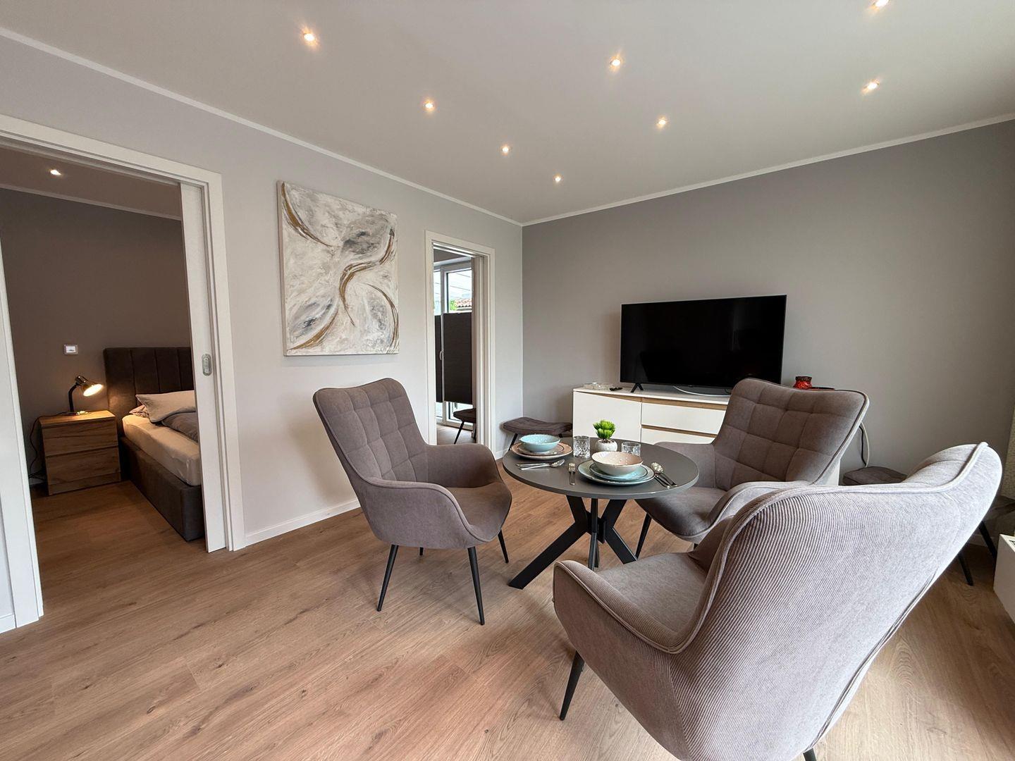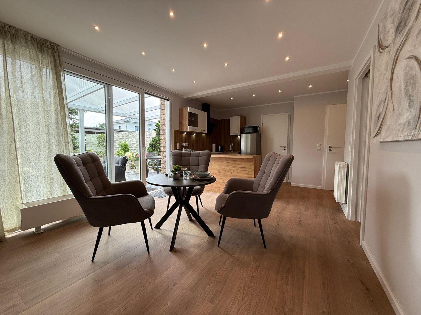 Das Apartment überzeugt durch seine offene Raumgestaltung: Die Küche öffnet sich zum Wohnbereich und ist mit hochwertigen Geräten und umfangreicher Ausstattung versehen. Hierzu gehören ein Ceranherd, ein Elektrobackofen, eine Mikrowelle, ein Kühlschrank mit integriertem Gefrierfach, eine Spülmaschine sowie zahlreiche Küchenutensilien, Geschirr und Besteck. Ein Wasserkocher, Toaster und eine Kaffeemaschine stehen für Ihr tägliches Frühstück und entspannte Abende bereit. Zum gemeinsamen Speisen lädt der großzügige Essbereich ein.