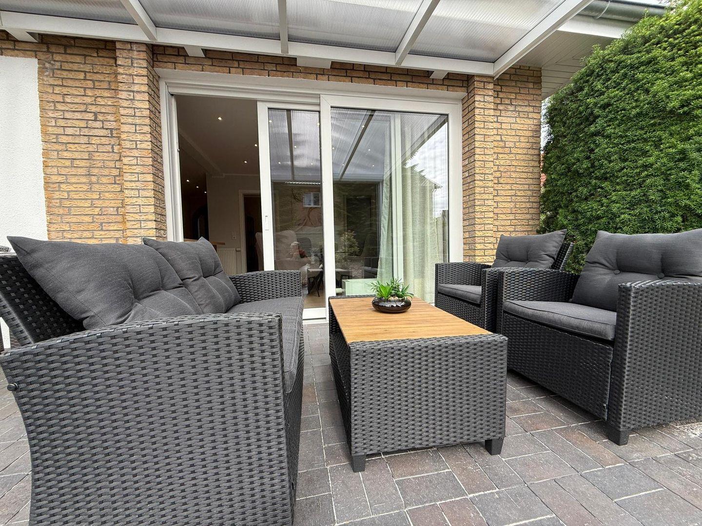 Ein besonderes Highlight ist die überdachte Terrasse mit Gartenblick, mit hochwertigen Gartenmöbeln ausgestattet. Sie haben direkten Zugang zum Garten, der ein zusätzliches Maß an Sicherheit und Privatsphäre bietet. Der private Parkplatz auf dem Grundstück ermöglicht eine bequeme Anreise und einen sorglosen Aufenthalt ohne Parkplatzsuche.