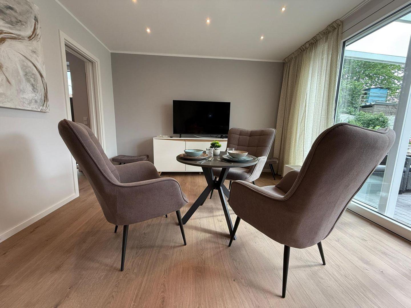 Im Wohnbereich erwarten Sie moderne Unterhaltungstechnik mit TV und WLAN. Die moderne Einrichtung wird ergänzt durch praktische Ausstattungen wie eine eigene Waschmaschine, Wäscheständer, Bügelbrett, Bügeleisen und einen Staubsauger. Große Fenster sorgen für viel Tageslicht; sämtliche Fenster sind mit Sichtschutz und Fliegengittern ausgestattet und bieten damit Komfort und Privatsphäre.
