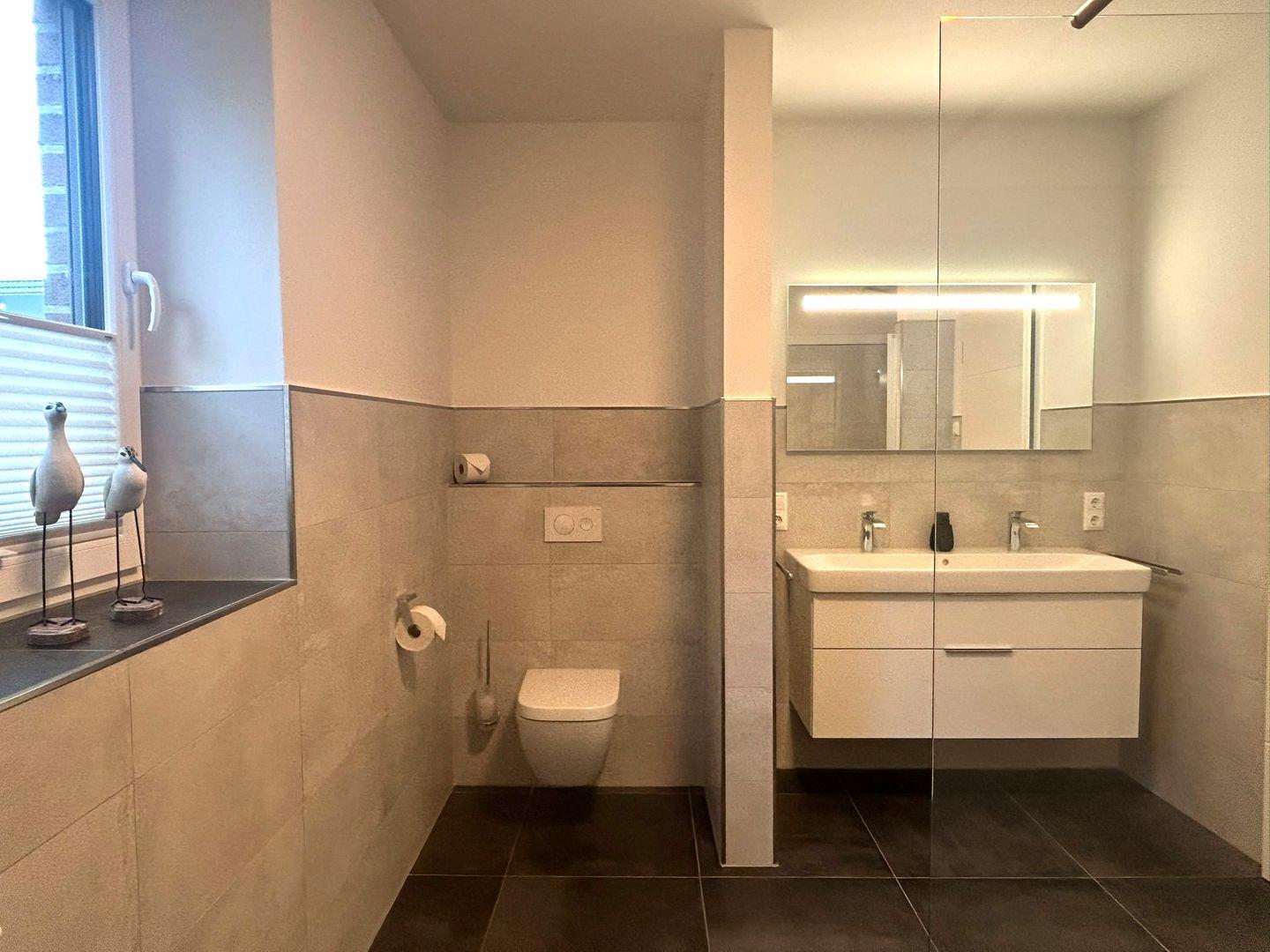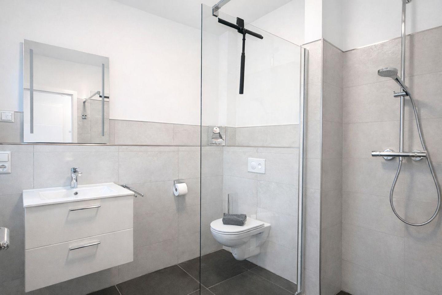 Duschbad im EG: bodentiefe, barrierefreie Regendusche, Waschtischanlage mit Spiegel, WC, Handtuchheizung, Haartrockner