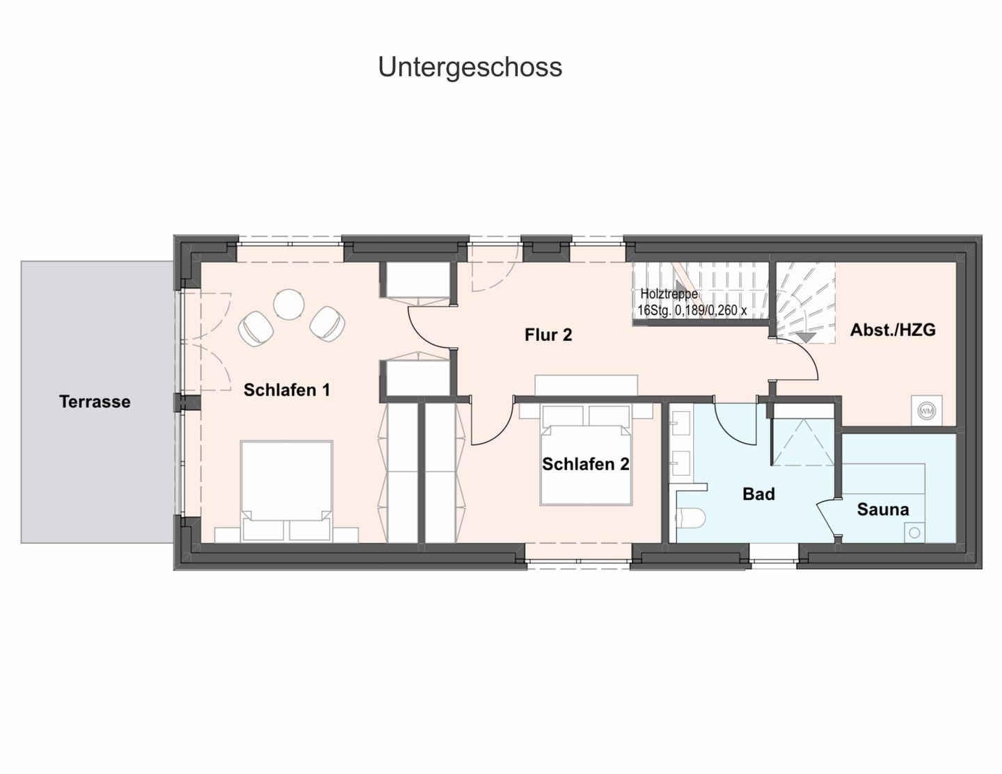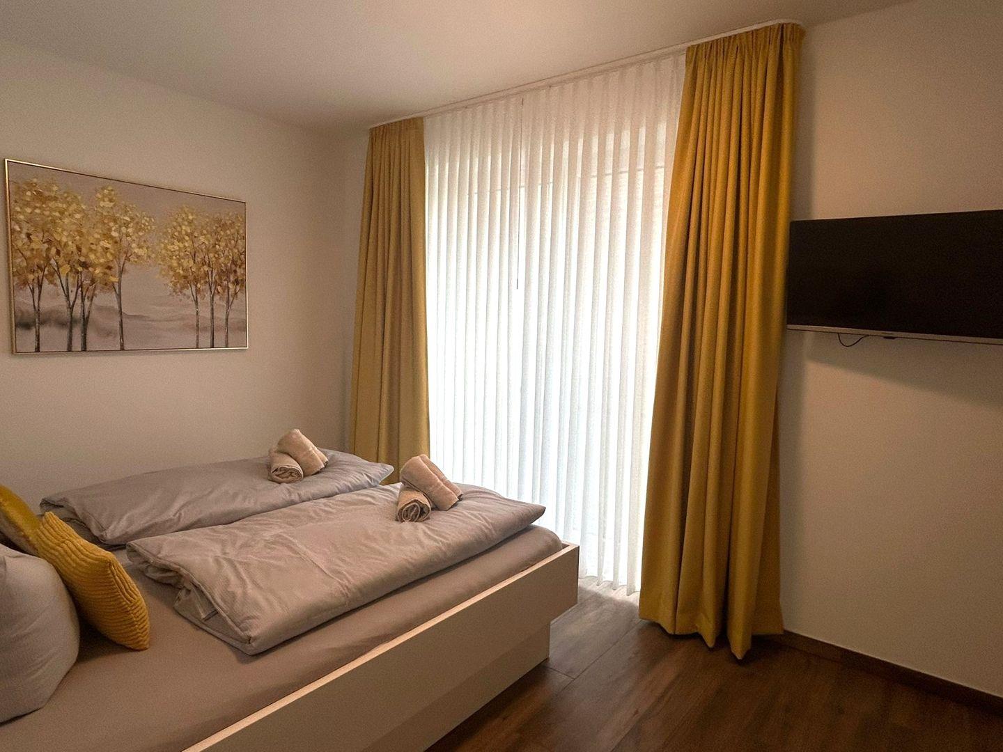 Schlafzimmer 2 UG: Doppelbett (2 einzelne Matratzen à 90x200 cm), Nachttische, Leselampen, Kleiderschrank, Smart-TV, Verdunklungsmöglichkeit durch Vorhang