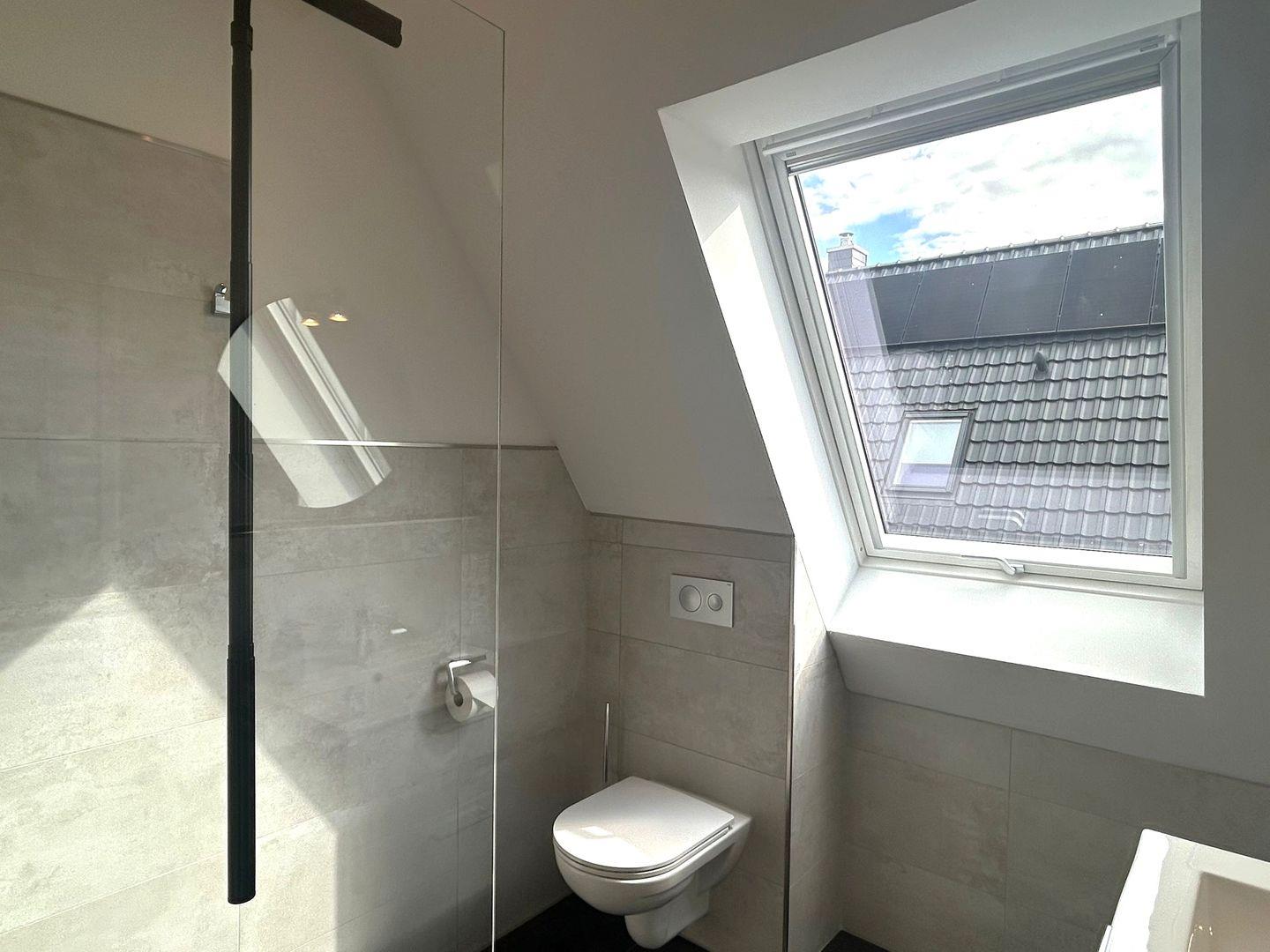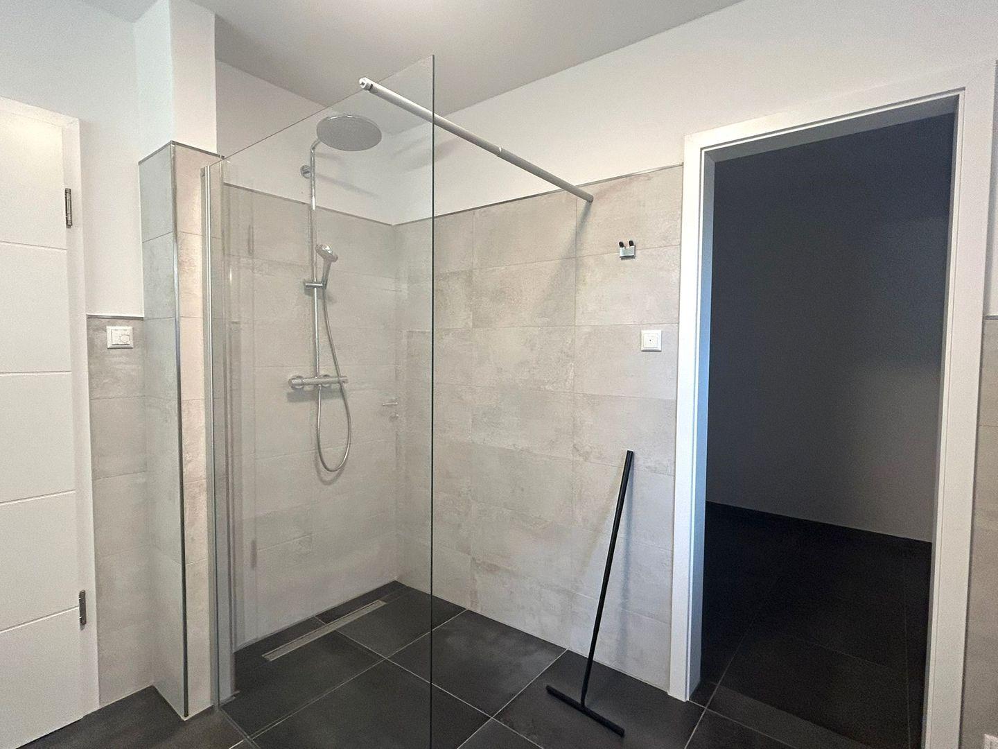 Duschbad im UG: bodentiefe, barrierefreie Regendusche, Waschtischanlage mit Spiegel, WC, Handtuchheizung, Haartrockner