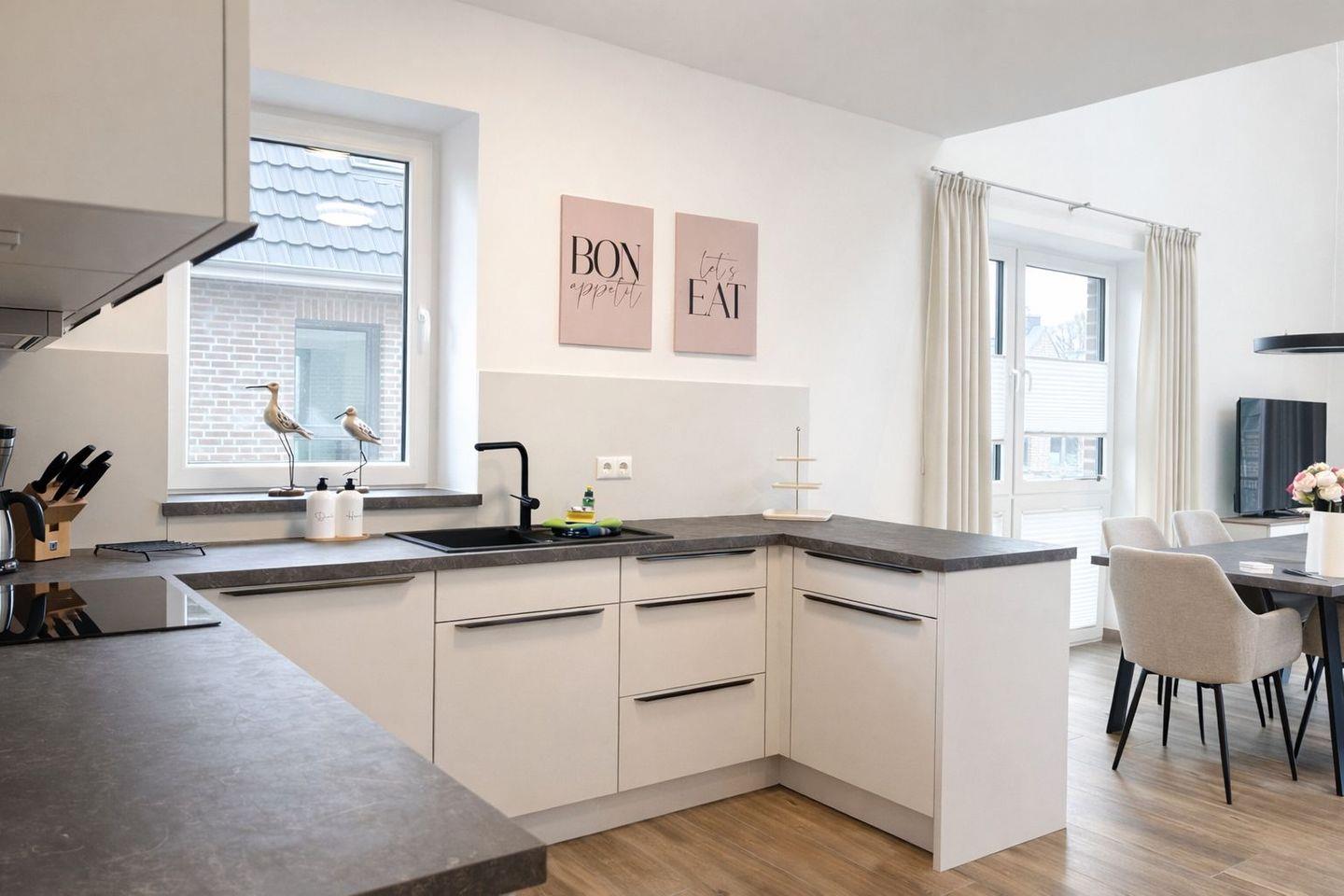 Die Küche ist umfassend ausgestattet und auf eine bequeme Selbstversorgung ausgerichtet. Vorhanden sind unter anderem Cerankochfeld, Backofen, Mikrowelle, Kühlschrank, extra Gefrierschrank, Spülmaschine, Kaffeemaschine, Wasserkocher, Toaster, Mixer sowie Geschirr, Besteck und Küchenutensilien.