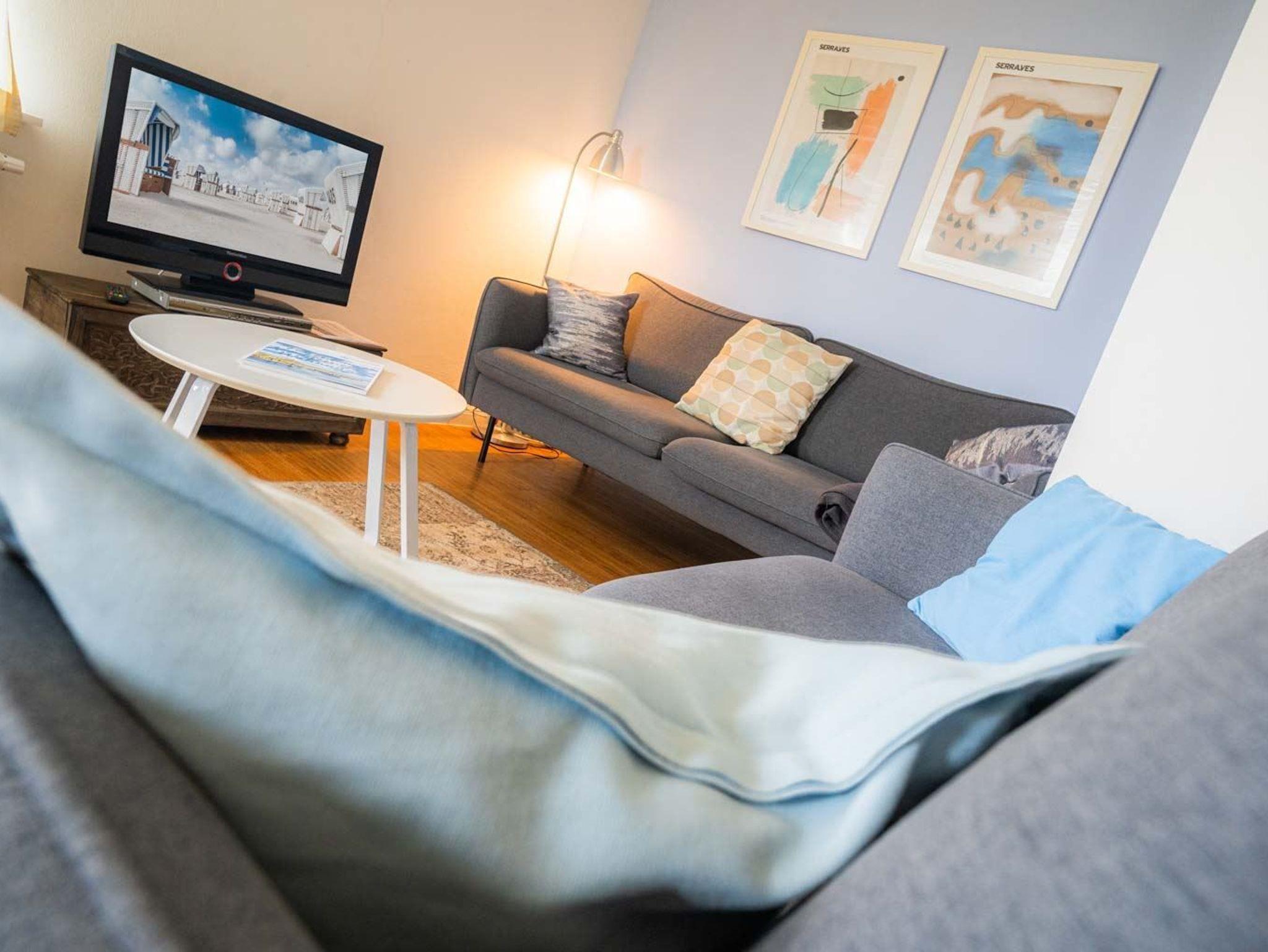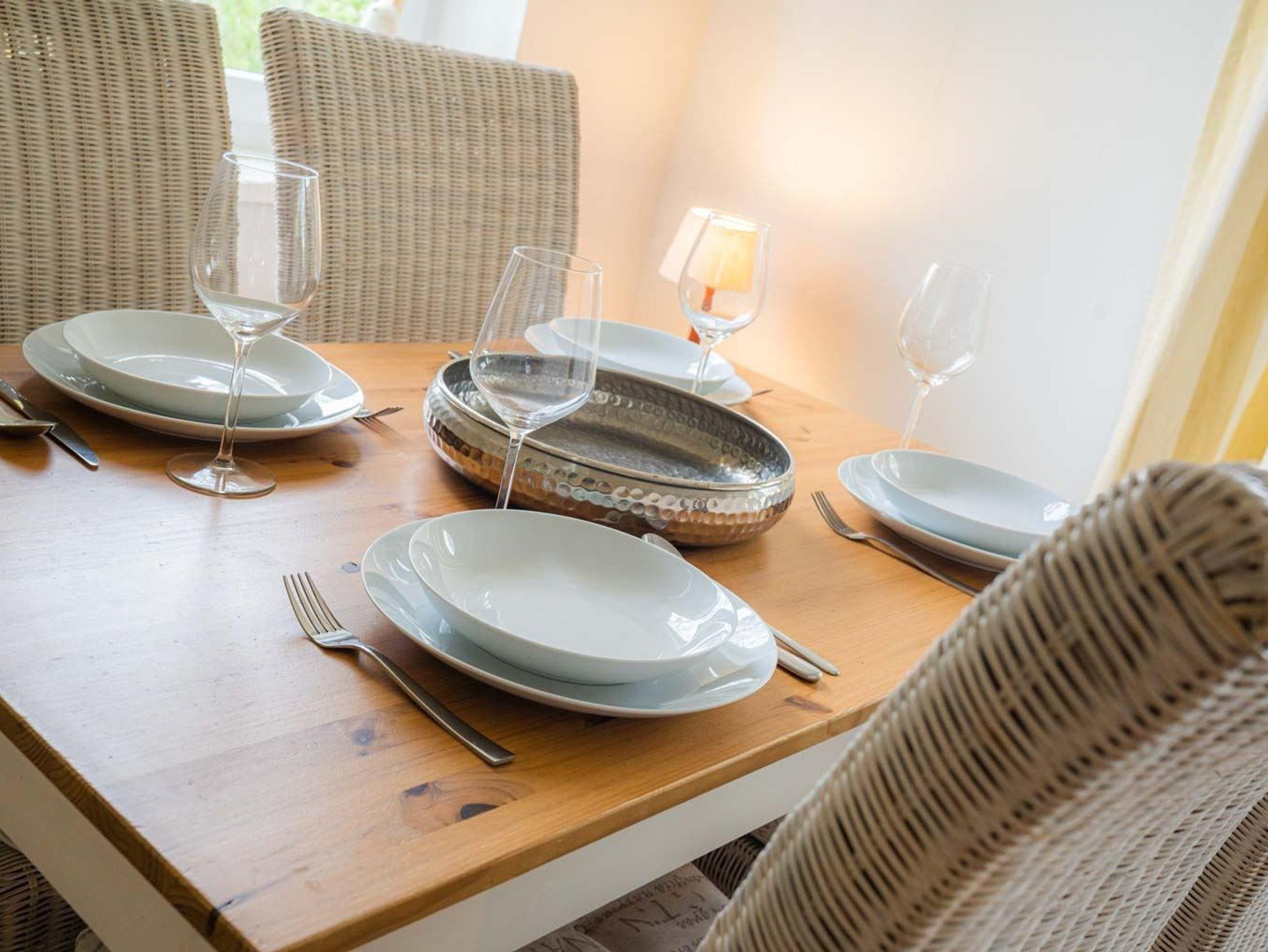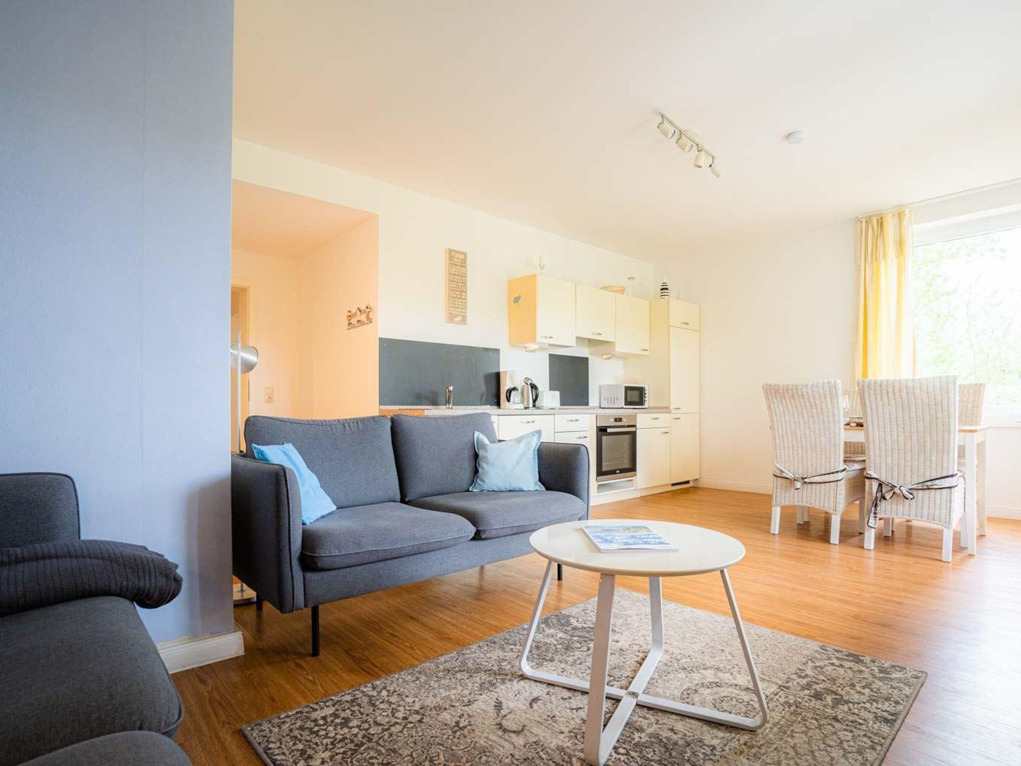 Wohnzimmer mit 2 Sofas, TV (Sat) mit DVD-Player und Esstisch mit 4 Stühlen. Kostenloses WLAN. Direkter Zugang zur möblierten Garten-Terrasse nach Süden. Offene Küche mit Backofen, Mikrowelle, Geschirrspüler und Kühlschrank mit Gefrierfach.