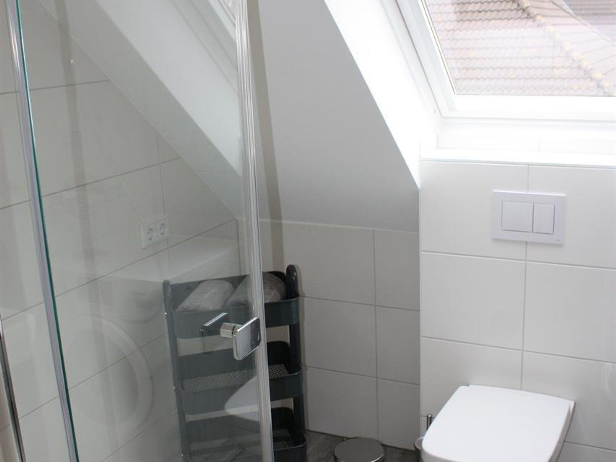 Auch das Badezimmer wurde komplett erneuert, ist hell und modern gestaltet und verfügt neben WC und Dusche auch über eine Waschmaschine und einen Haarfön.