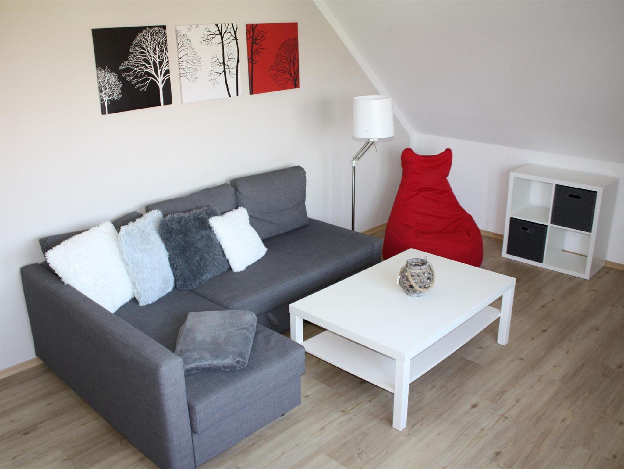 mit neuen Matratzen, ein großes Wohnzimmer mit Schlafcouch (140x200cm) und einer gemütlichen Lounge-Ecke, einem SAT-Flachbild-Fernseher und einer Musikanlage.