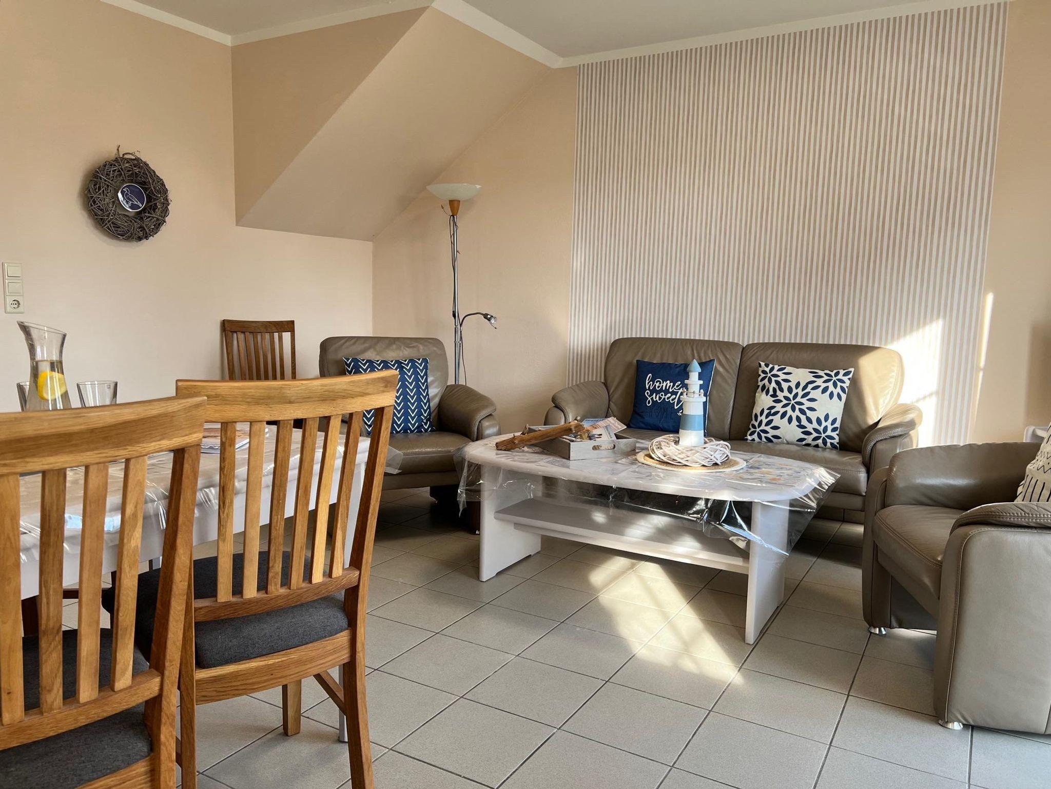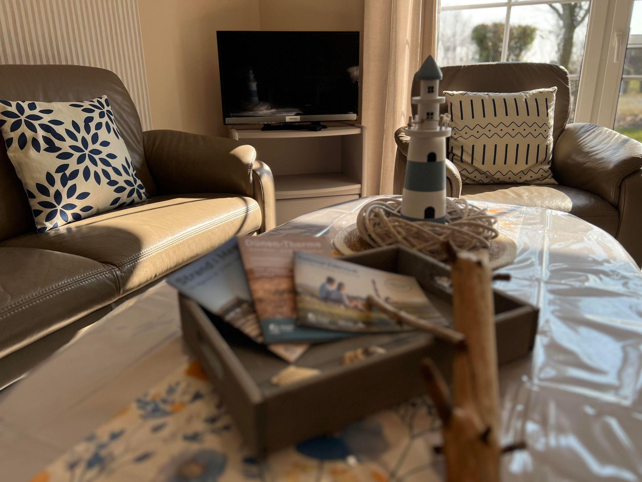 Im Wohnraum finden Sie eine schöne Ledermöbelgarnitur (Sitzecke), die zum Ausruhen einlädt.