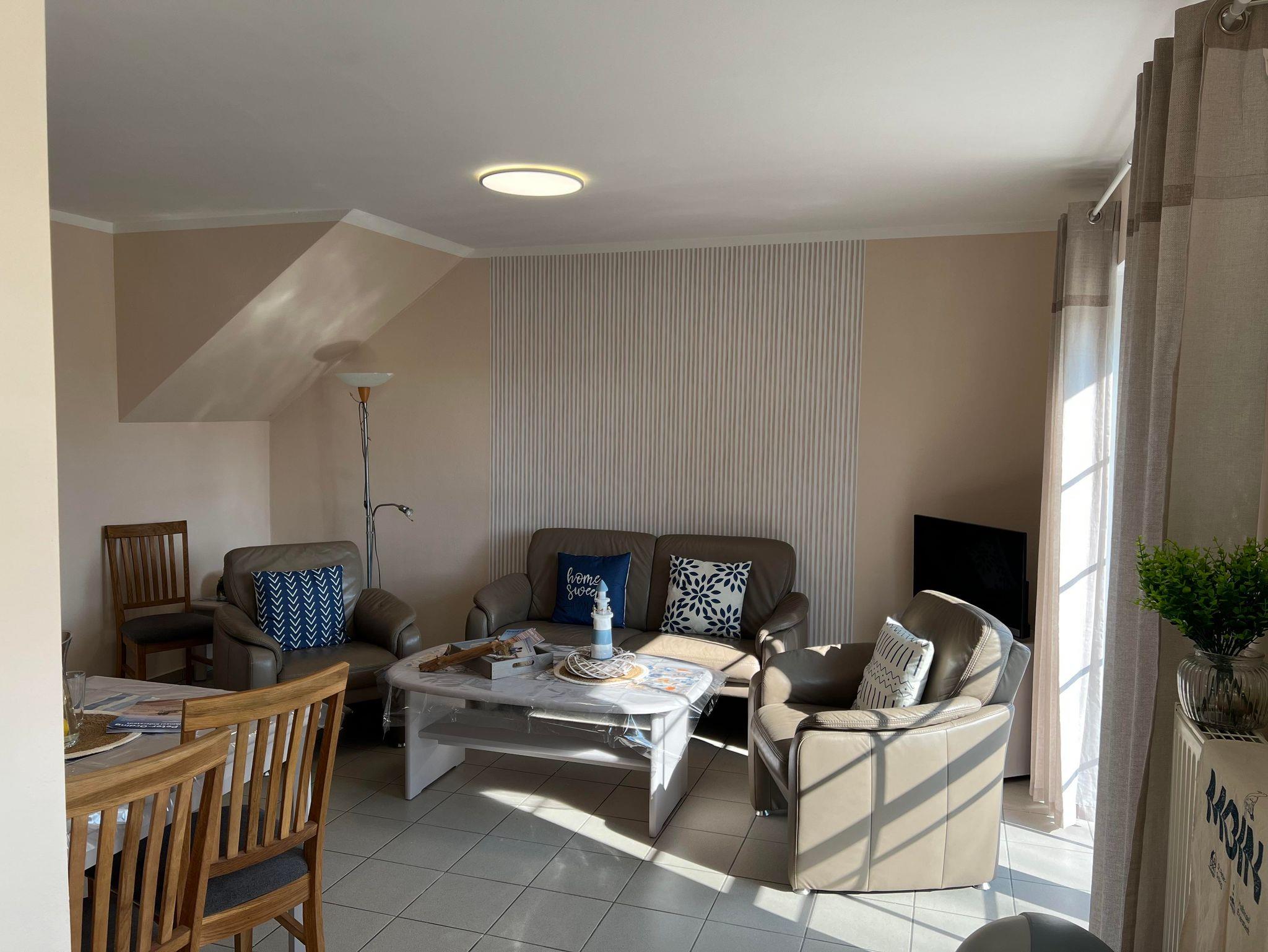 Im Wohnraum finden Sie eine schöne Ledermöbelgarnitur (Sitzecke), die zum Ausruhen einlädt.