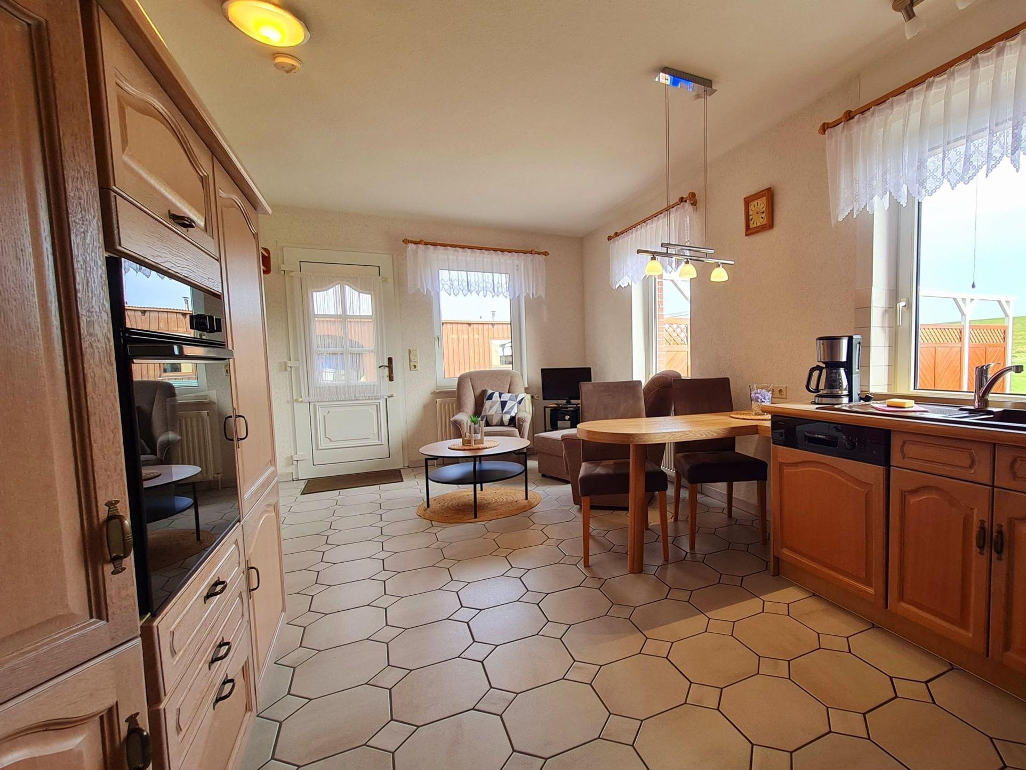 • Wohnraum mit gemütlicher Sitzecke und Küchenzeile, ausgestattet u. a. mit einem Geschirrspüler