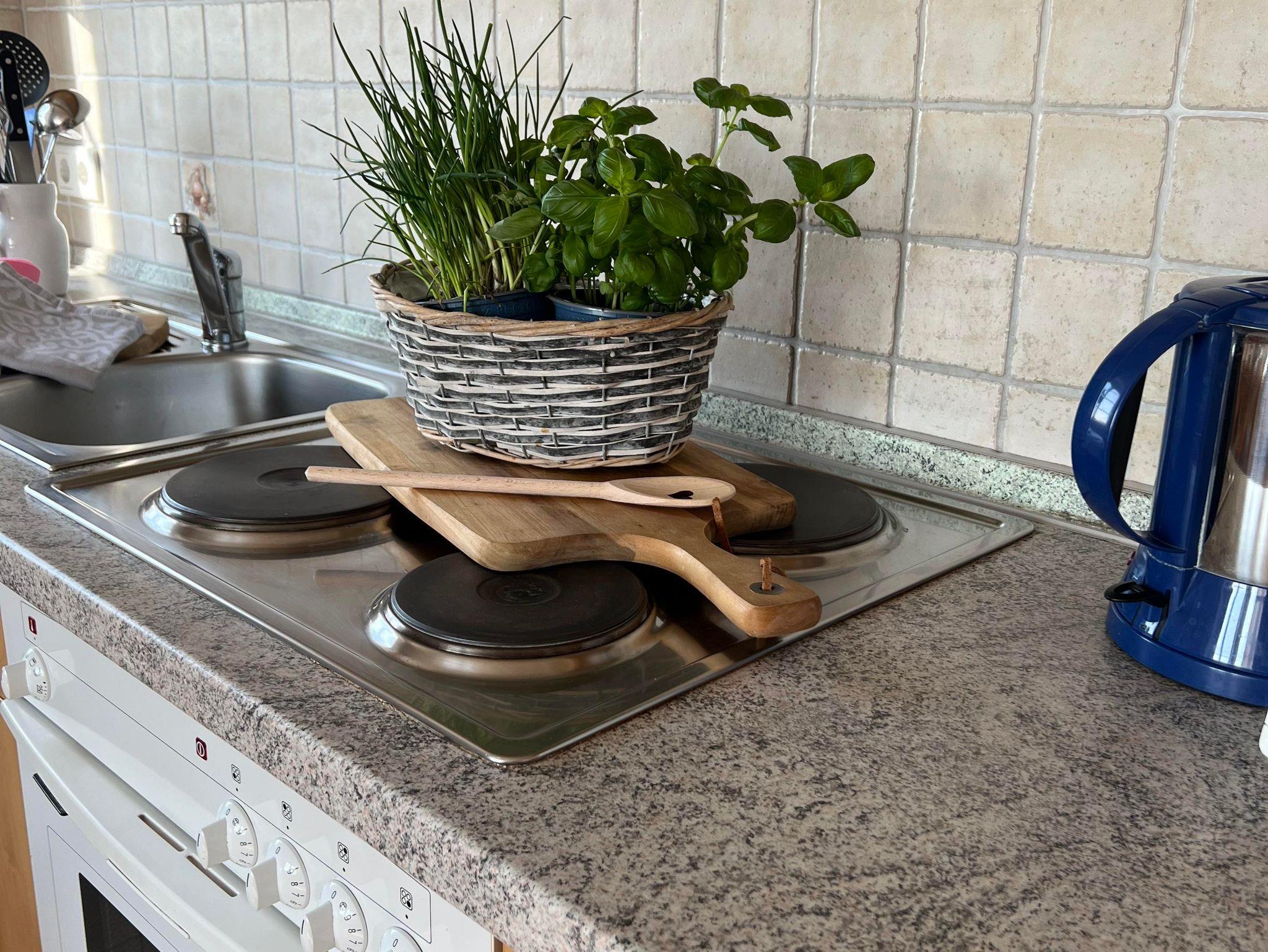 Für den kulinarischen Genuss sorgt eine Einbauküche mit Geschirrspüler und einer Mikrowelle.