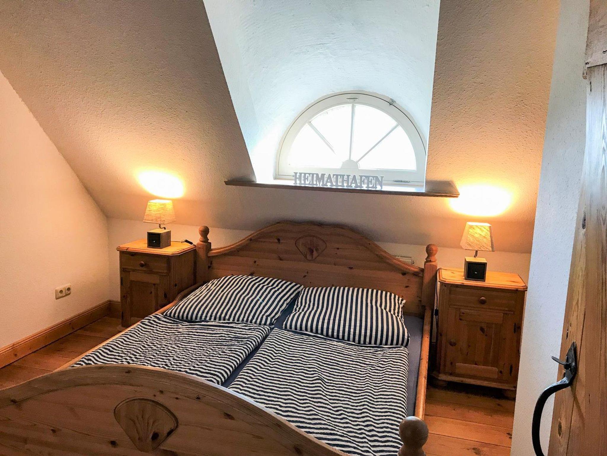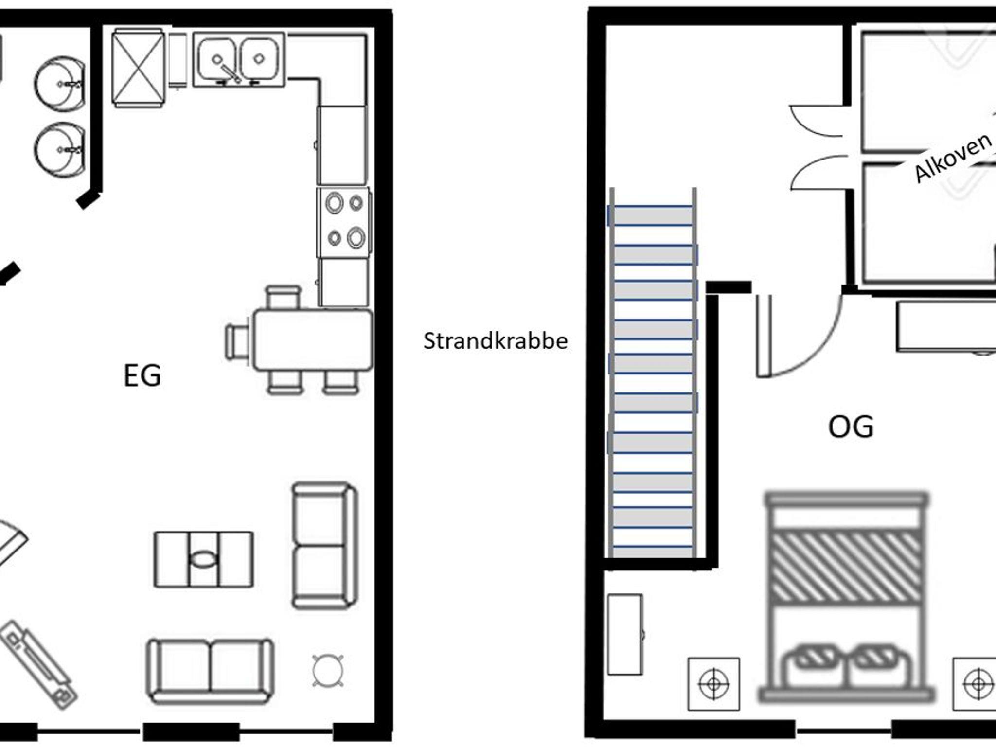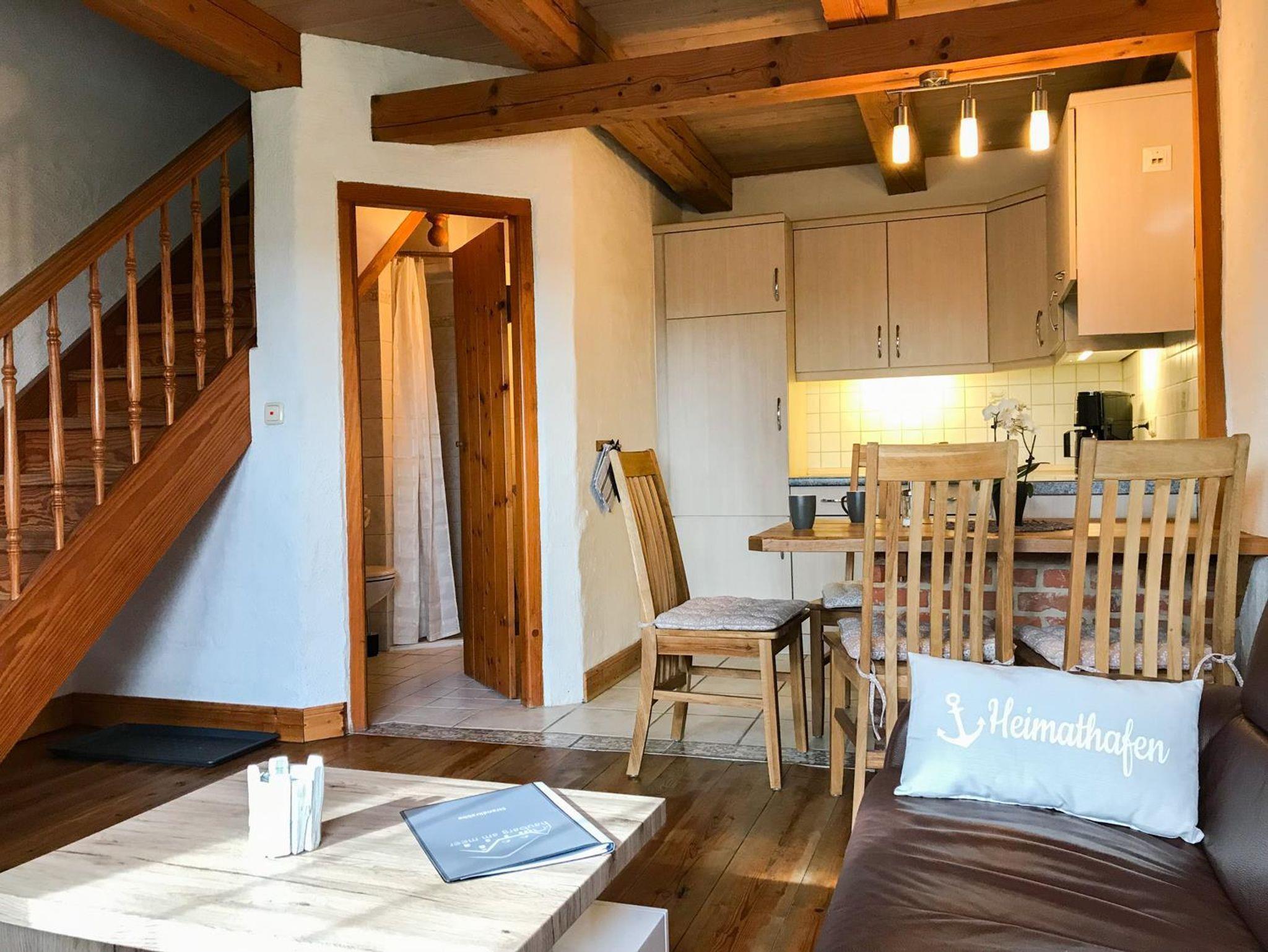 Ein einladender Wohn-Essbereich mit offener Küche lädt zum Verweilen ein in der Ferienwohnung Strandkrabbe in unserem haubarg am meer. Das Bad wurde 2022 komplett erneuert. In das obere Stockwerk gelangt man über die massive Holztreppe zu dem Schlafzimmer mit Doppelbett sowie getrennt davon zur Schlafmöglichkeit für die Kinder in einem Alkoven (Nachbildung einer historischen Doppelalkove mit zwei normal großen Matratzen).