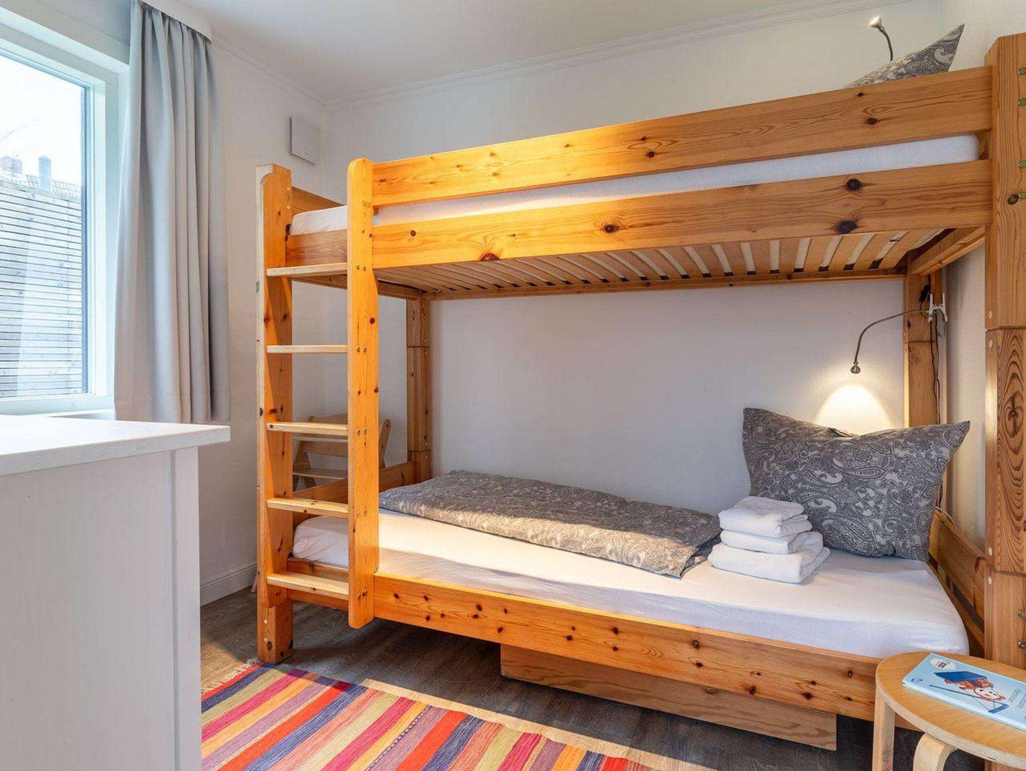 Das kinderfreundliche Schlafzimmer ist mit einem Doppelstockbett und einer Kommode ausgestattet, ideal für junge Gäste.