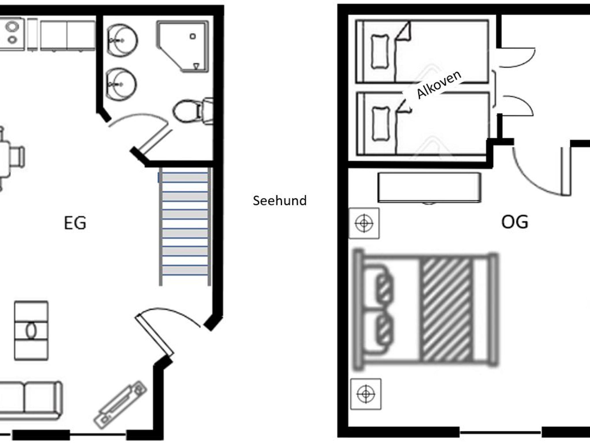 Über zwei Etagen erstreckt sich die Ferienwohnung Seehund im haubarg am meer. In der ersten Etage geht es zur Nachtruhe in das Schlafzimmer mit Doppelbett und davor für die Kinder in den Alkoven (entspricht in der Größe einem Doppelbett).