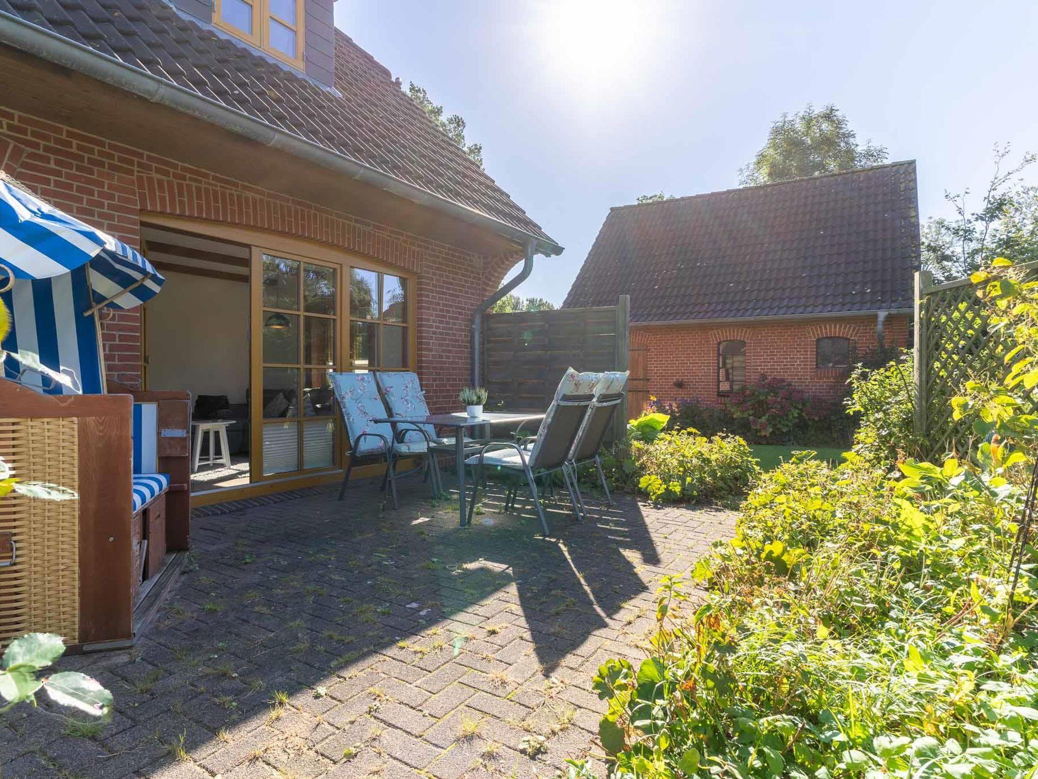 Gemütliches Landhaus Liebheimelig in Vollerwiek an der Nordsee mit Terrasse und Strandkorb.