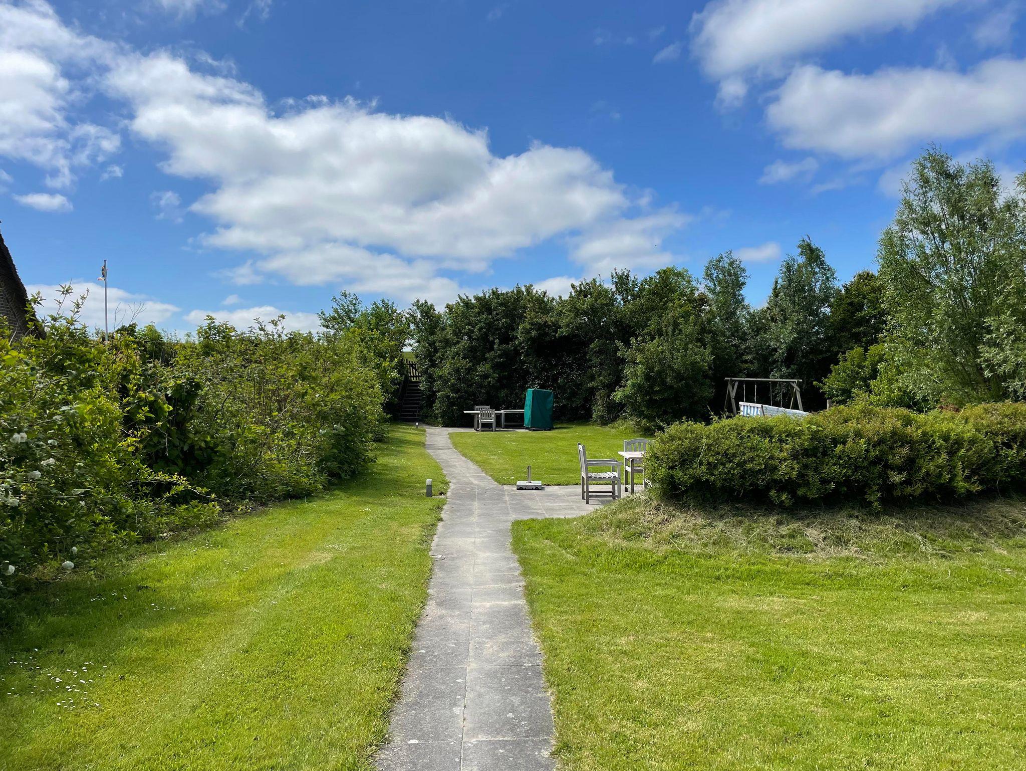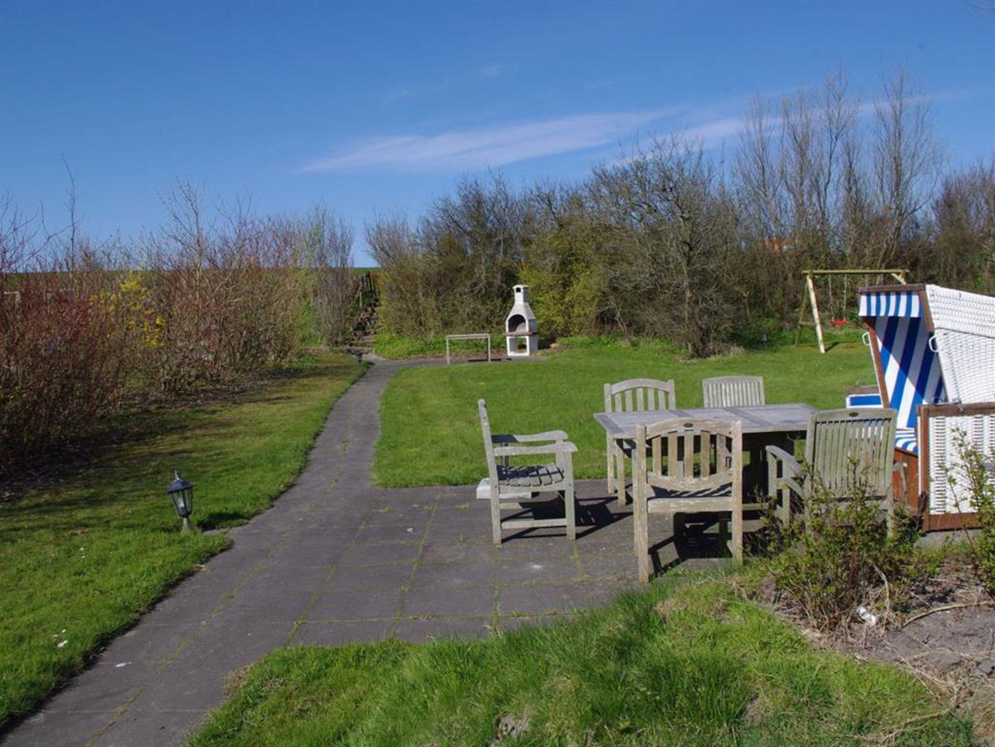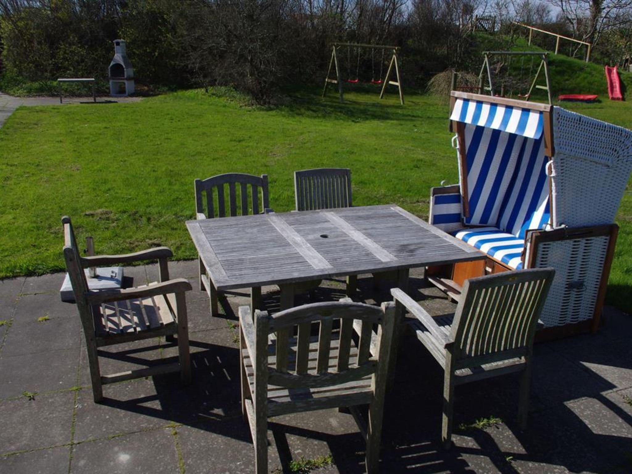 Im großen Garten gibt es einen eigenen Deichzugang. Sie finden zwei Terrassen, einen Strandkorb und einen Spielplatz für die Kids,