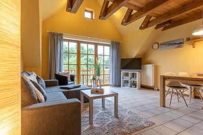 Die ca. 65qm große Wohnung befindet sich im 1. OG des Hauses und bietet Platz für 4 Personen. In der ersten Etage befindet sich ein geräumiges Duschbad und eine großzügige Wohnküche mit Kamin und Zugang zum möblierten Balkon. Über eine Holztreppe gelangen Sie in das 2. Obergeschoss und zu den Schlafräumen. Dort befindet sich ein Schlafzimmer mit einem Doppelbett ( 1,80 x 2,00m ) und ein Schlafzimmer mit zwei Einzelbetten.
