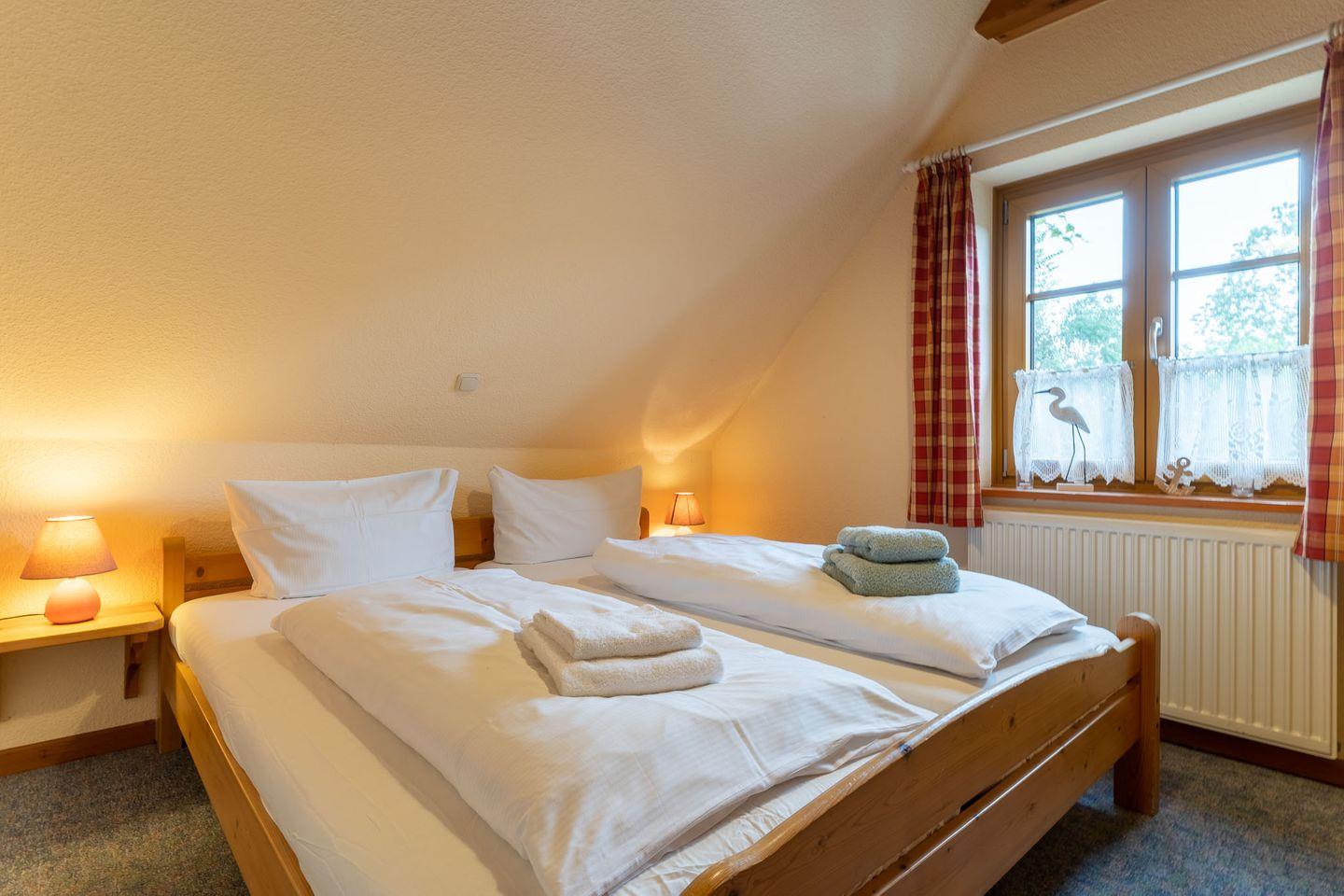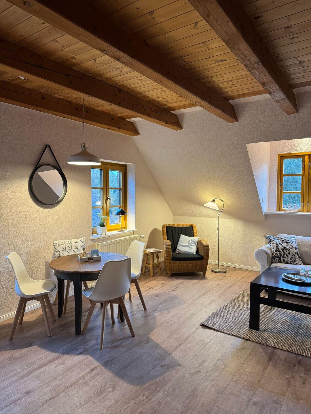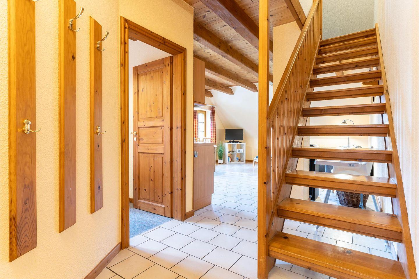 Die ca. 60qm große Wohnung befindet sich im 1. OG des Hauses und bietet Platz für 4 Personen. In der ersten Etage befindet sich ein Schlafzimmer mit Doppelbett, ein geräumiges Duschbad und eine großzügige Wohnküche mit Kamin. Über eine Holztreppe gelangen Sie in das 2. Obergeschoss und in ein weiteres Schlafzimmer mit zwei Einzelbetten.