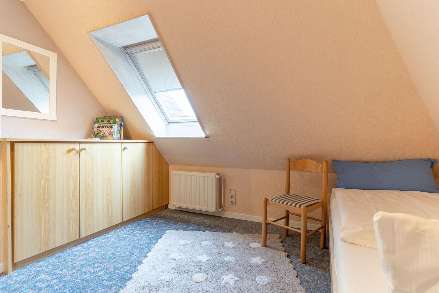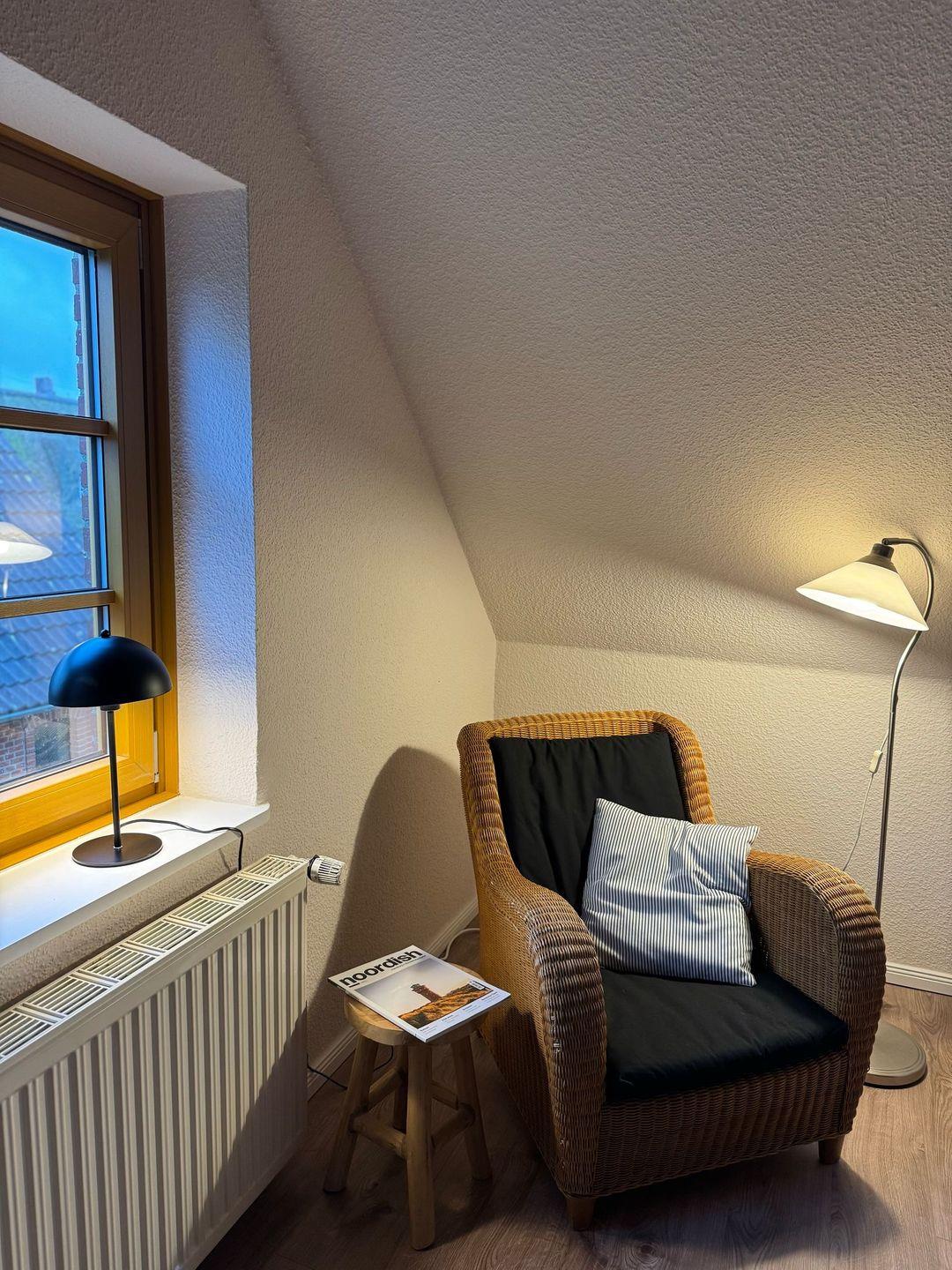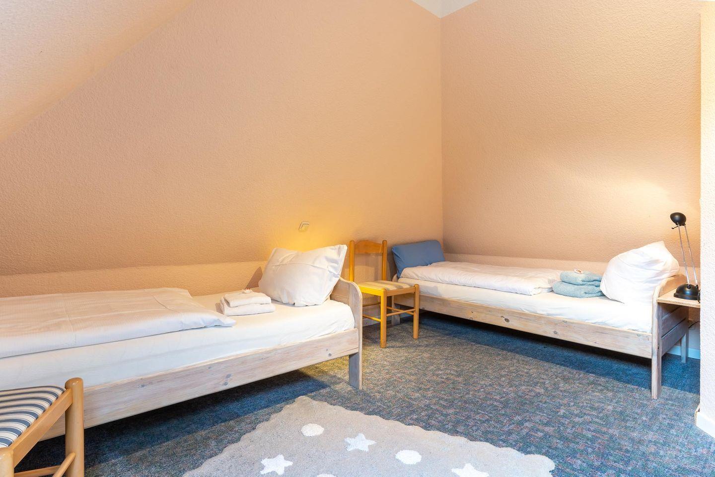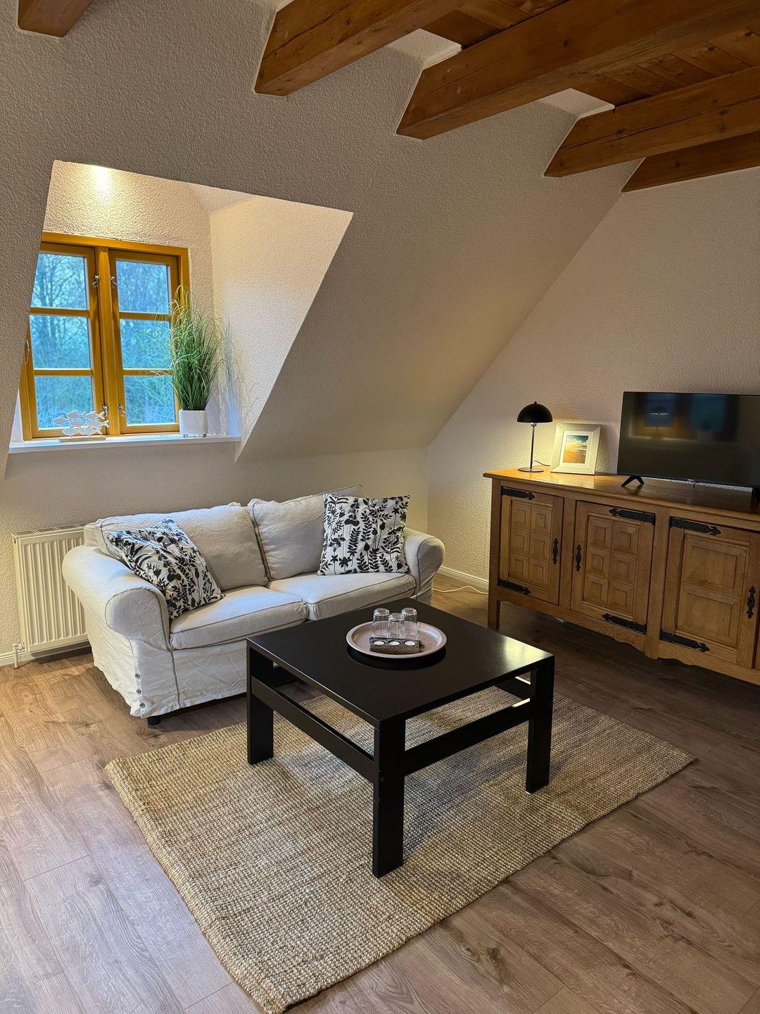 Die ca. 60qm große Wohnung befindet sich im 1. OG des Hauses und bietet Platz für 4 Personen. In der ersten Etage befindet sich ein Schlafzimmer mit Doppelbett, ein geräumiges Duschbad und eine großzügige Wohnküche mit Kamin. Über eine Holztreppe gelangen Sie in das 2. Obergeschoss und in ein weiteres Schlafzimmer mit zwei Einzelbetten.