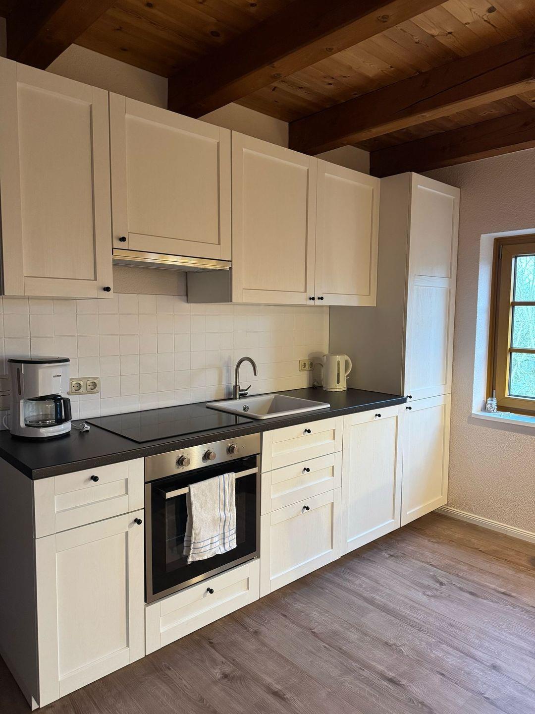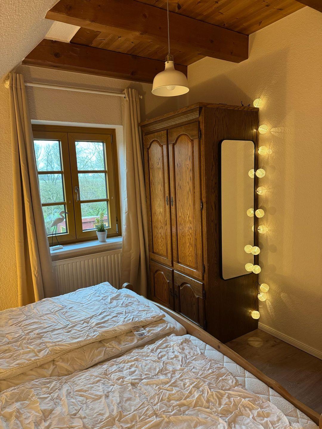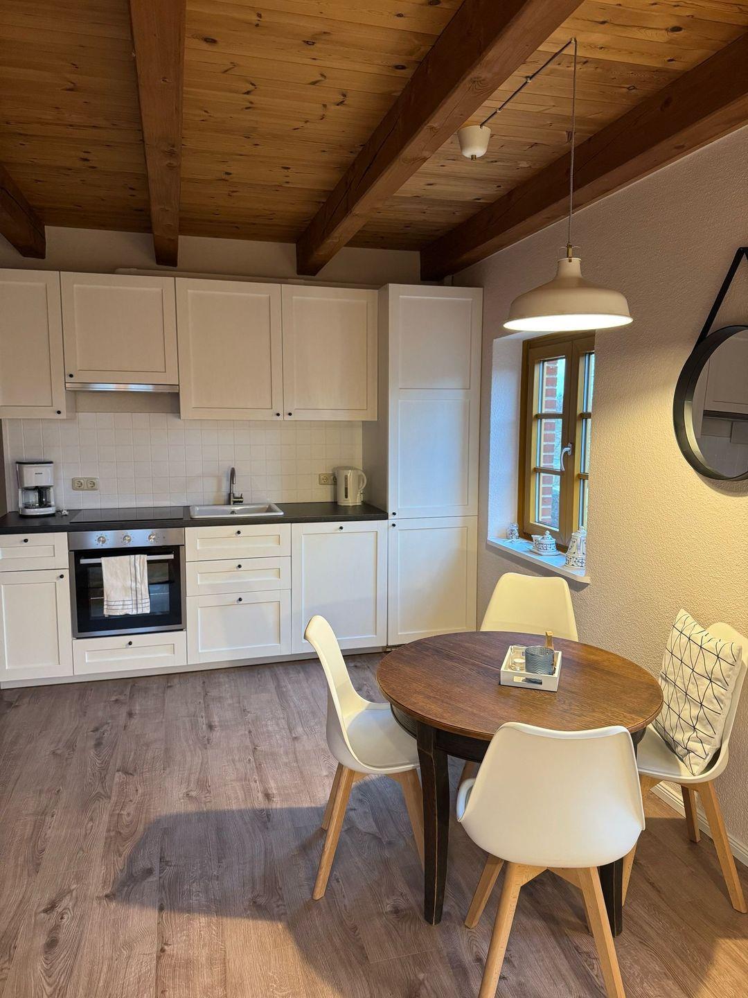 Die ca. 60qm große Wohnung befindet sich im 1. OG des Hauses und bietet Platz für 4 Personen.in der ersten Etage befindet sich ein Schlafzimmer mit Doppelbett, ein geräumiges Duschbad und eine großzügige Wohnküche mit Kamin.Über eine Holztreppe gelangen Sie in das 2. Obergeschoss und in ein weiteres Schlafzimmer mit zwei Einzelbetten.