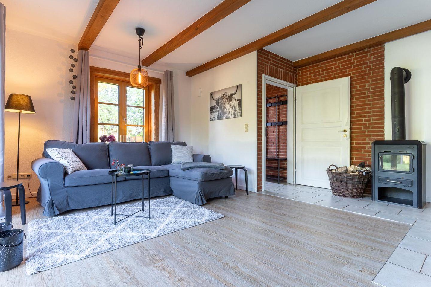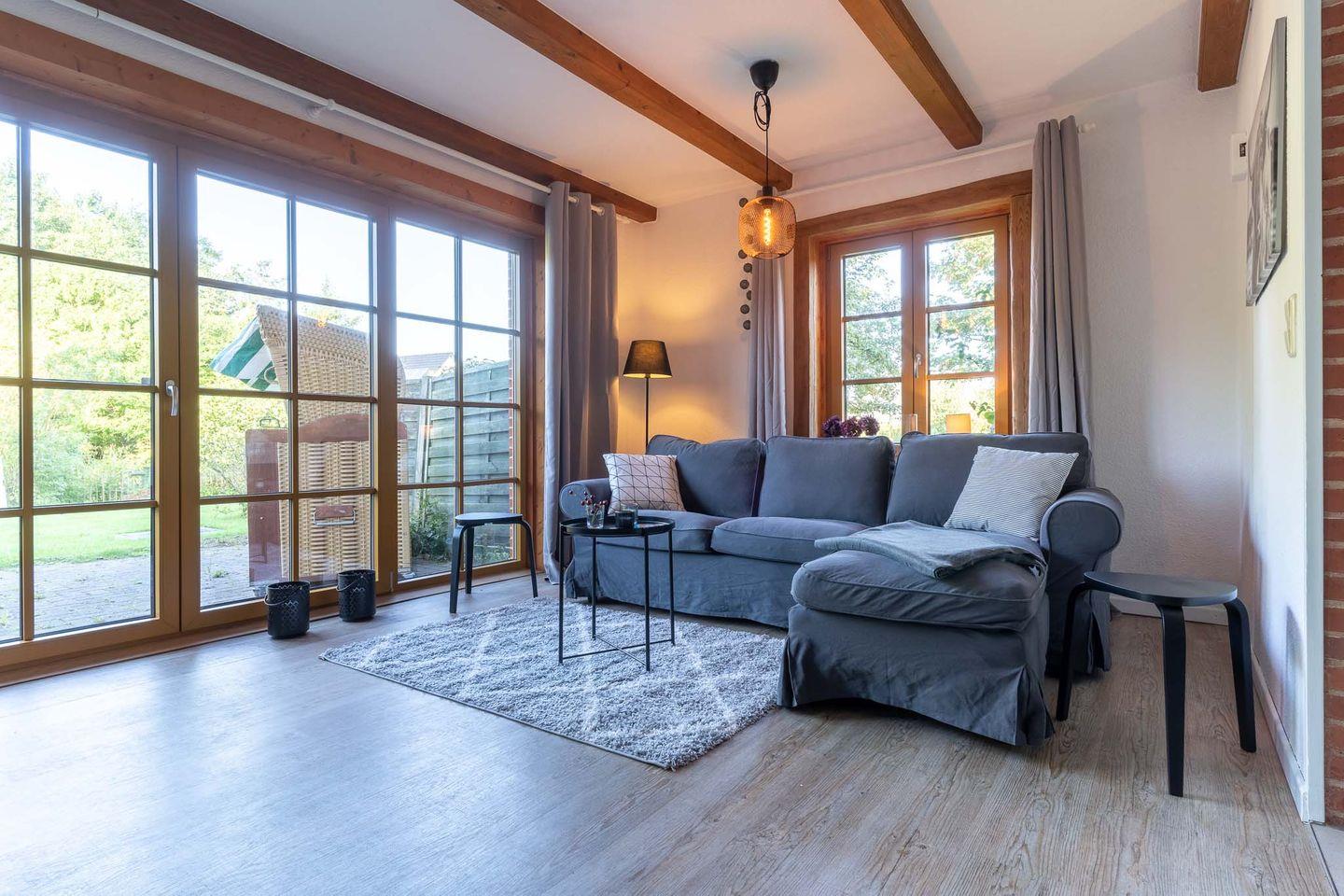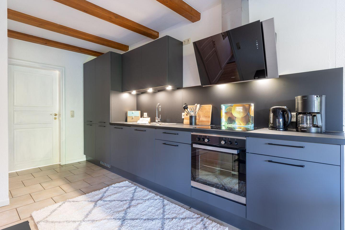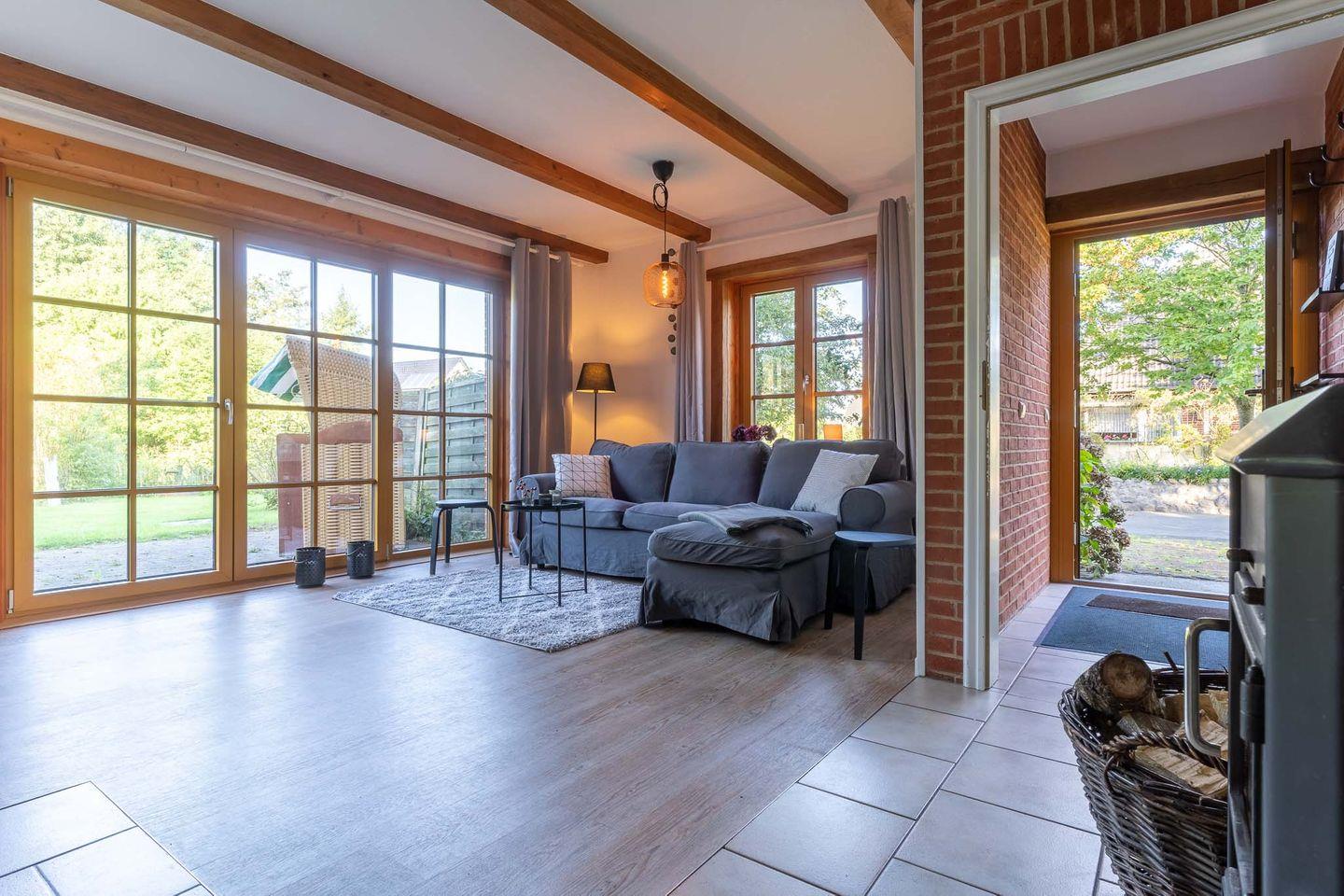 Die großzügige Wohnküche ist das Herzstück der Wohnung und bietet Ihnen alles, was Sie für einen gemütlichen Aufenthalt benötigen. Hier finden Sie nicht nur eine voll ausgestattete Küche, sondern auch einen Kamin, der an kühlen Abenden für eine angenehme Wärme sorgt. Vom Essbereich aus haben Sie direkten Zugang zur möblierten Terrasse mit Strandkorb. Hier können Sie die frische Luft genießen und den Blick in den großen Garten schweifen lassen.