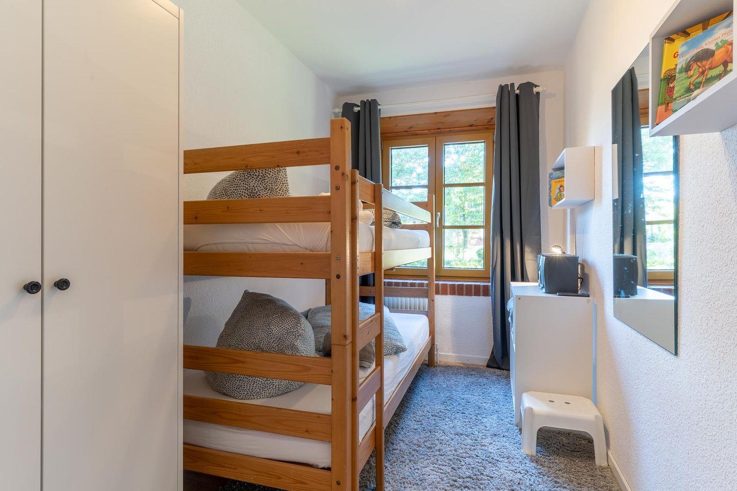 Beim Betreten der Wohnung werden Sie von einer einladenden Atmosphäre empfangen. Der gemütliche Schlafraum mit einem Doppelbett lädt zum Entspannen und Träumen ein. Der zweite Schlafraum ist mit einem Etagenbett ausgestattet und bietet ausreichend Platz für Kinder oder Freunde.