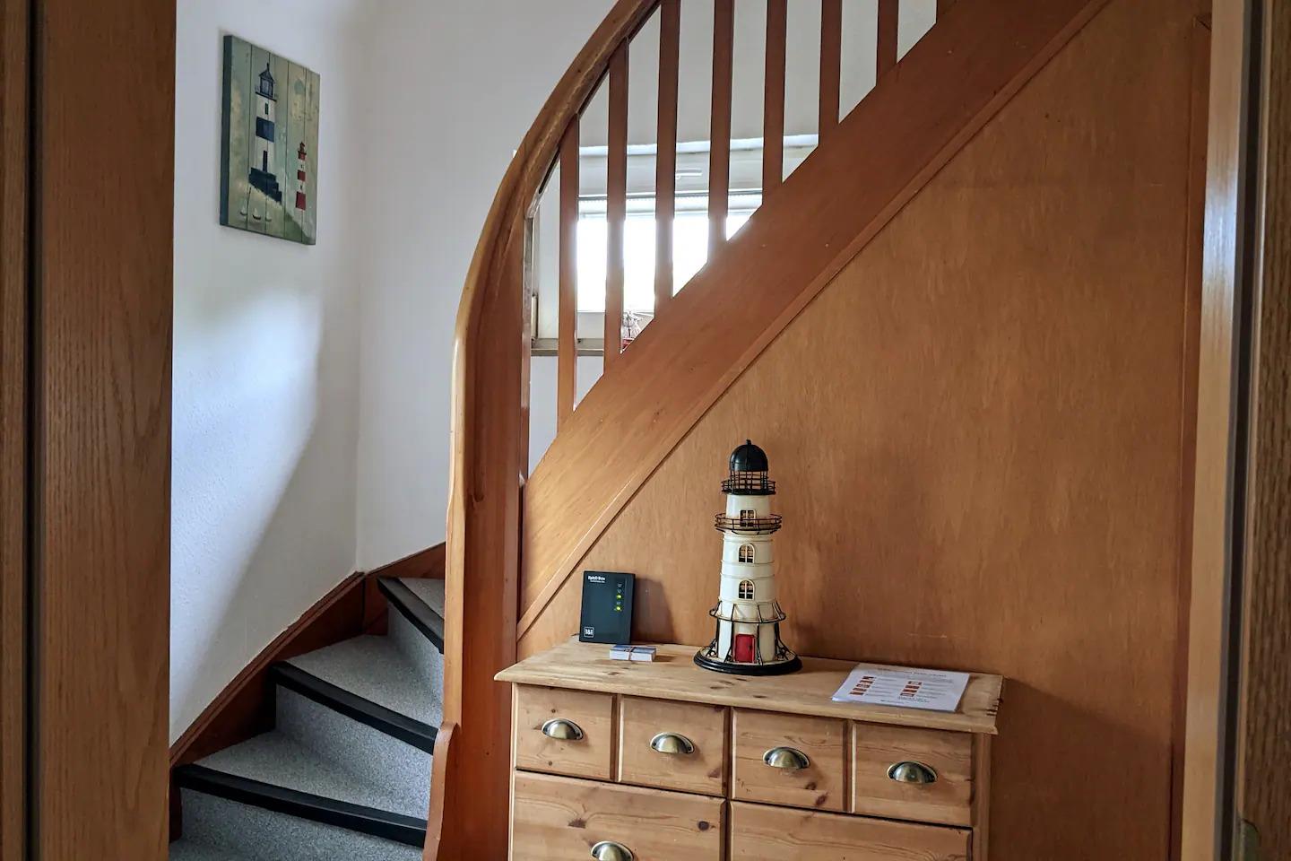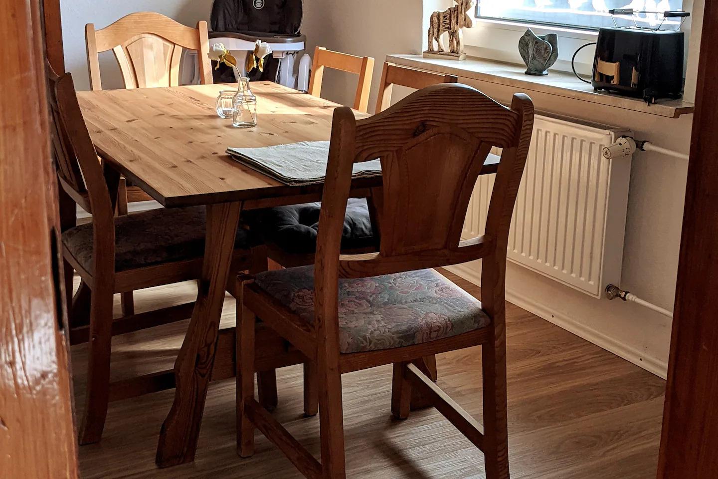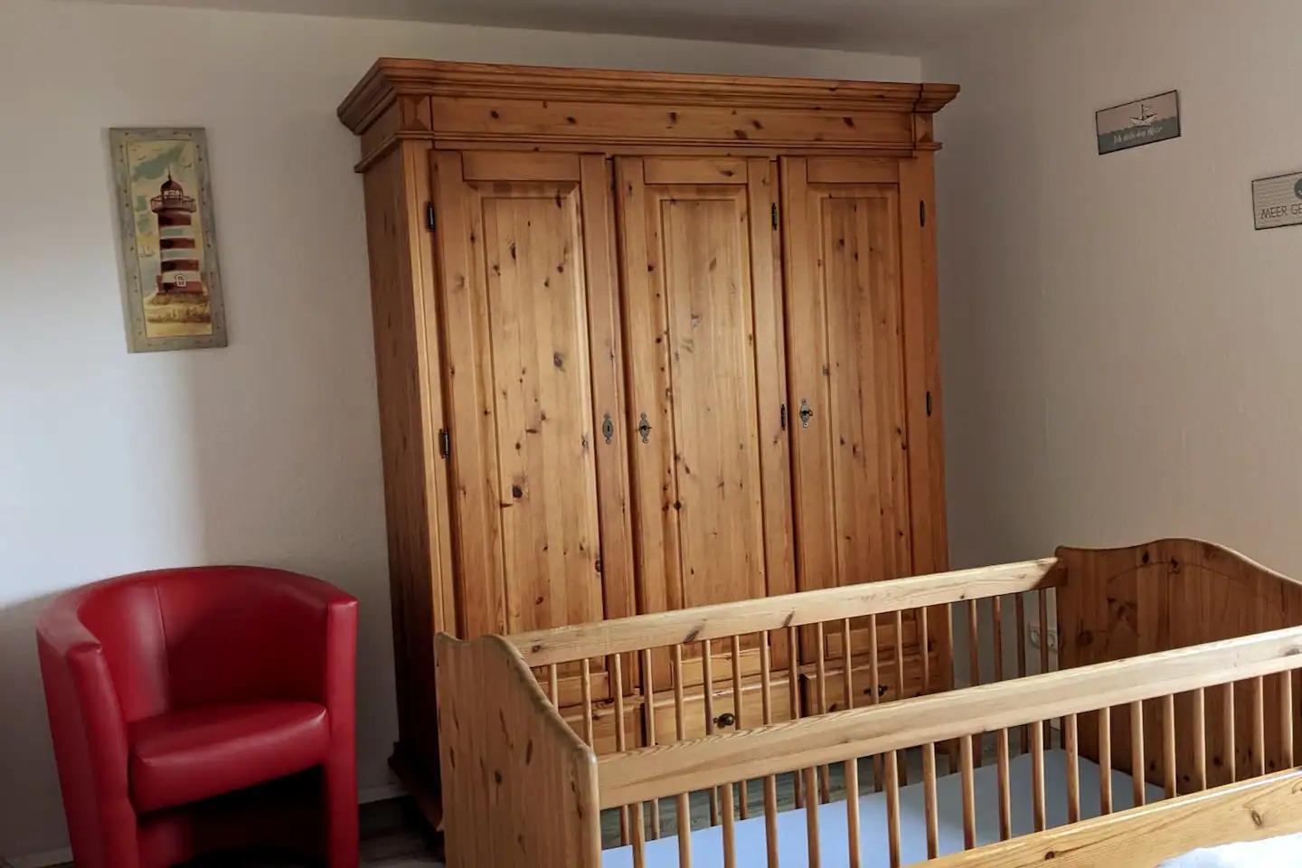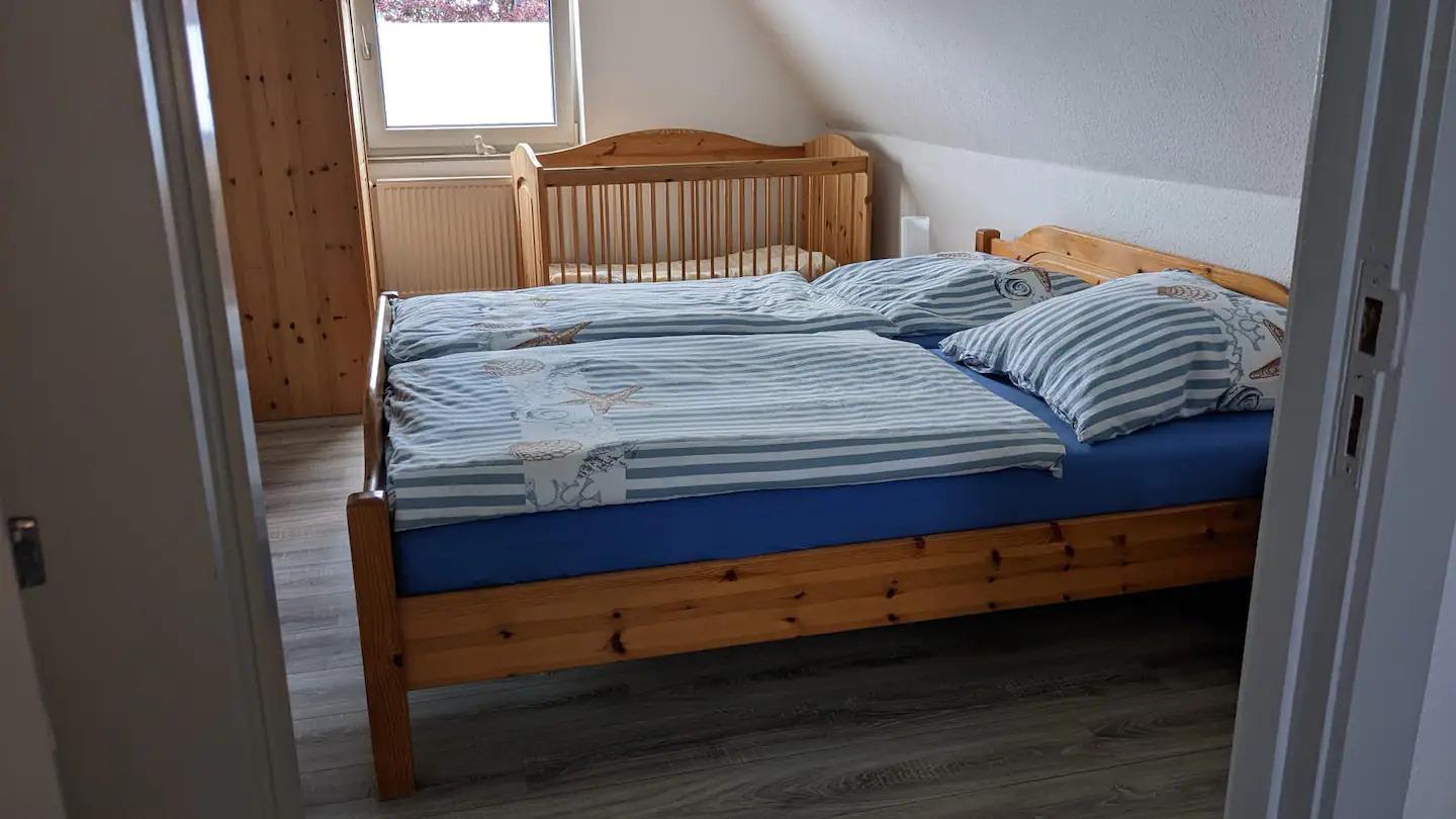 In Ober .-und Untergeschoss jeweils ein Elternschlafzimmer mit Kinderbett. Wickelkommode ,Hochstuhl (2 auf Wunsch),Heizstrahler für Babys ,wenn erforderlich .Für Kinder kann ein Rausfallschutz am Bett angebracht werden .Es befindet sich in allen oberen Schlafzimmern ein Fernseher. In der Küche steht für Gefriergut ein Gefrierschrank mit 3 großen Fächern. Im großen komplett eingezäunten Garten lädt ein Strandkorb oder Liegestuhl zum verweilen ein. Ein möbliertes Gartenhaus kann beim Grillen genutzt werden. Die Terrasse ist windgeschützt und ausgestattet mit einem großen Tisch und gemütlichen Stühlen. Eine Tischtennisplatte und Kinderfahrzeuge sind in der Garage. Ein Sandkasten mit darin befindlichen Spielsachen darf nicht fehlen.3 Fahrräder ohne Motor dürfen gerne genutzt werden. Am Ende der Straße,ca.300m ist ein schöner Kinderspielplatz. Wir sind ihre direkten Nachbarn, immer erreichbar und versuchen mit allem auszuhelfen.