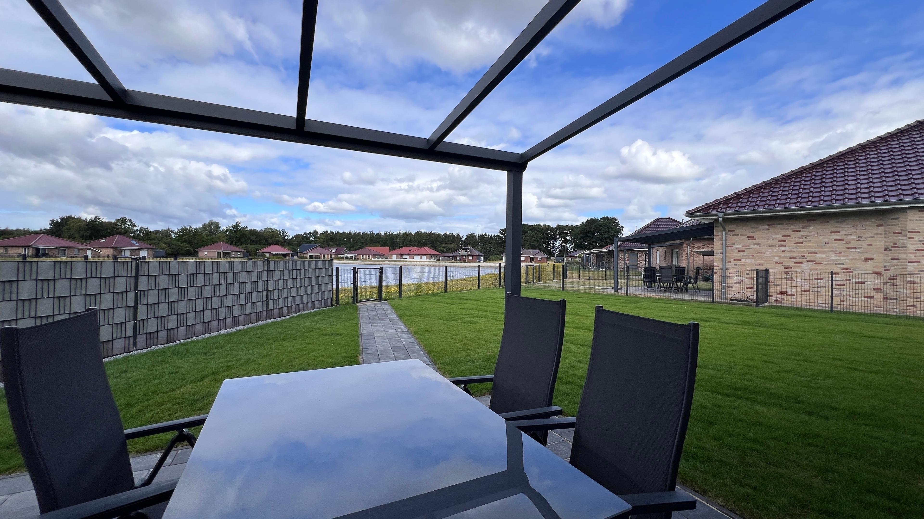 Die Terrasse ist durch eine Überdachung mit einer Größe von 15 qm gegen Regen und Wind geschützt.