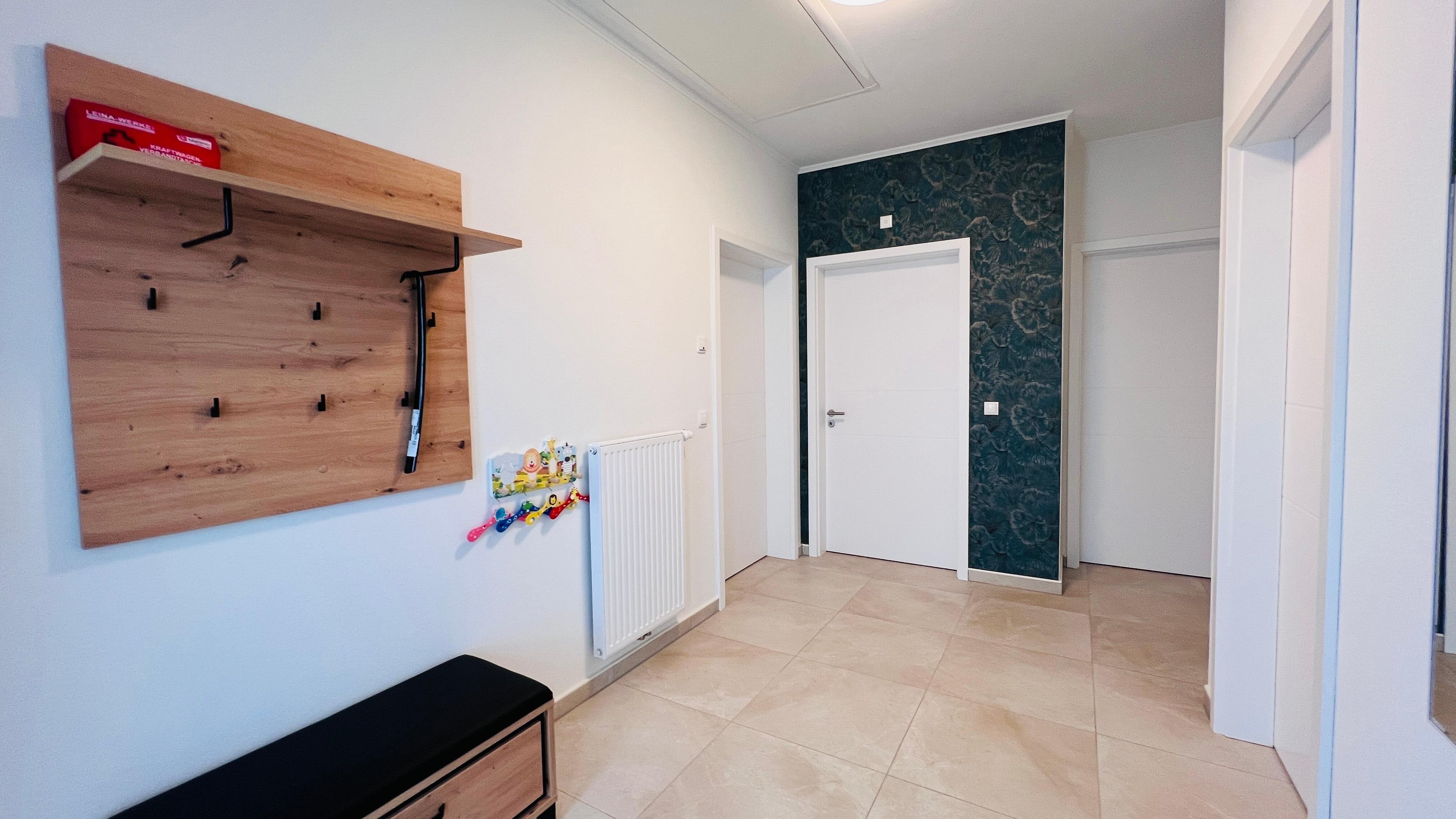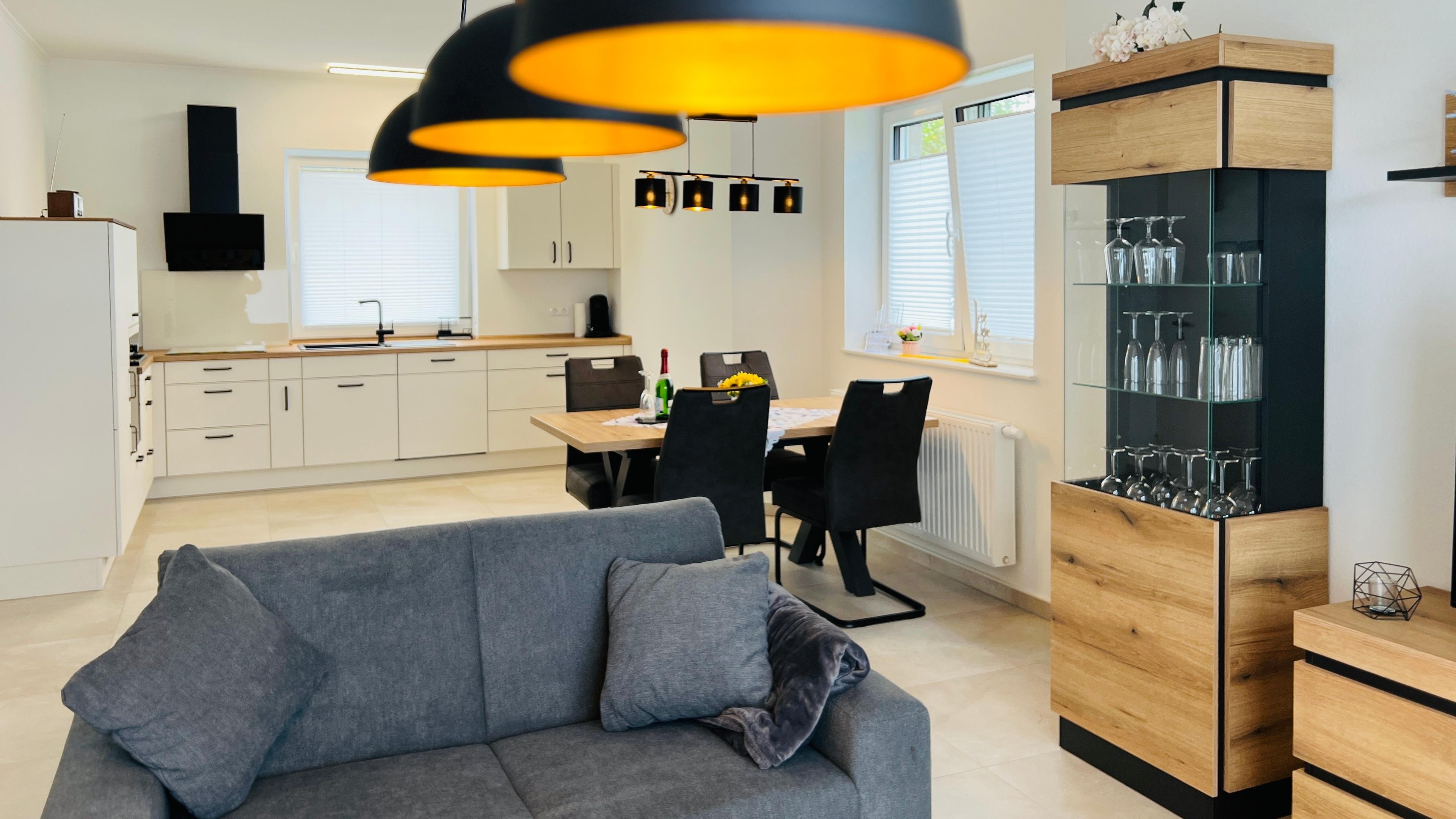 Das Herzstück des Hauses ist das Wohnzimmer mit einer offenen modernen Küche kombiniert sowie einer großzügigen Essecke. Im Haus sind große Fenster die viel Licht in die Räume lassen.