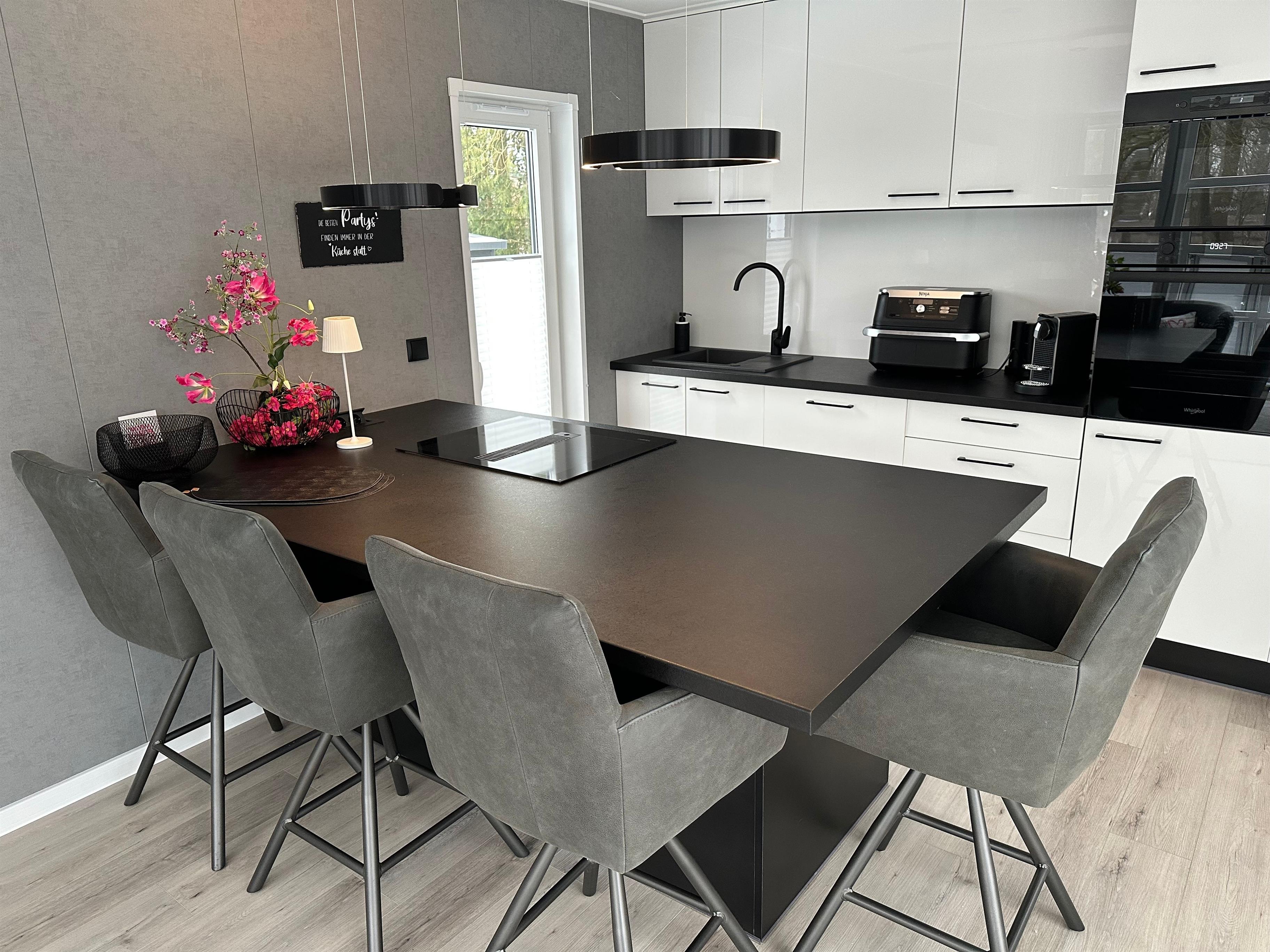 Die moderne Küche mit Kochinsel ist vollständig ausgestattet und fügt sich perfekt in den offenen Wohnbereich ein – ideal für gemeinsame Kochabende und gesellige Stunden.