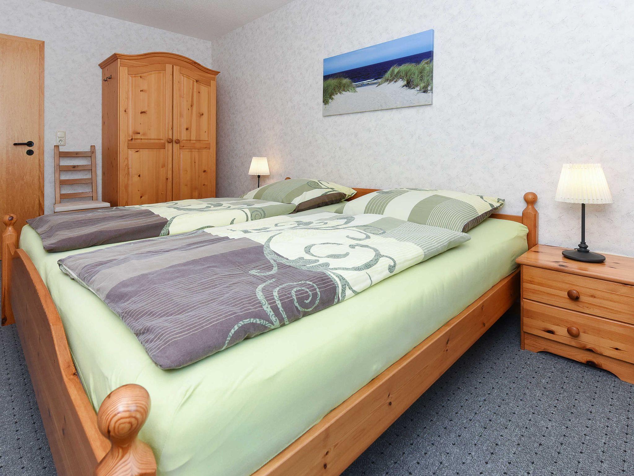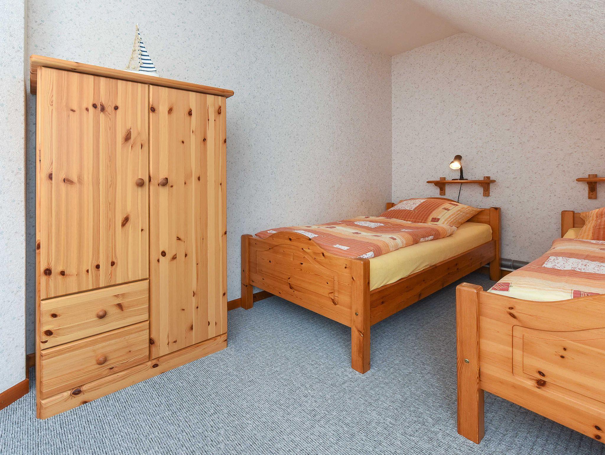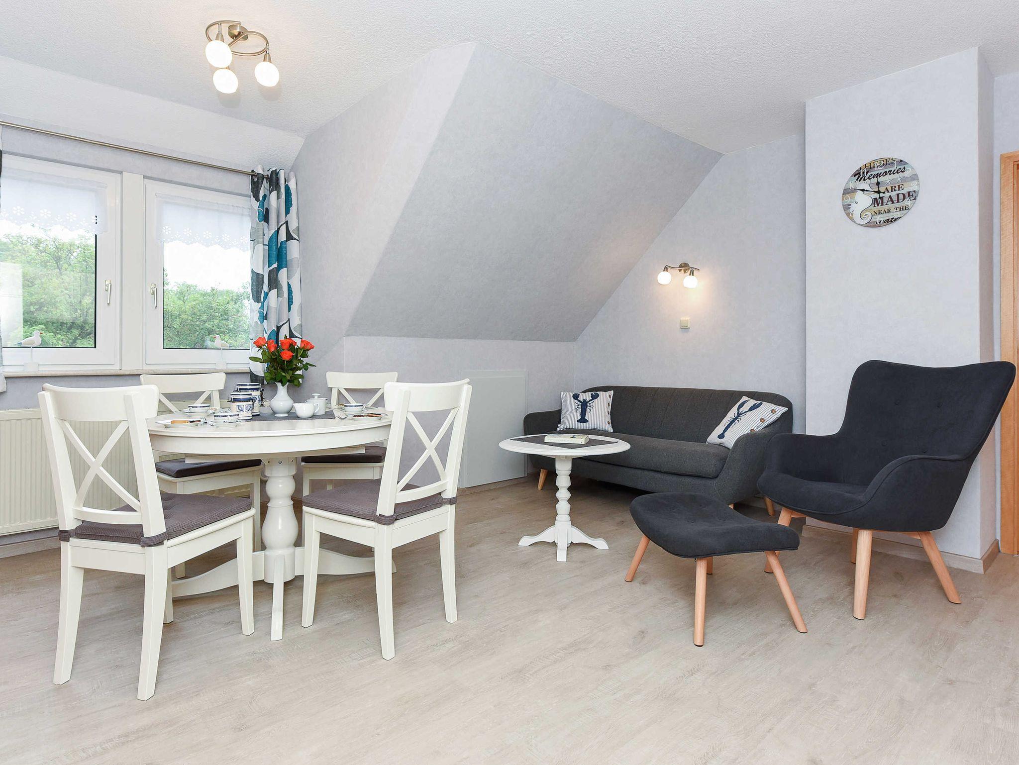 Größe ca. 60 Quadratmeter, Wohnraum mit integrierter Küche, Schlafzimmer, zweites separates Schlafzimmer, Badezimmer mit Dusche, Waschtisch und WC, Obergeschoss, Parkplatz (reserviert), optimal für 2 bis 4 Personen.