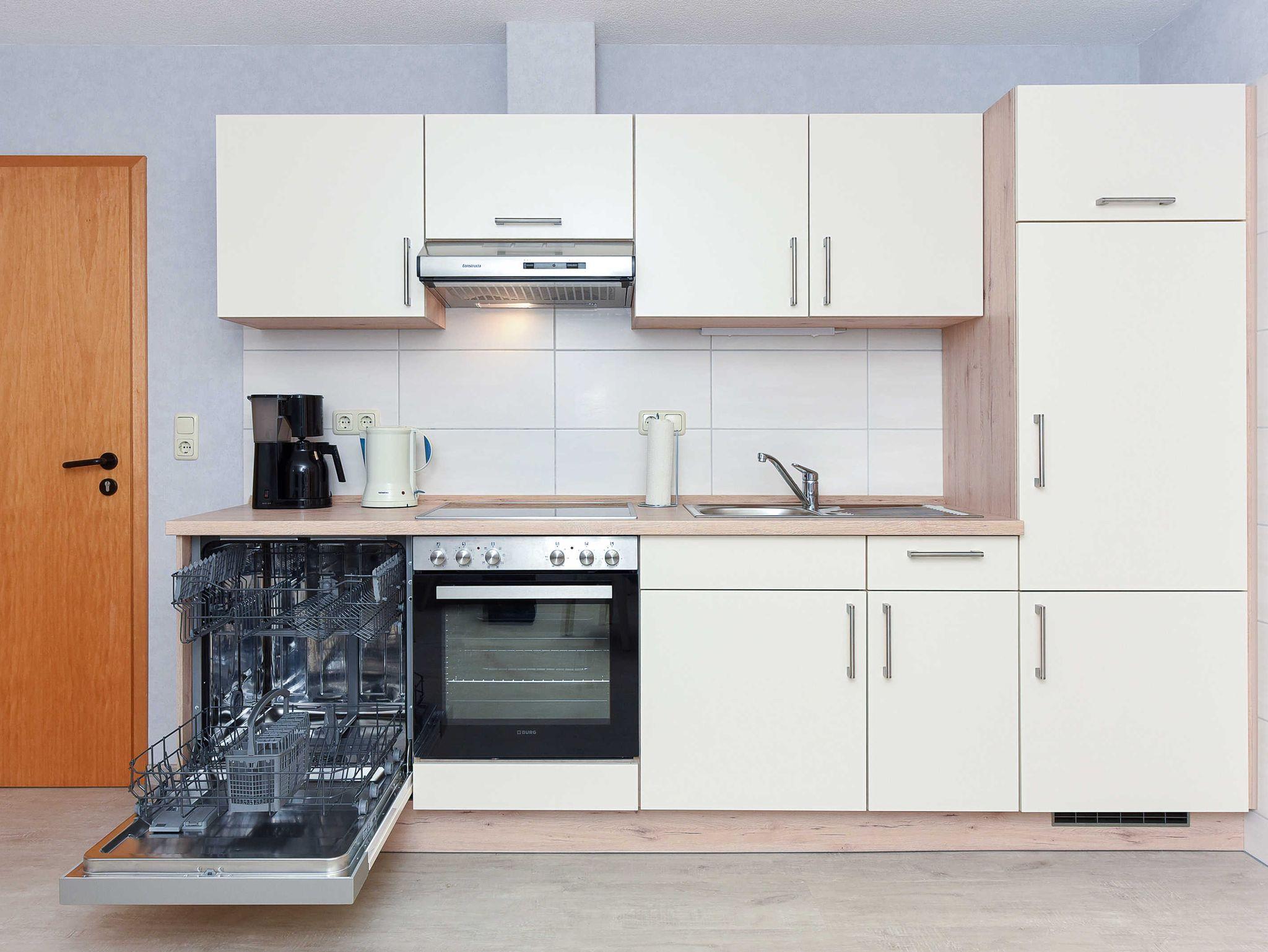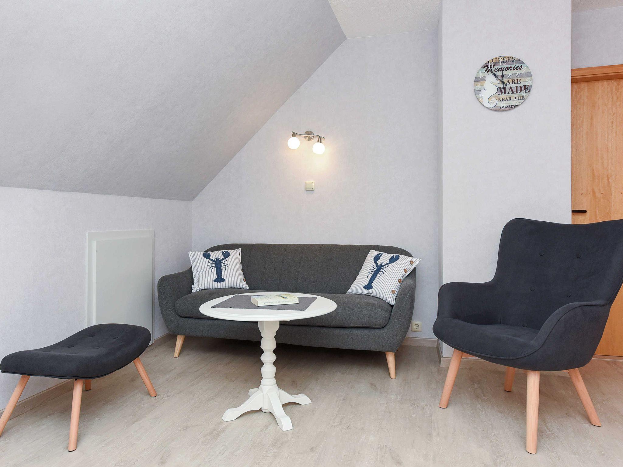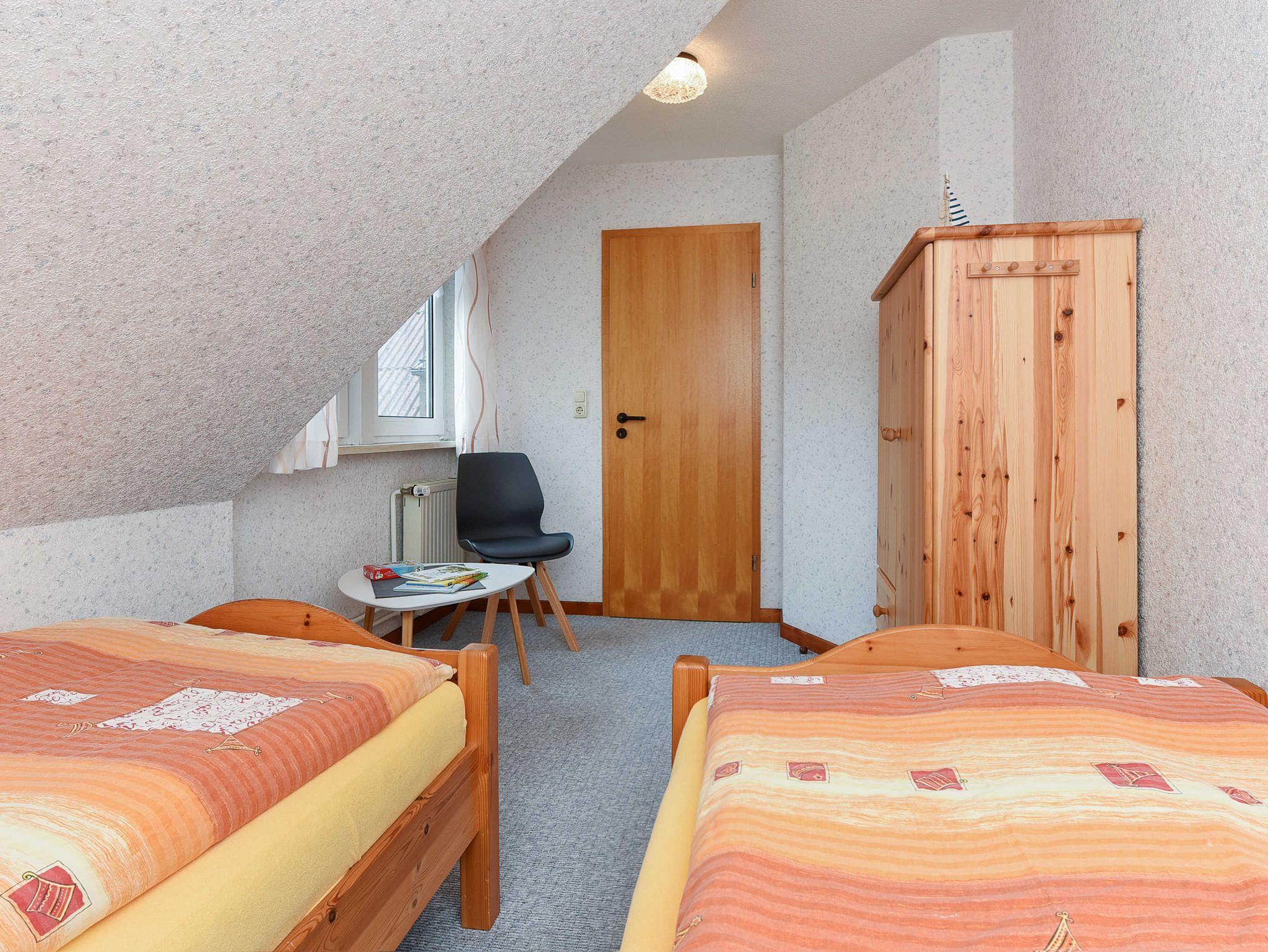 Größe ca. 60 Quadratmeter, Wohnraum mit integrierter Küche, Schlafzimmer, zweites separates Schlafzimmer, Badezimmer mit Dusche, Waschtisch und WC, Obergeschoss, Parkplatz (reserviert), optimal für 2 bis 4 Personen.