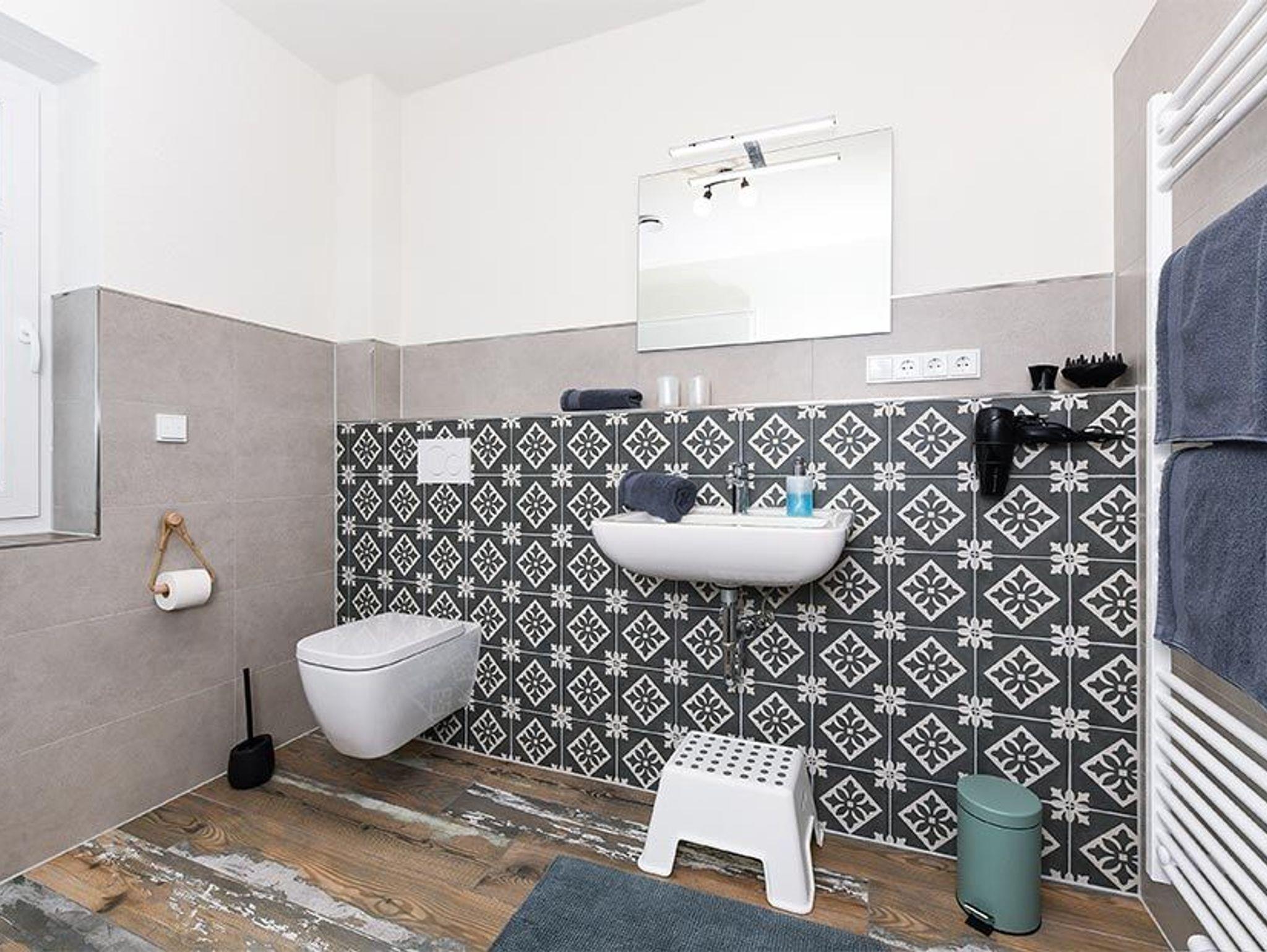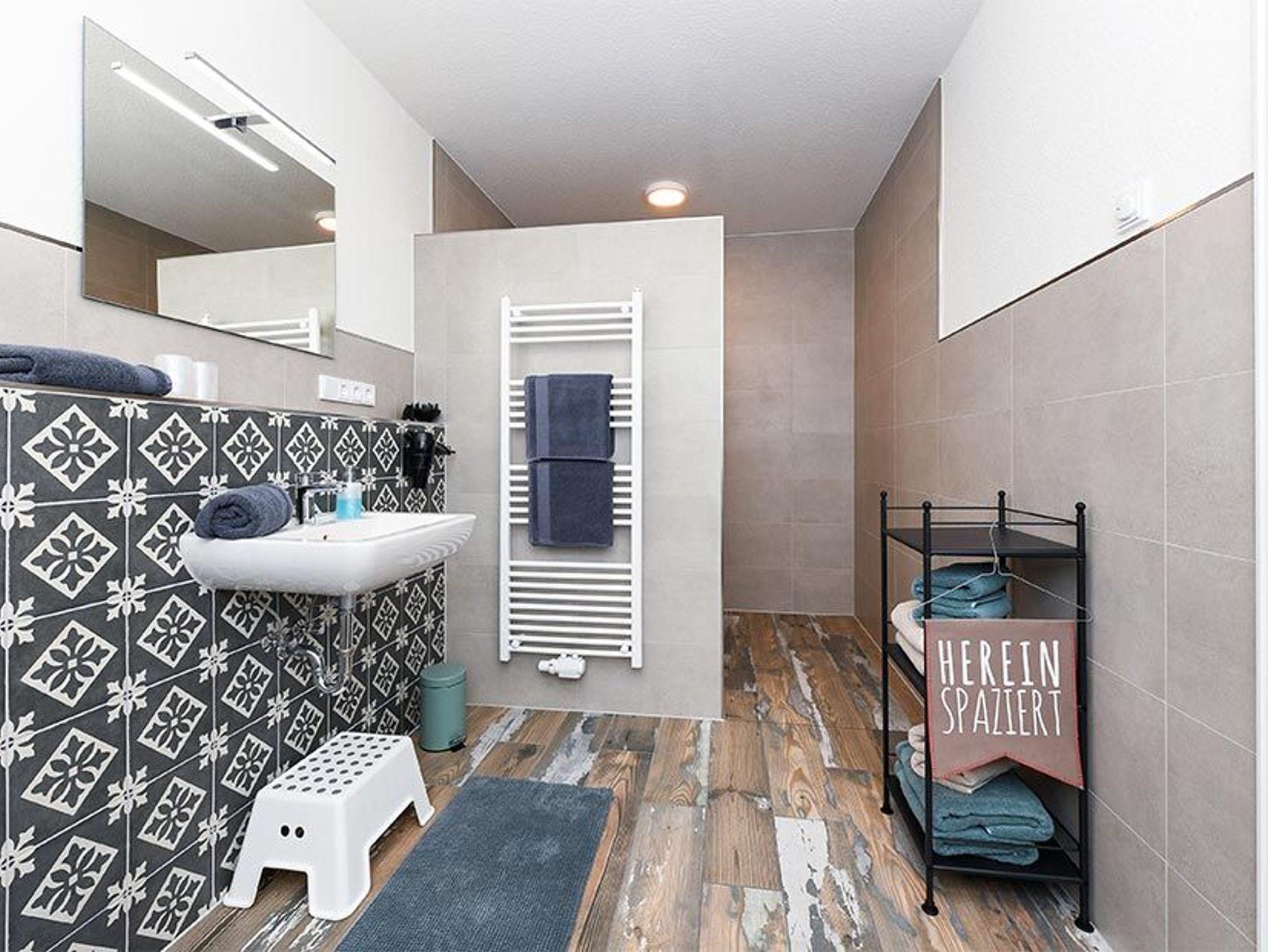 Größe ca. 120 Quadratmeter, Wohnraum mit integrierter Küche, Schlafzimmer, zweites separates Schlafzimmer/Kinderzimmer, drittes separates Schlafzimmer/Kinderzimmer, Badezimmer mit Dusche, Waschtisch und WC, zweites Badezimmer mit Dusche, Waschtisch und WC, Erdgeschoss, Obergeschoss, behindertenfreundlich, rollstuhlfreundlich, optimal für 2 bis 6 Personen.